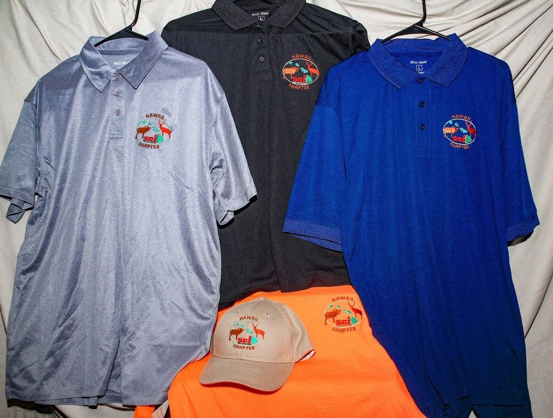 Set of (1) SCI Hawaii Chapter Tee shirt with embroidered logo, safety orange dri-fit shirt (1), tan colored baseball cap (1)with embroiderd SCI Hawaii Chapter logo.