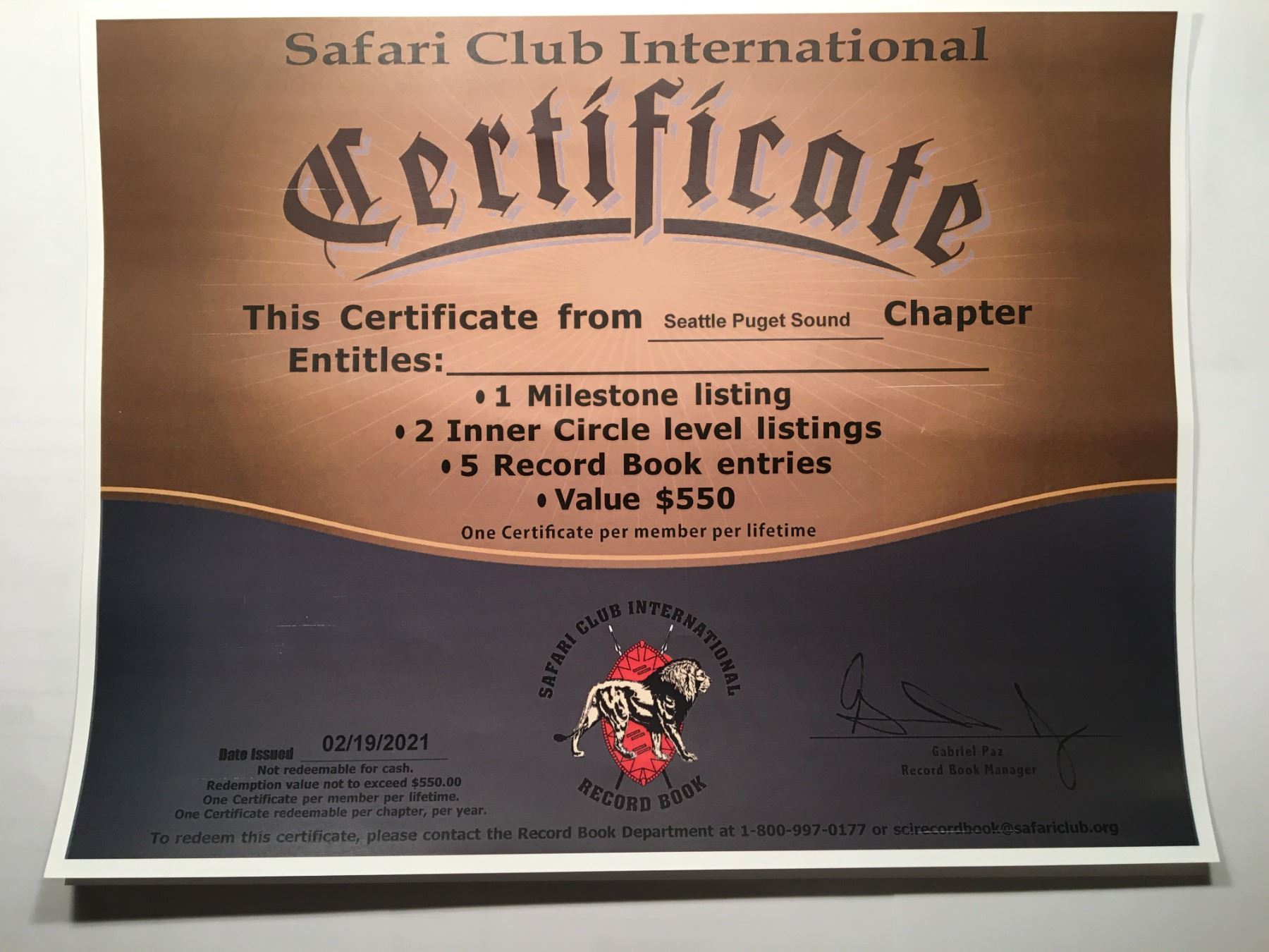 Neither Safari Club International or the Seattle Puget Sound Chapter of Safari Club International, (SPSC-SCI) nor, Seattle Sportsmen’s Conservation Foundation (SSCF), makes any warranty or representation, expressed or implied, regarding the information announced in connection with trips or items offered at auction. The agreement shall be construed to be an agreement between the bidder and the donor. To protect our hunt donors, all groups reserve the right to withdraw or buyback any donated hunt from the auction that does NOT receive the minimum of 50% of its stated value. If the Auction Chairman deems that it is necessary, the hunt may be offered to the last highest bidder at 50% of its stated value before determining if a buyback is necessary. If the last highest bidder rejects this offer, the hunt may be withdrawn or considered a no-sale or buyback and sold at a later time, if at all. All sales are final with NO refunds or exchanges unless otherwise stipulated. SPSC-SCI, & SSCF retains the right to refund the purchase price, at its option, for any or all liability, if any may accrue or for which claims may be made.