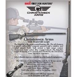 *The Ridgeline is the quintessential hunting rifle. The rifle features a sporter carbon fiber composite gun stock and a stainless steel radial muzzle brake built around a light target contour Christenson Arms carbon fiber wrapped barrel. * The Ridgeline weights in starting at 6.3 pounds and is backed by the Christenson Arms Sub-MOA Guarantee. * The Christenson Arms Ridgeline with Burnt Bronze accent is a carbon fiber barrel, Chambered in 300 win mag and topped it with a Swarovski Rifle Z5 Scope 2.4-12x50 with Talley one piece bases and rings. * Total value of this retail of this package $3,423.00 * Limited edition with 50th Logo engraved on the floorplate of the rifle. *Contact MECo, Inc for the FFL Pickup Alan McClain 325-656-3512