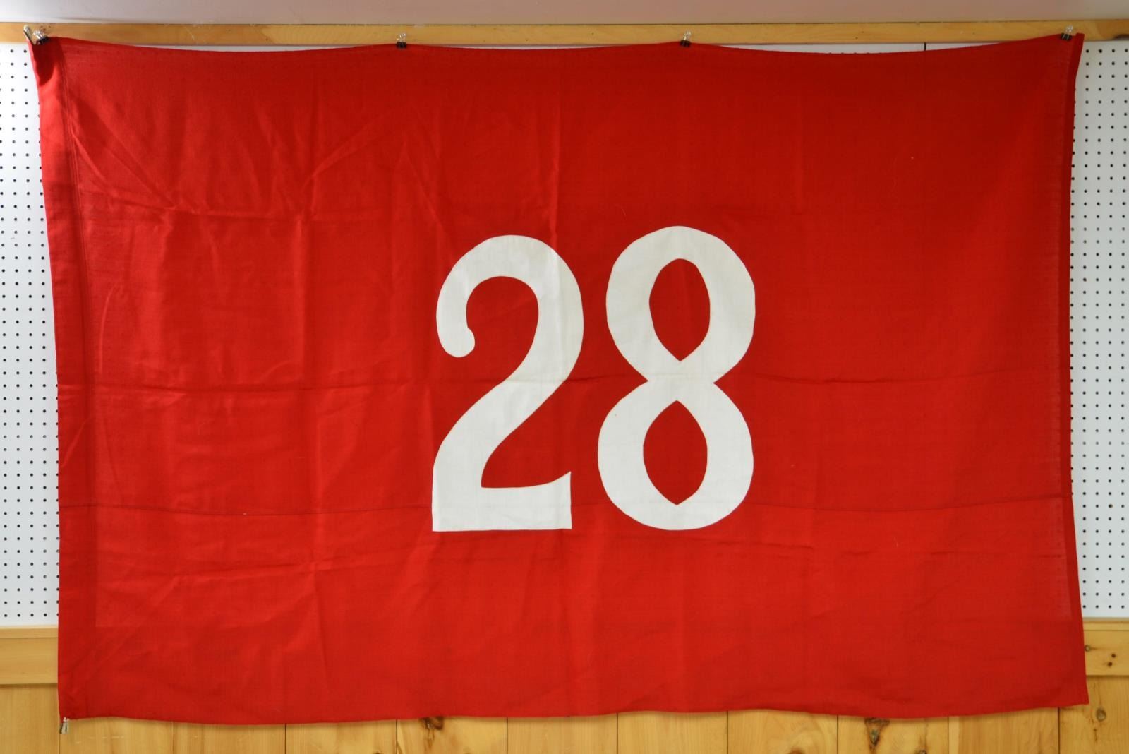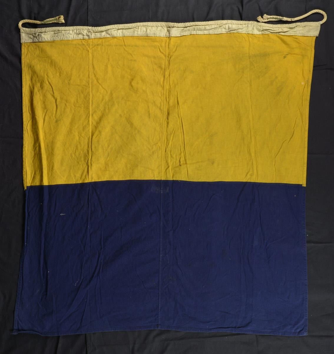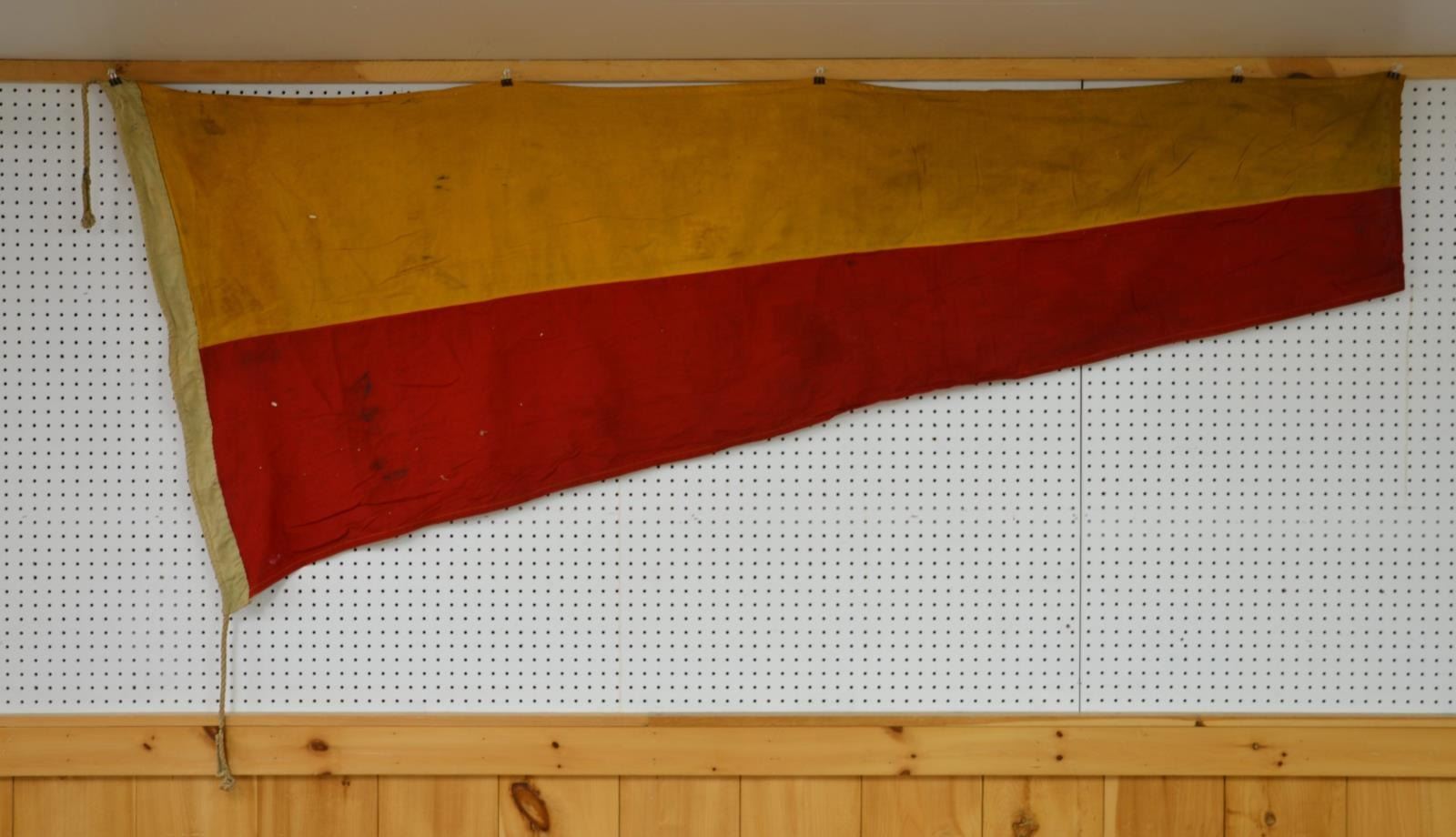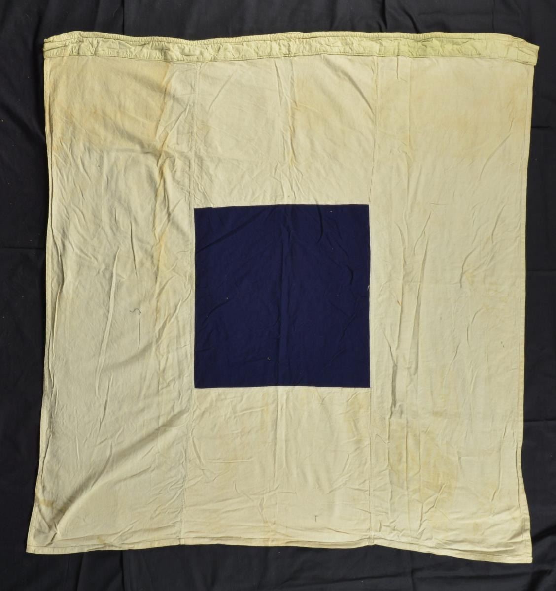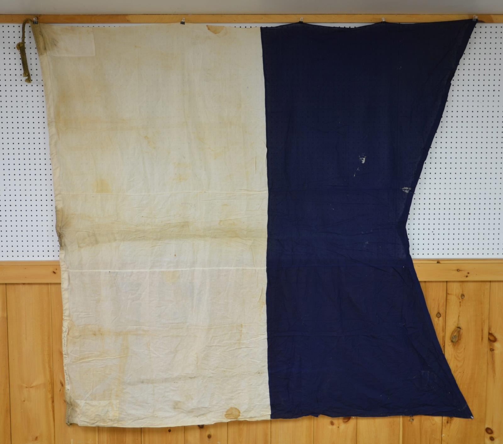 FLAGS. One flag is marked on hoist “MARE ISLAND JUNE 1943” and another “A LPHA SET 3 SFGM SEPT 1944”. Unknown large Double applique white cotton “58” on red bunting field. Flags range from about 3’ to 8’. CONDITION: fair-good overall, several heavily soiled and stained, reductions. (02-17547-75/JS). $100-200.