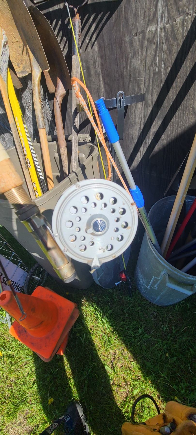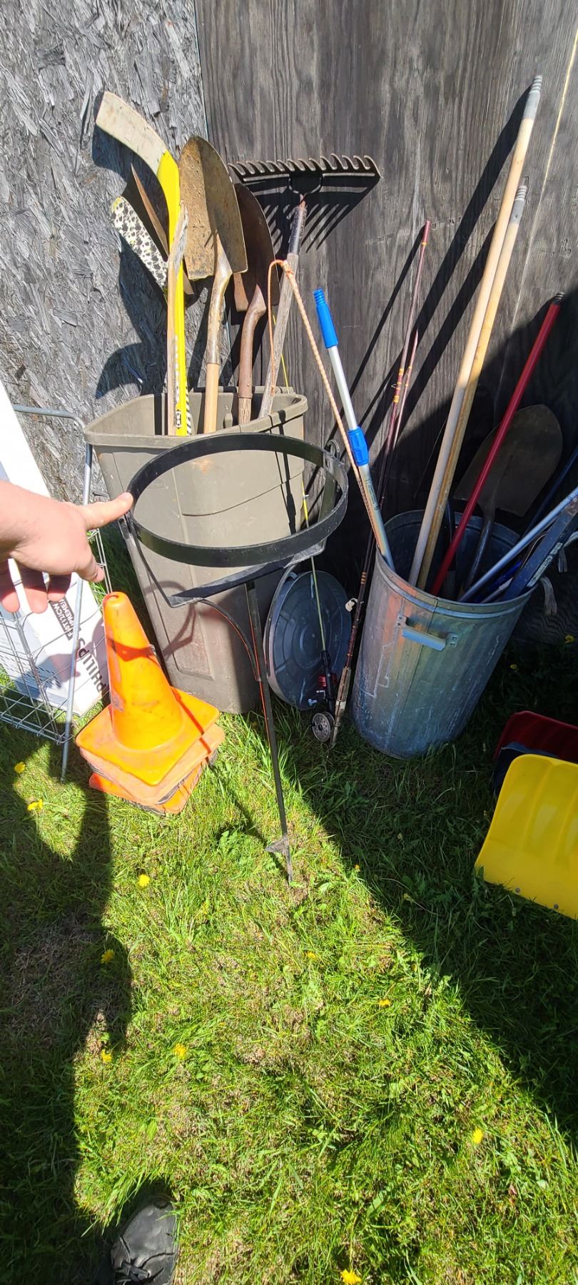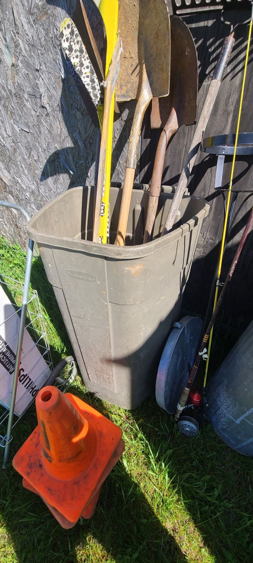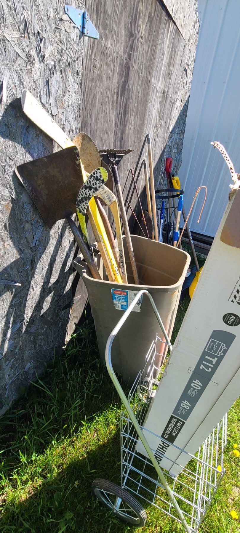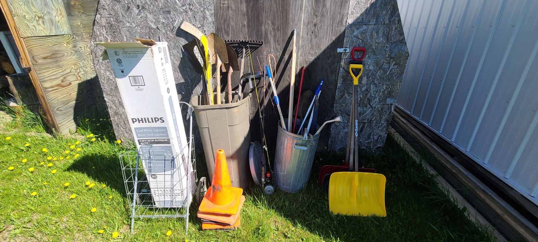 SHAKESPEARE FLY FISHING ROD. LOT OF SHOVELS AND SNOW SHOVELS / PRY BAR / CROW BARS / 23 PHILIPS T12 40 W 48" LIGHT BULBS / TRAFFIC CONES