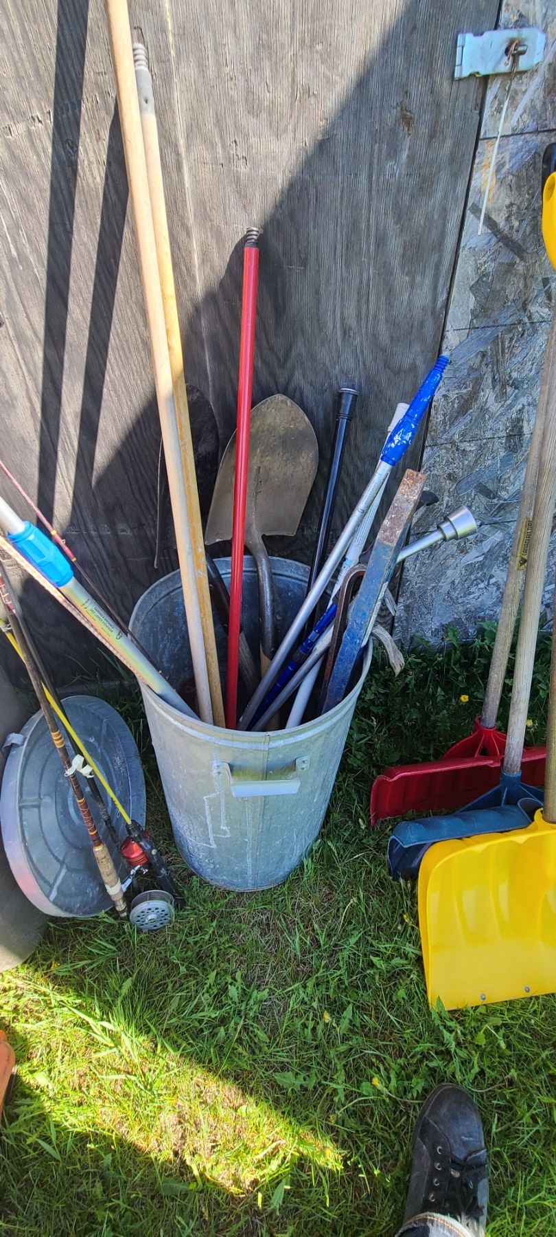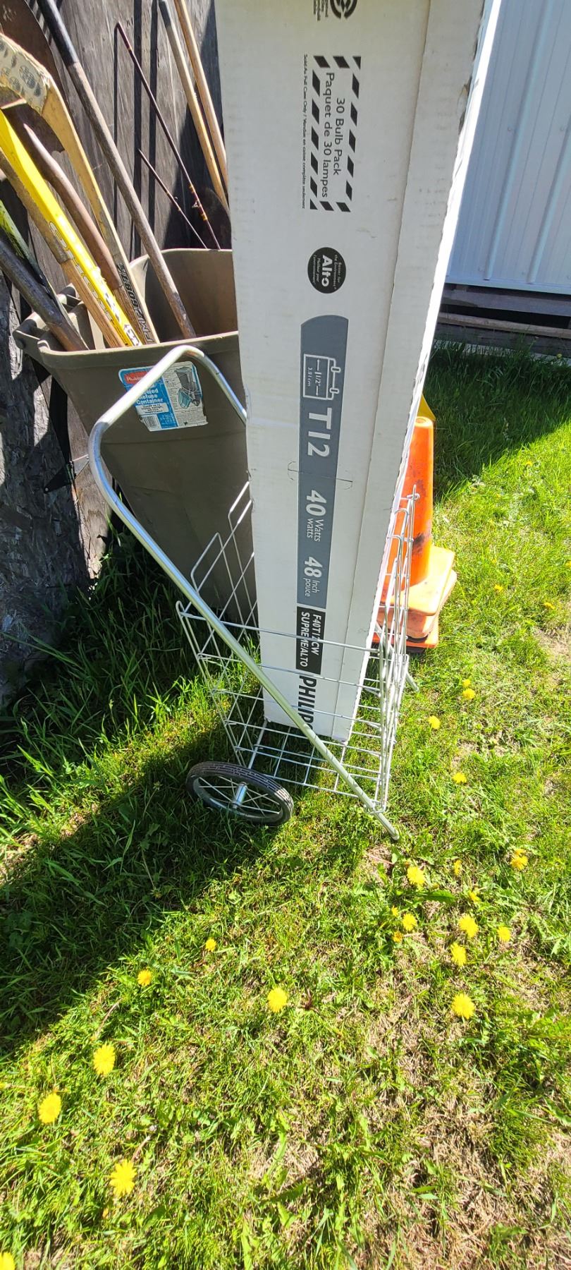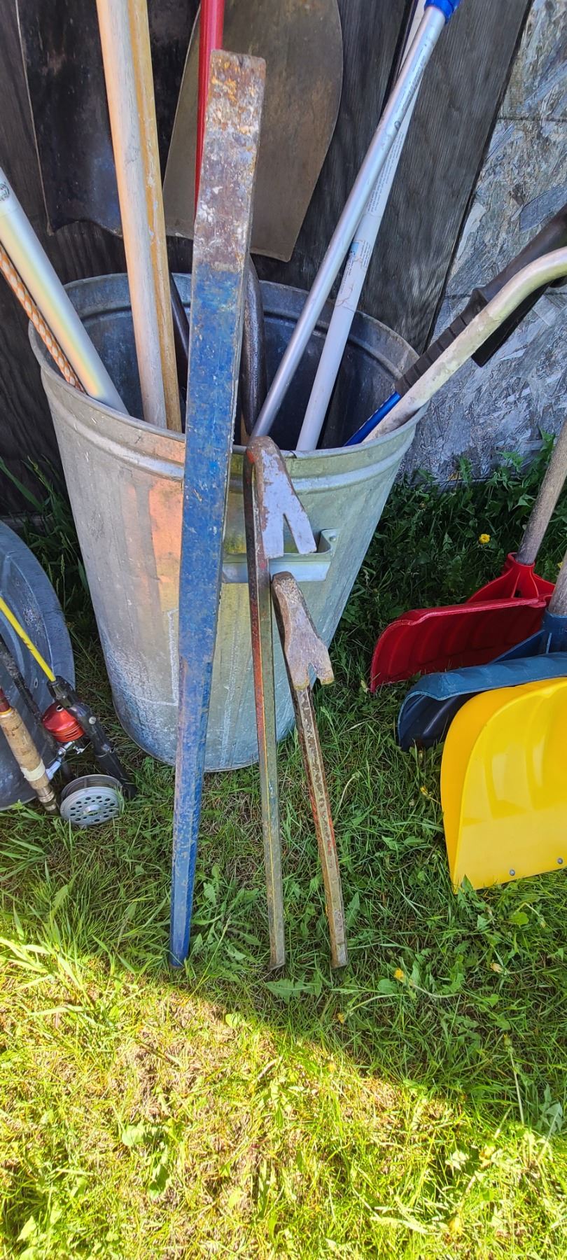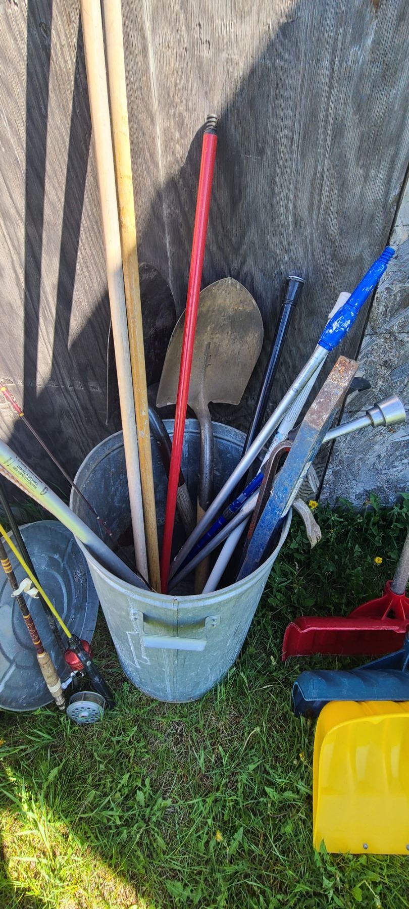 SHAKESPEARE FLY FISHING ROD. LOT OF SHOVELS AND SNOW SHOVELS / PRY BAR / CROW BARS / 23 PHILIPS T12 40 W 48" LIGHT BULBS / TRAFFIC CONES