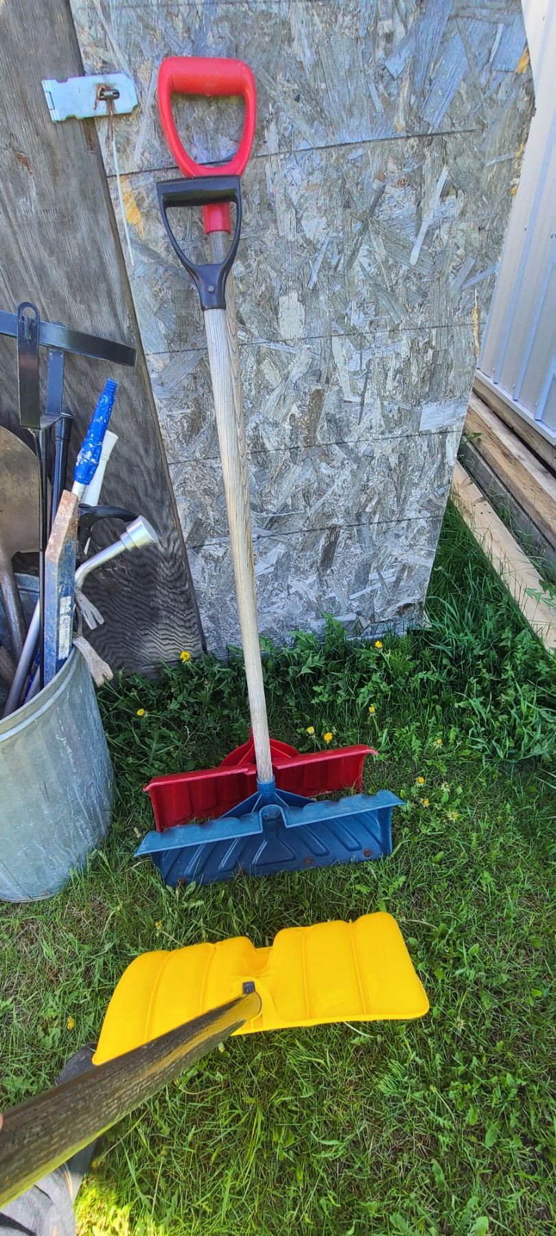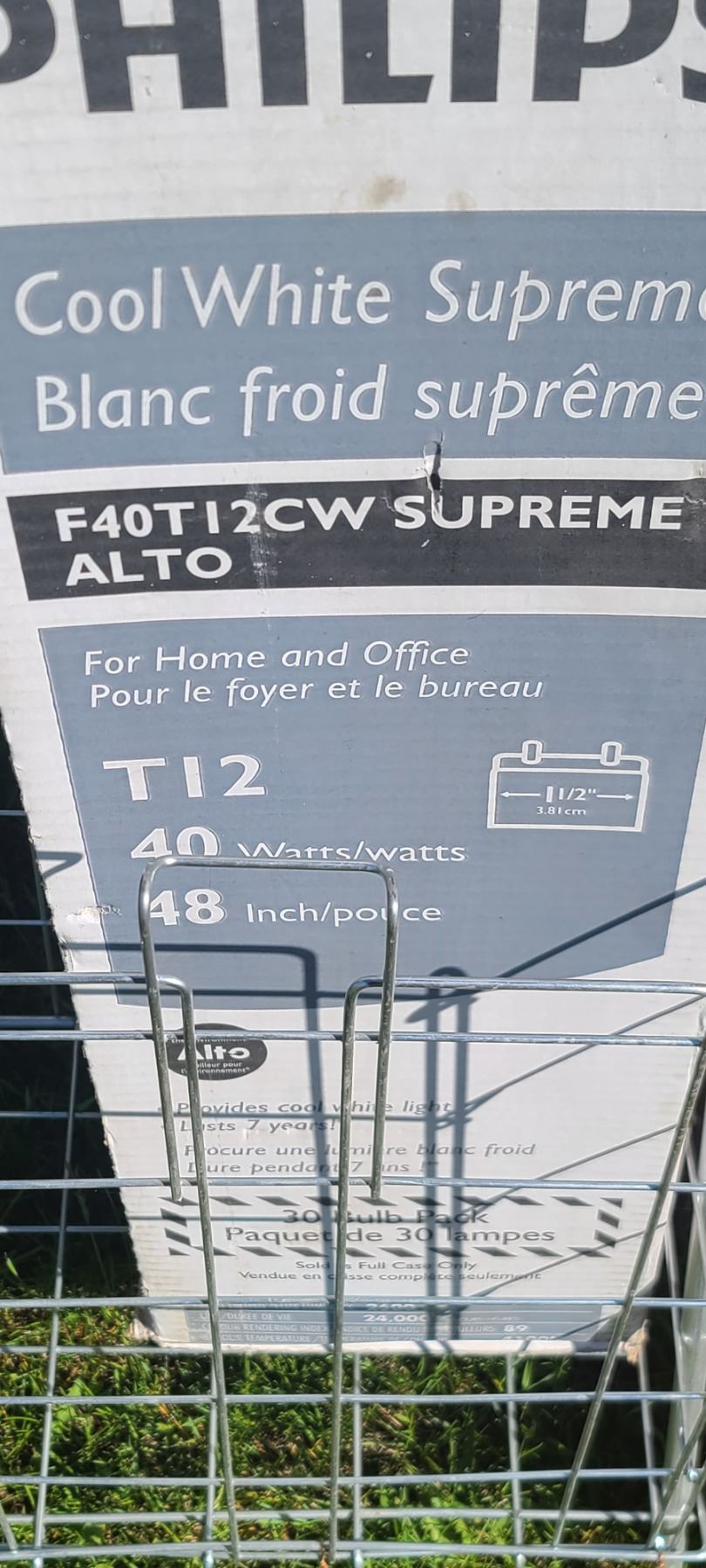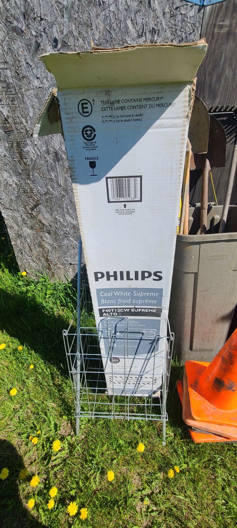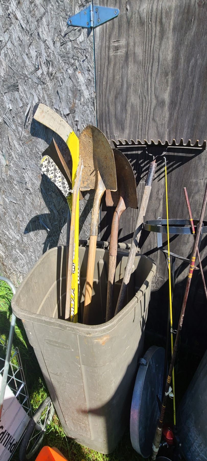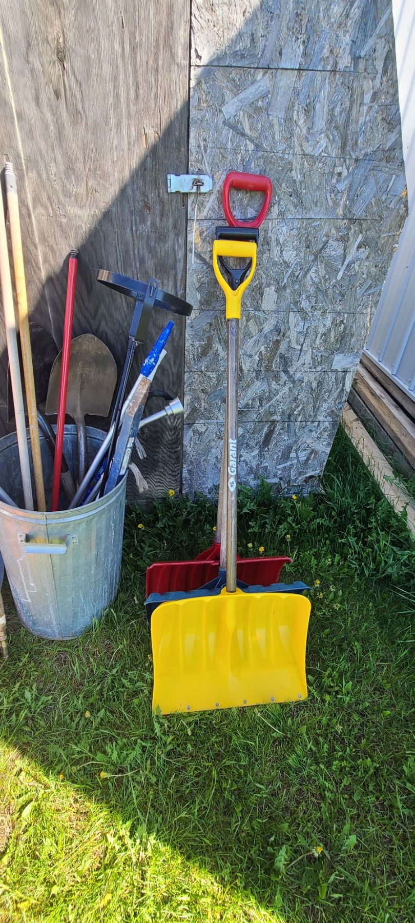 SHAKESPEARE FLY FISHING ROD. LOT OF SHOVELS AND SNOW SHOVELS / PRY BAR / CROW BARS / 23 PHILIPS T12 40 W 48" LIGHT BULBS / TRAFFIC CONES