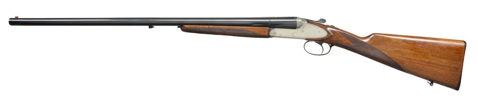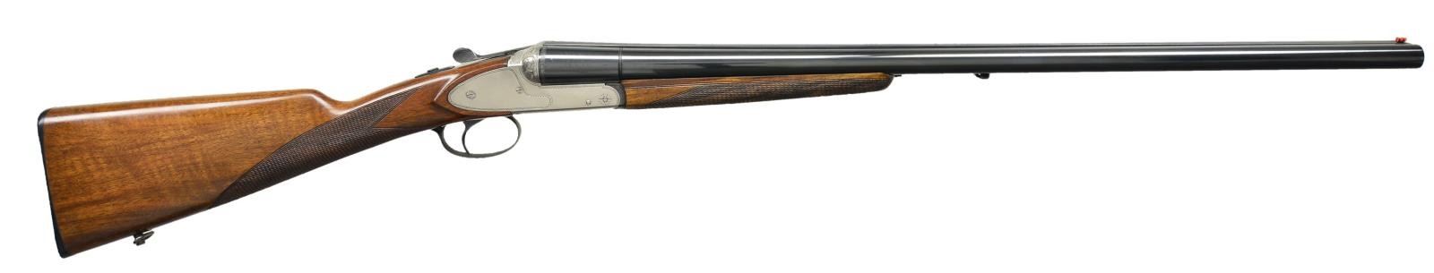 GAME GUN BY EDUARD KETTNER. Cal. 12 Ga., 2 3/4". S# 66795. The 27 3/4" Mono-Bloc barrels choked Mod & Full are fitted with full length matted rib. Maker's name & address are on left side of Mono-Bloc. Barrel flats stamped w/ 1987 Italian nitro proofs. Coin finished sideplated boxlock action features non automatic safety & non selective single trigger. Action & sideplates have geometric borders, fences are nicely scroll engraved. Trigger & top lever are blued. Lightly figured European walnut, straight grip buttstock measures 14" over a hard rubber buttplate. Grip is checkered & sling loops installed. Matching wide splinter ejector forend has Anson type release. MEASUREMENTS: STOCK: DAH: 2 1/16". DAC: 1 1/2". CAST: neutral. LOP: 14". WEIGHT: 7 lb. 8 oz. UNATTACHED ACCESSORIES: black plastic case. CONDITION: extra fine, close to "as new" with only a few minor marks on metal & light scratches on wood, mostly left side of butt. Bright shiny bores, mechanically good. PROVENANCE: "Save the Fine Guns". T&G German Gun Imports, bringing fine German guns to a more appreciative market. (22-5138/MGM). MODERN. $800-1,200.