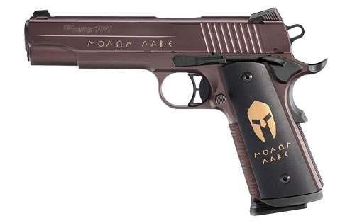 FAMILY:1911 Style Pistol Series MODEL:1911 Spartan TYPE:Semi-Auto Pistol ACTION:Single Action FINISH:Oil Rubbed Bronze STOCK/FRAME:Steel Frame STOCK/GRIPS:Hogue Spartan Grips WEIGHT:41.6 oz. CALIBER/GAUGE:45 ACP CAPACITY:8+1 # OF MAGS:2 MAGAZINE DESC:8 rd. BARREL:5" OVERALL LENGTH:8.7" SIGHTS:Low Profile Night Sights SAFETY:Thumb and Grip Safety ADDL INFO:Molon Labe Engraved Slide ADDL INFO:"Come and Take Them" ADDL INFO:24kt Gold Inlay Engraving