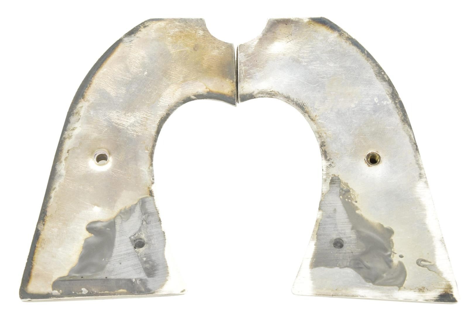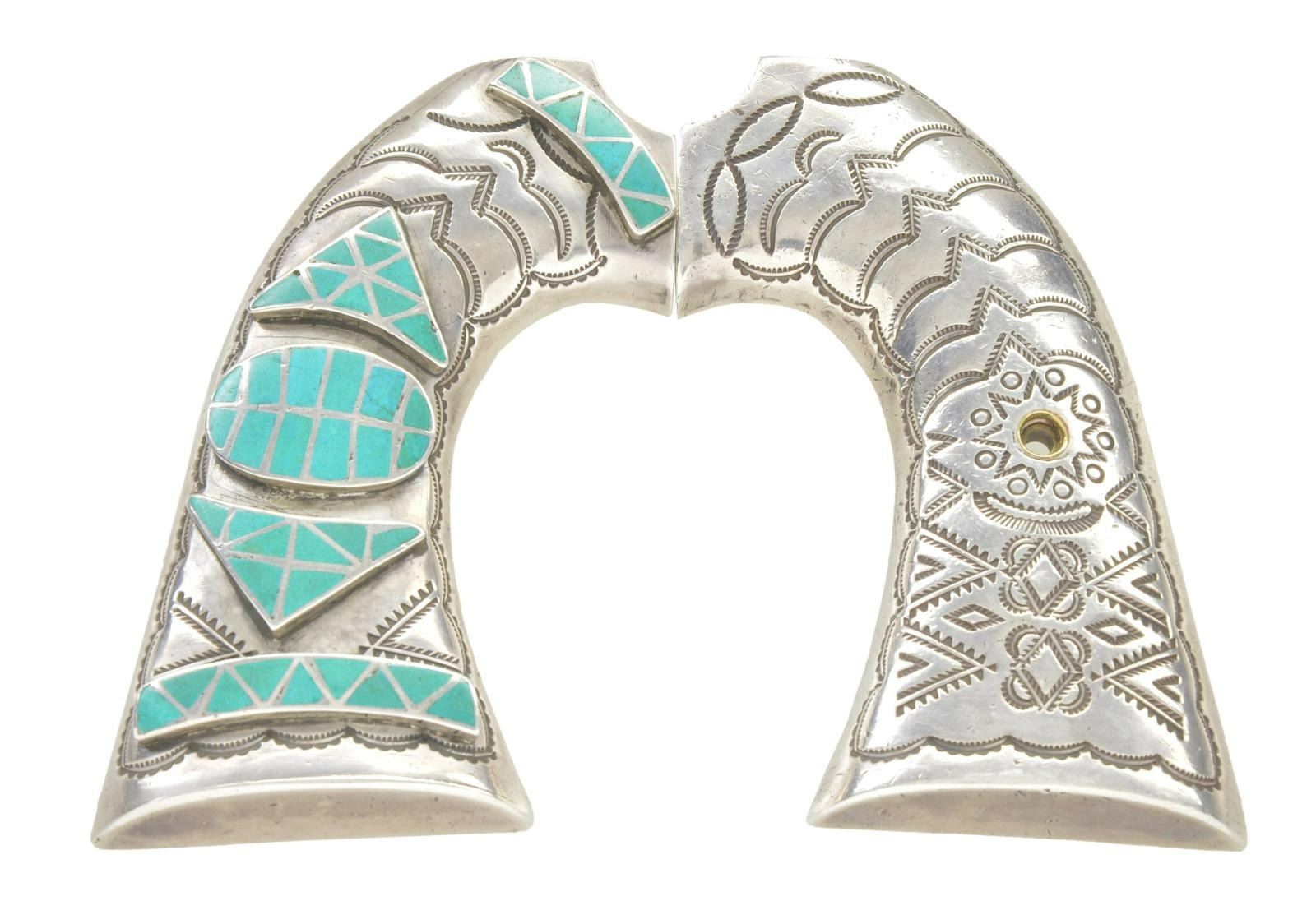 GRIPS FOR A COLT BISLEY SINGLE ACTION ARMY REVOLVER. These attractive early 20th century grips are for a Colt Bisley revolver and feature Native American motifs. They are solid silver with one having incised geometric motifs and the other having similar incised motifs along with 5 turquoise inlaid geometric forms. CONDITION: grips show light wear with expected tarnish on the silver. The turquoise inlays are complete and totally undamaged. (02-19454/BF). $400-600.