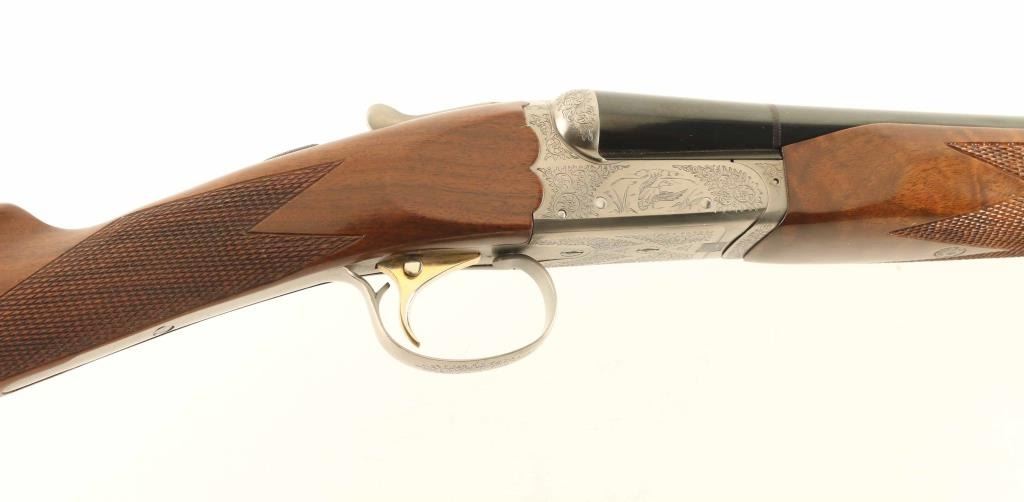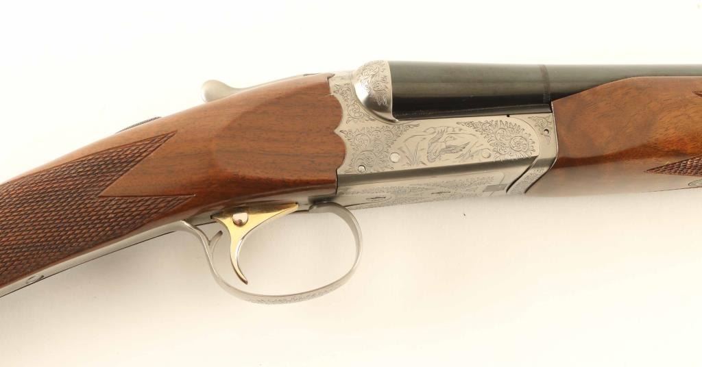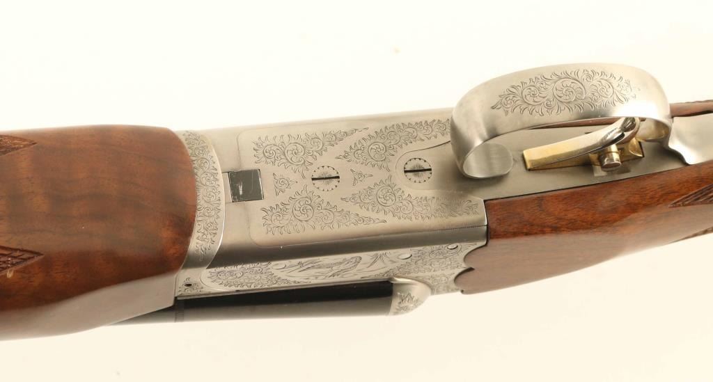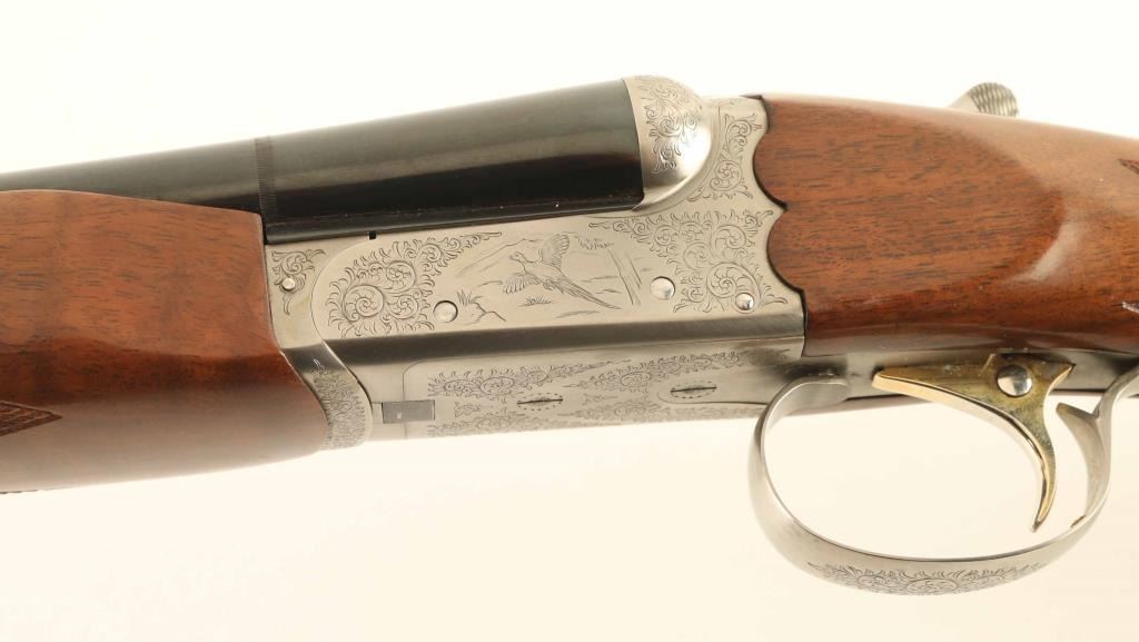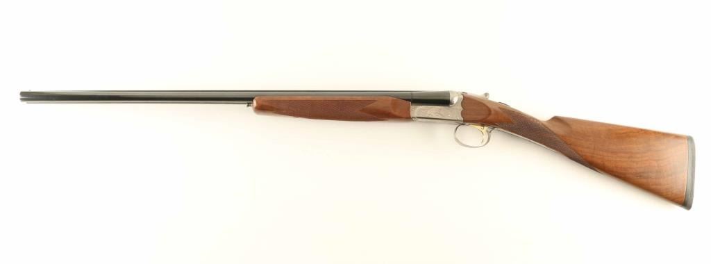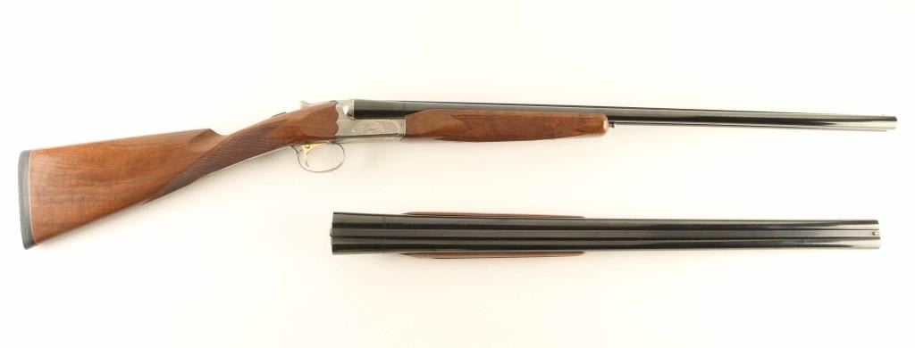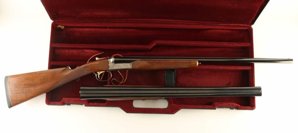 SN: NS41543 Japanese Side by Side shotgun imported by New SKB Arms Company.. Features blued barrels, coin finished action, selective auto ejectors, single inertial trigger with barrel selector button, boxlock action, tang safety, wood butt with straight checkered grip, solid rubber butt pad, all wood is nicely figured walnut. As installed (28 GA): wide beavertail wood forend with checkered panel, 26" barrels with solid rib, brass front bead, accepts choke tubes (IC left, MOD right are installed), accepts up to 2-3/4" shells. Bores are excellent. Retains 95% finish with some scuffs & scrapes. Action is excellent condition with majority coverage of floral scrolls, scenes of game birds. Stock is near excellent condition with several small dents and scratches. Approx stock measurements: 14" Length of Pull, 1-1/2" Drop at Comb, 2-7/8" Drop at Heel. Spare (20 GA) barrel set: wide beavertail wood forend with checkered panel, 26" barrels with solid rib, brass front bead, accepts choke tubes (MOD left, FULL right are installed), accepts up to 3" shells, 95% finish. Includes good condition hard plastic case with maroon velvet liner (lid lining needs re-glued), choke wrench, additional chokes: (2) MOD, (2) SKT in 28 GA, (1) FULL, (2) IMP, (1) IC, (2) SK, (1) SKII in 20 GA. Condition is NRA Excellent *** Modern Firearm ***