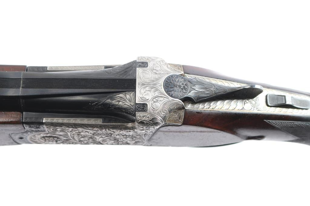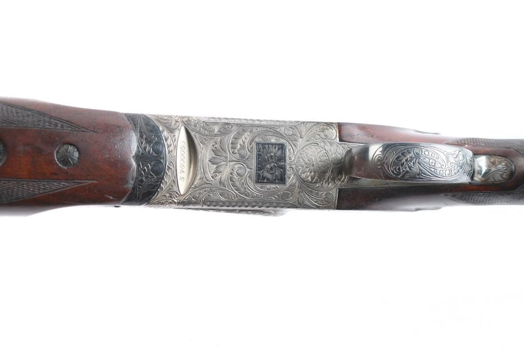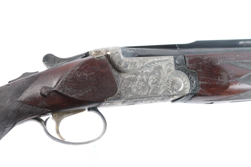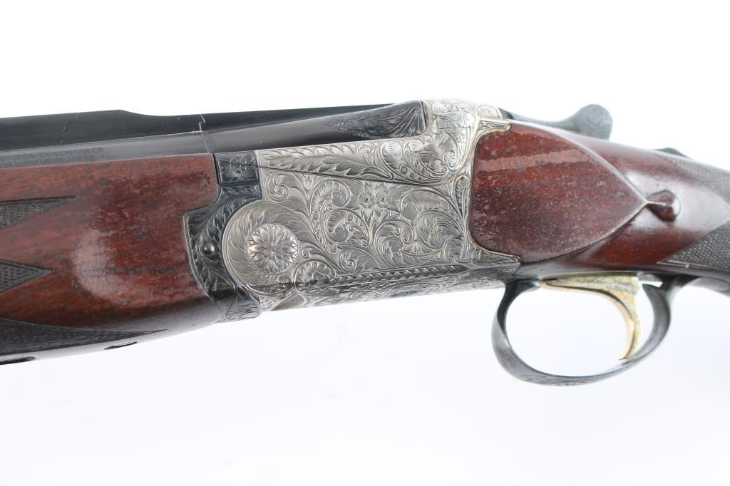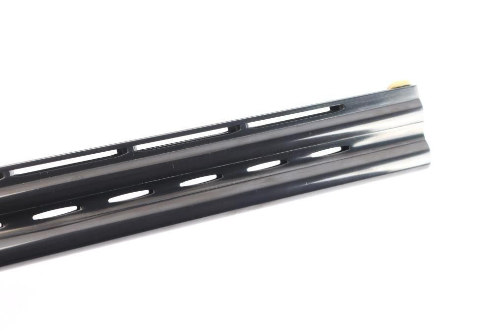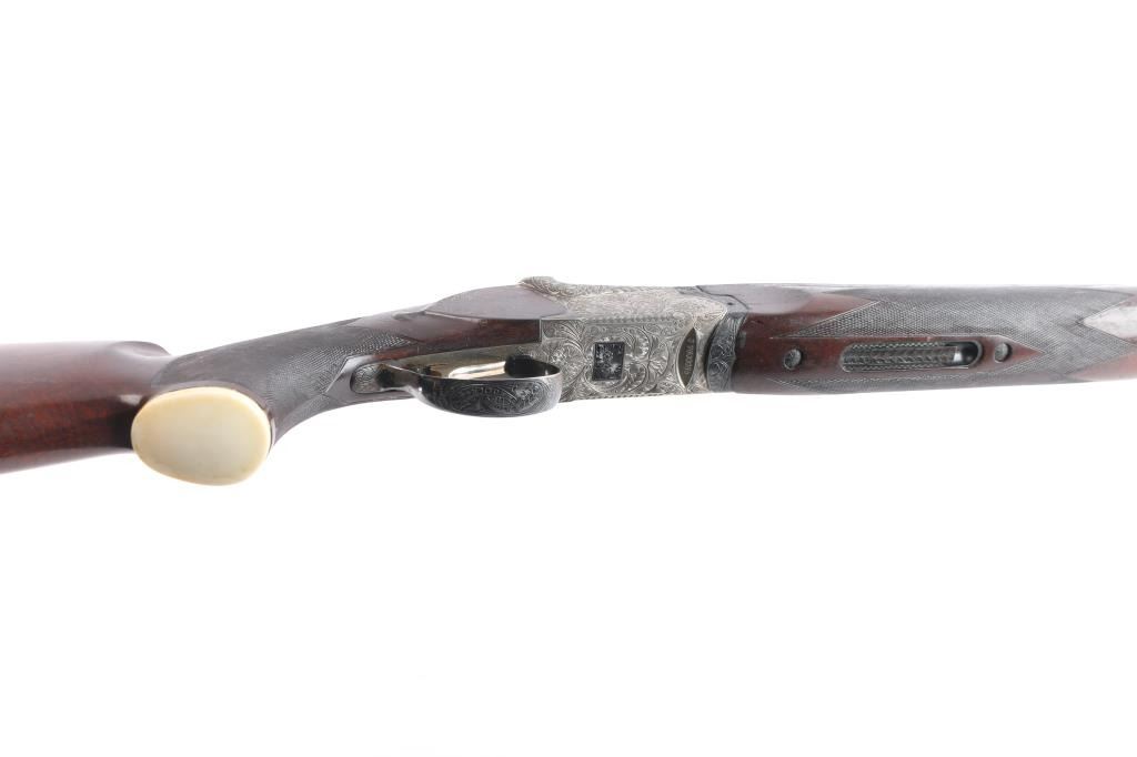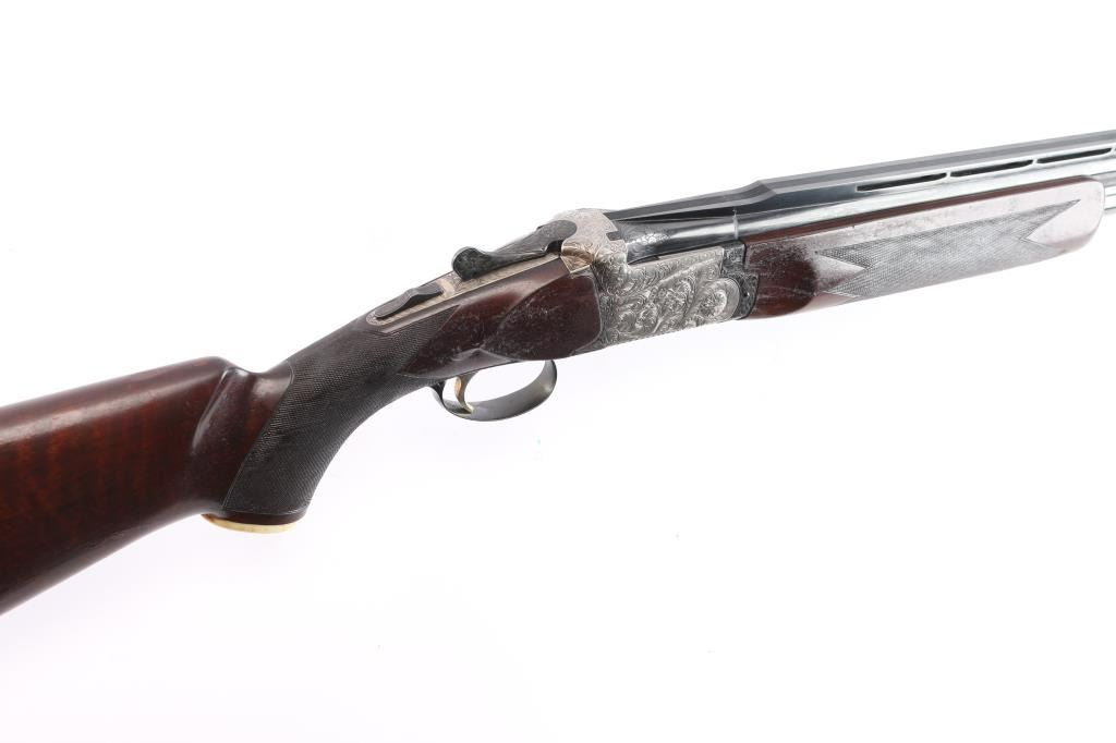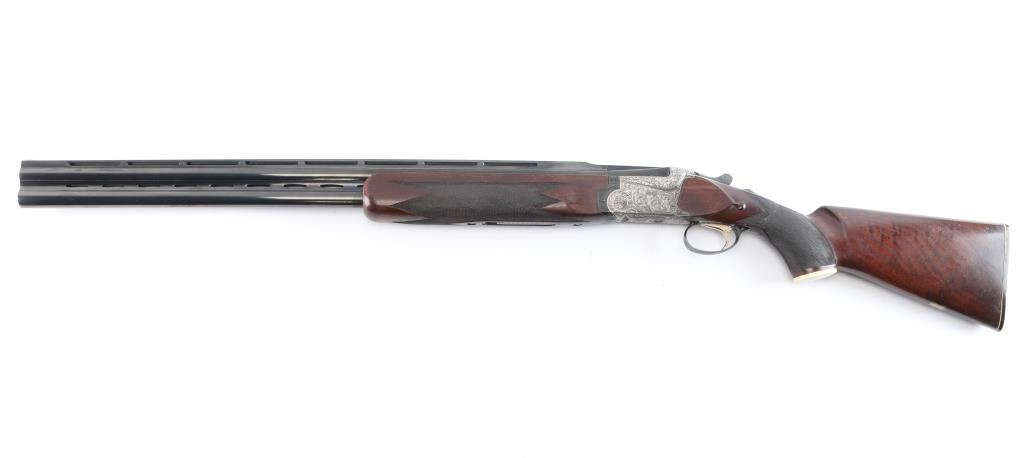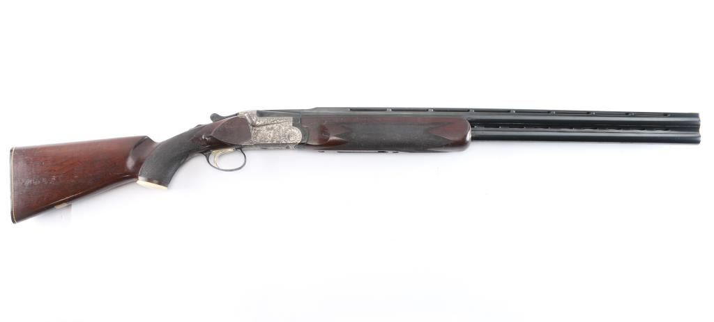 SKB Model 5800 Trap. Manufactured in Japan by SKB Arms circa 1980-81. Top Break Boxlock Over Under, Single Non-Selective Mechanical Trigger, Ejectors, 28" vent rib blued barrels, white rounded blade at the muzzle and a mid length small steel bead, chokes measure CYL. The entire surface of the coin receiver, the trigger guard, the forend bracket and the rear of the top barrel are covered in deep, lavish hand scroll and floral engraving. Nicely figured semi-beavertail fore stock, pistol grip shoulder stock with fine checkered panels, white grip cap, factory buttplate. The bores are excellent/bright, barrels lock-up tight, blue is about 94% with minor scratches and some handling wear on the triggerguard, the wood is overall very good sound with some streaks of dried varnish, should clean up. LOP-13 1/4".