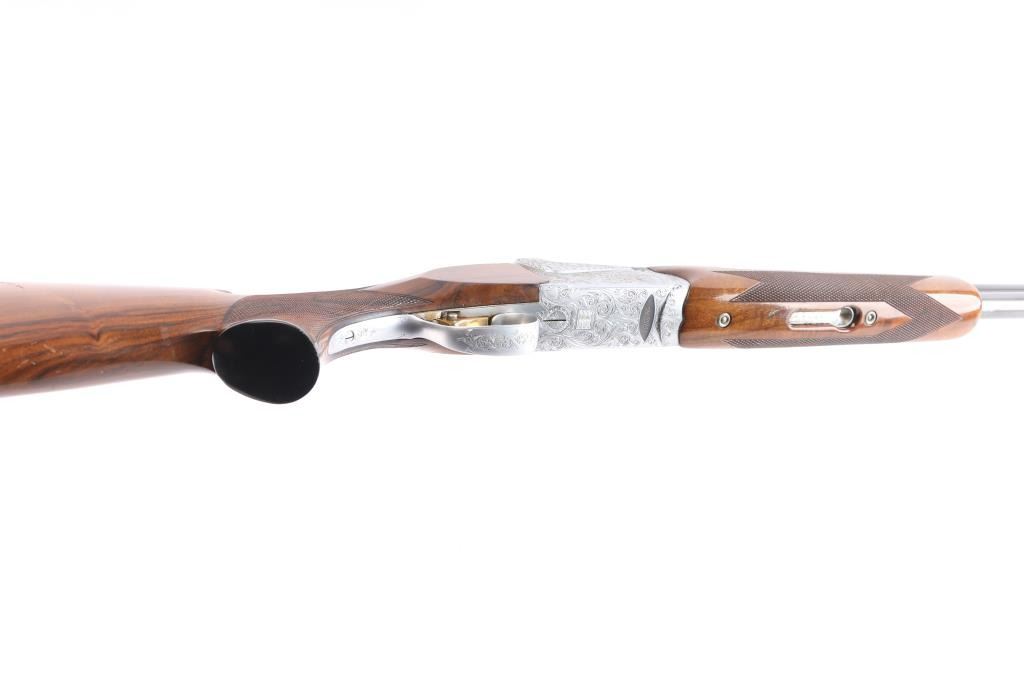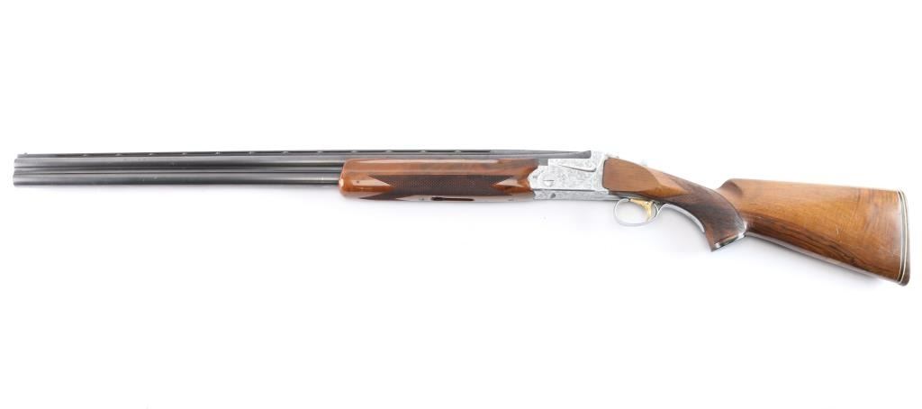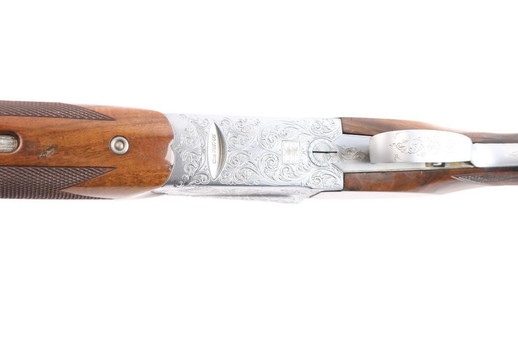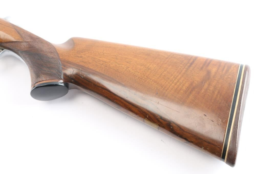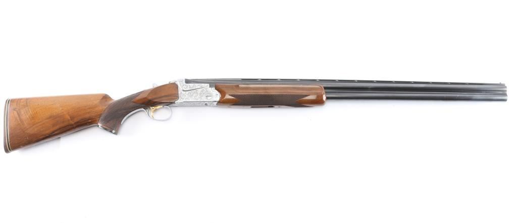 High quality over/under double barrel shotgun chambered for 2 3/4" 12 gauge shells, produced in Japan by SKB. Features blued 30" barrels with a raised ventilated top rib, fixed chokes marked 'Full', but measure CYL, automatic ejectors, brass bead front sight, silver bead mid-sight, scroll engraved receiver with silver plated finish, serrated single gold trigger with barrel selector, sliding tang safety, checkered semi-beavertail walnut forend and pistol grip shoulder stock with black grip cap & White-Line recoil pad. Barrels retain approximately 92% blue finish, with scratches and light muzzle wear, there is some patches of scattered light pitting on the lower end. The silver plated receiver retains its original finish. Action is crisp, bores are pristine and wood stocks are very good with a few small blemishes. Brass initial plate in buttstock. Mechanically excellent. Consigner purchased this shotgun in Japan.