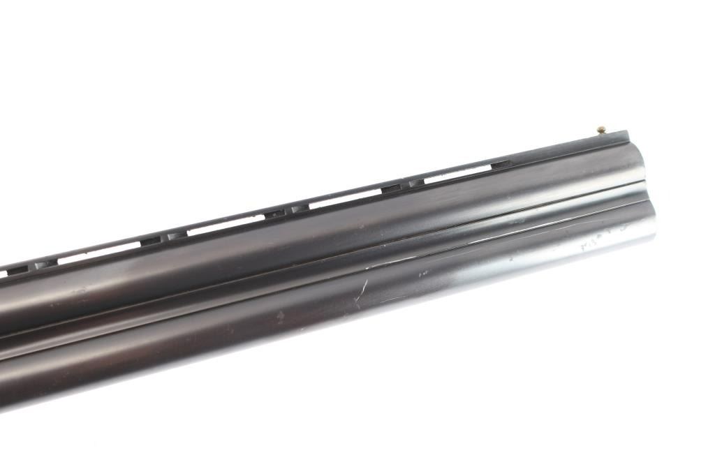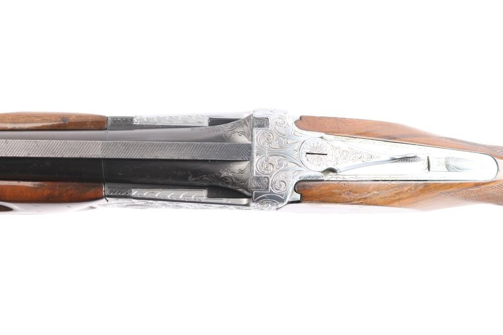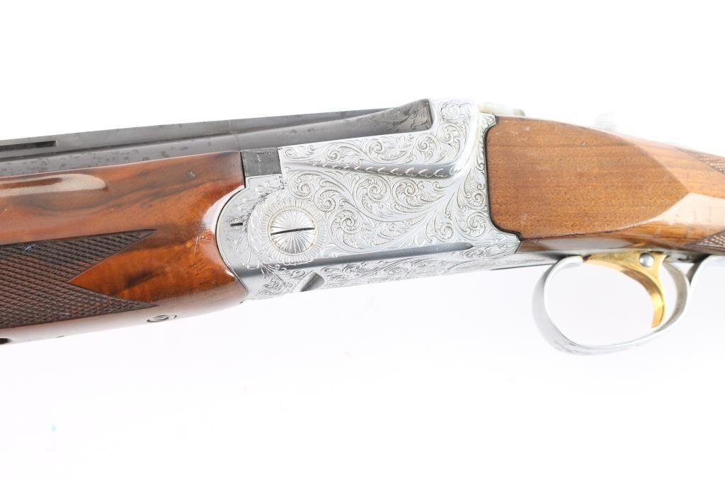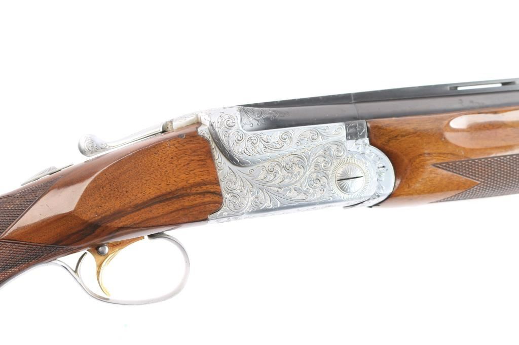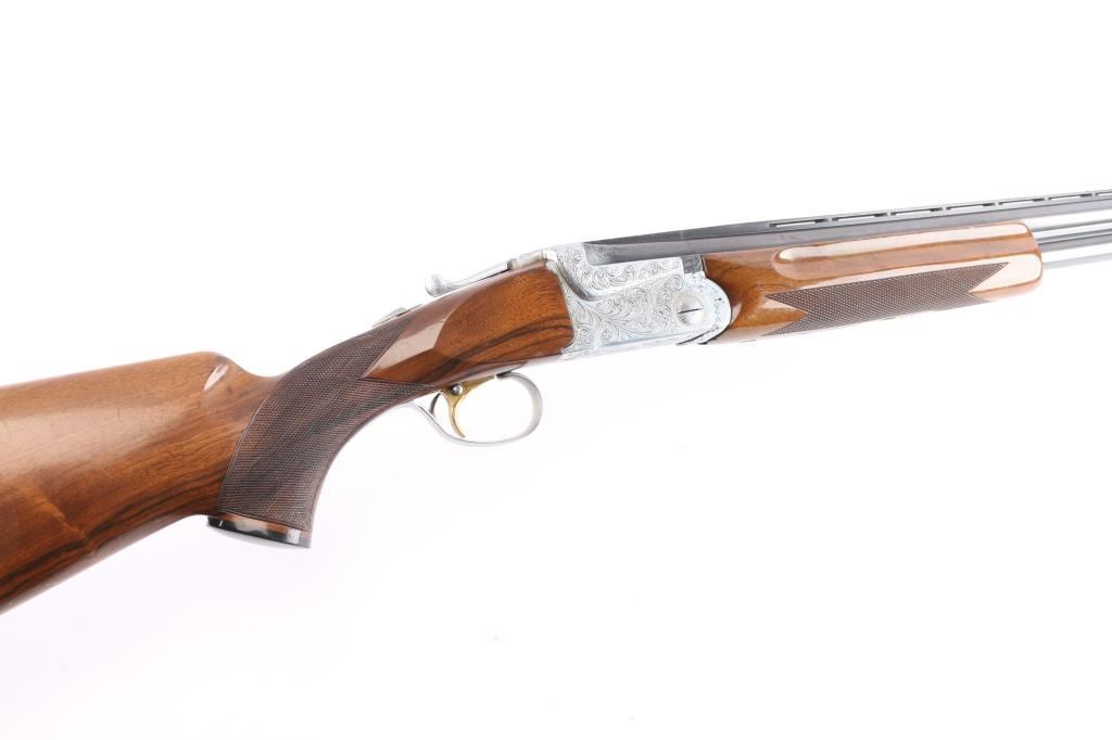 High quality over/under double barrel shotgun chambered for 2 3/4" 12 gauge shells, produced in Japan by SKB. Features blued 30" barrels with a raised ventilated top rib, fixed chokes marked 'Full', but measure CYL, automatic ejectors, brass bead front sight, silver bead mid-sight, scroll engraved receiver with silver plated finish, serrated single gold trigger with barrel selector, sliding tang safety, checkered semi-beavertail walnut forend and pistol grip shoulder stock with black grip cap & White-Line recoil pad. Barrels retain approximately 92% blue finish, with scratches and light muzzle wear, there is some patches of scattered light pitting on the lower end. The silver plated receiver retains its original finish. Action is crisp, bores are pristine and wood stocks are very good with a few small blemishes. Brass initial plate in buttstock. Mechanically excellent. Consigner purchased this shotgun in Japan.