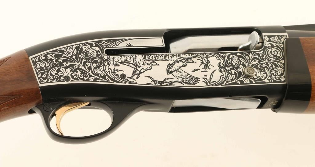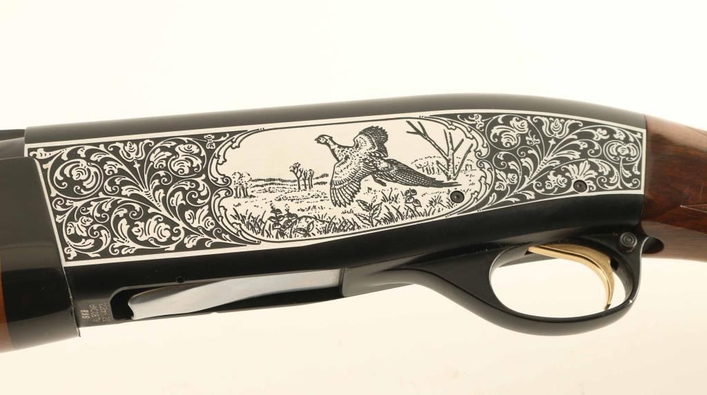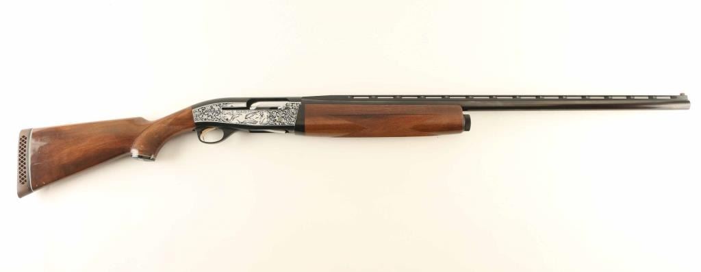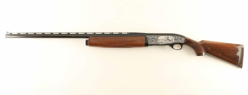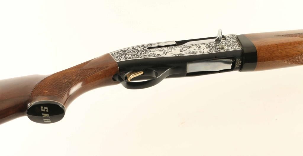 Japanese semiautomatic shotgun imported by Mitsui & Co, Chicago IL. Accepts 2-3/4" shells. Features 30" vent rib barrel, fixed Full choke, Bradley front bead, manual safety, engraved receiver, urethane finished wood butt & forend, checkering panels at wrist and forend, ventilated rubber recoil pad. Engraving features floral scrolls surrounding game scenes, with Ducks on right and Pheasant on left side of receiver. Bore is excellent condition. Metal retains 90% finish with rubbing at muzzle, scratches to receiver sides. Wood is very good with scratches, scuffs, and small gouges. Condition is NRA Very Good *** Modern Firearm ***