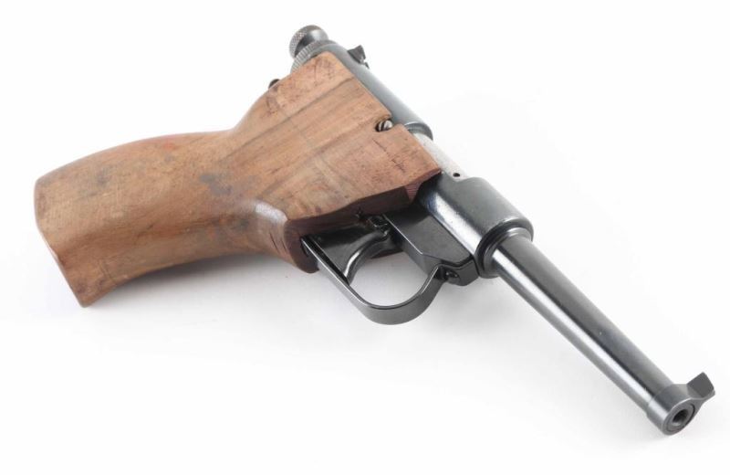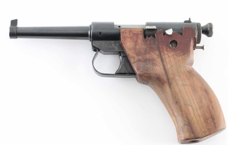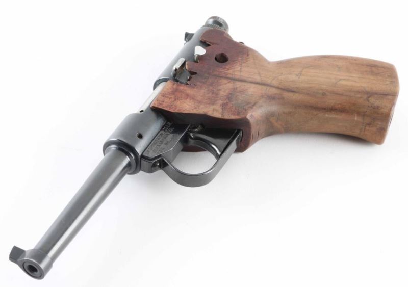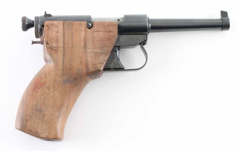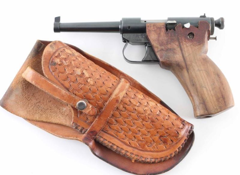 Uncommon single shot rimfire pistol features auto-ejection, 4.5" barrel, blade front sight, rear sight in dovetail, manual safety. Bore is very good condition. Retains 90% blued finish with small blemishes and signs of handling. Plain oversized wood grip is good condition, has slight unfinished appearance. Includes fair condition leather belt holster. Condition is NRA Very Good *** Modern Firearm ***
