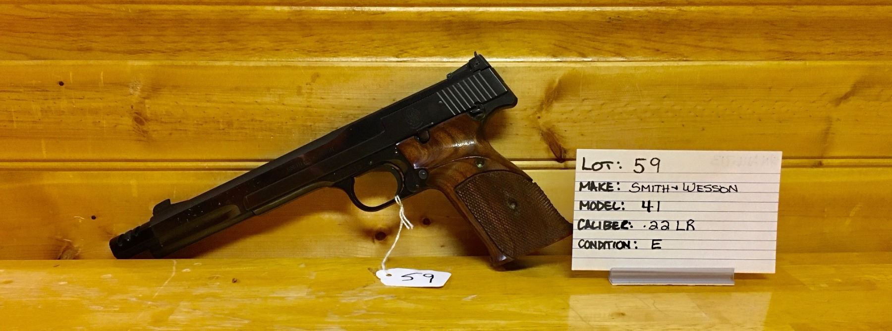 LOT: 59 MAKE: SMITH + WESSON MODEL: 41 CALIBER: .22 LR CONDITION: E S/N: A116713 ?NOTE: RESTRICTED
