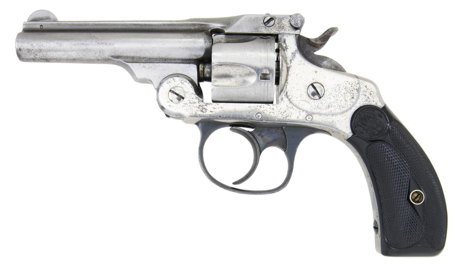 REVOLVER. Cal. 32 S&W. S# 249259 (1883-1909). Bbl. 3". Pinned blade front sight. Nickel finish w/ blued trigger guard. case colored hammer & trigger. Non matching 5 shot fluted cyl. Matching numbered 2 piece hard rubber grips. CONDITION: bbl. has cleaned appearance w/ patina & pitting. Fair frame nickel w/ large areas peeling on grip straps & pinprick peeling throughout. Very good grips. Bore has good rifling w/ light pitting throughout. (23-234/MD). CURIO. $150-250.