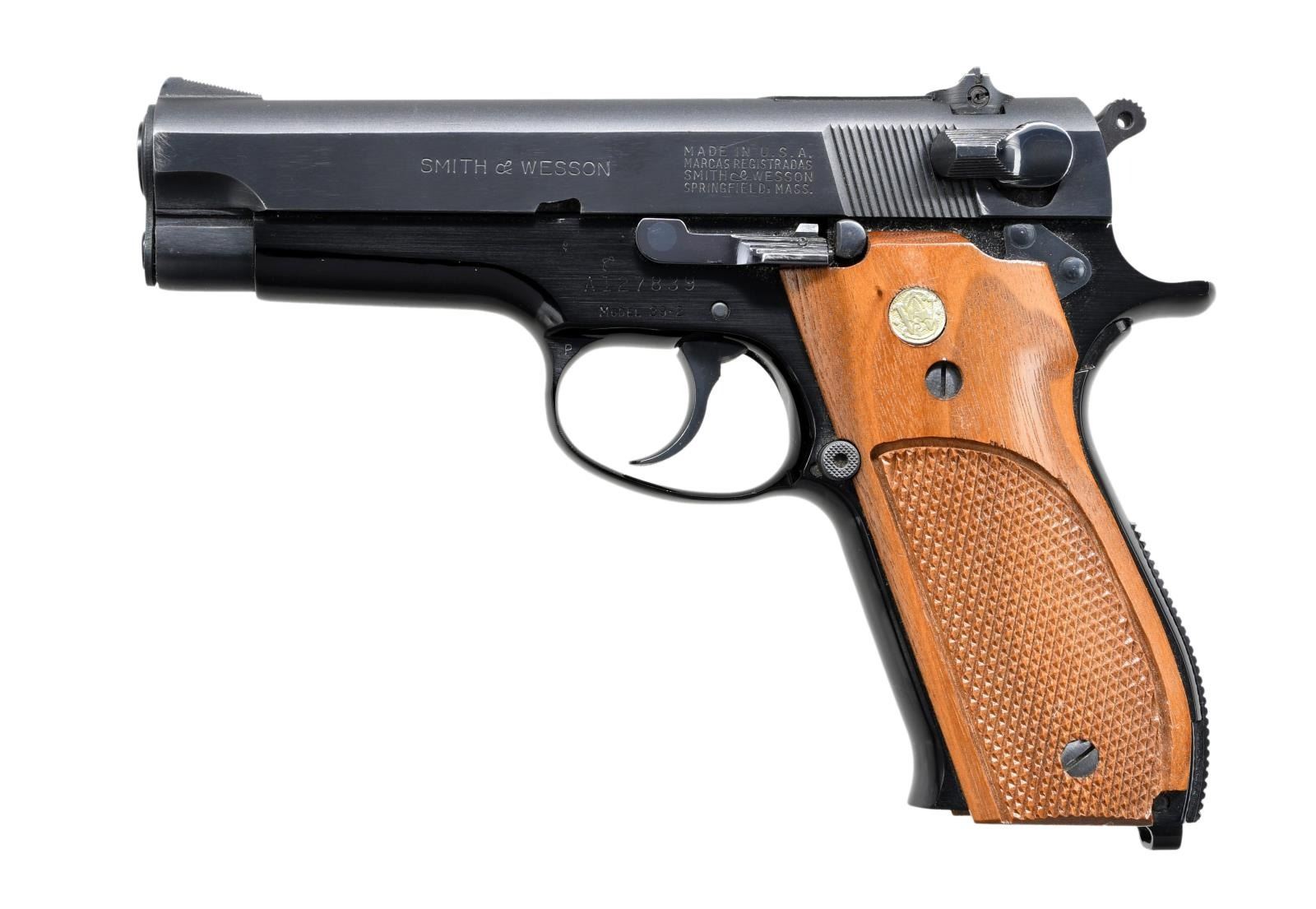 Cal. 9mm Luger. S# A127839 (1970-1971). Bbl. 4". Steel slide w/ serrated ramp front sight & micrometer adj. rear sight. Alloy frame w/ lanyard loop at butt. Two piece checkered walnut grips w/ S&W medallions. MAGS: NONE. CONDITION: near excellent blue w/ light wear spots. Near excellent grips w/ couple of marks on butts of grips. Very good bore. (23-893/MD). CURIO. $300-400.
