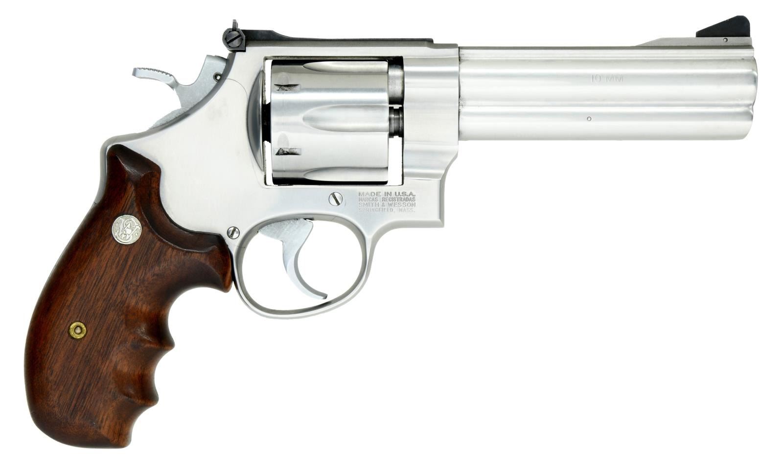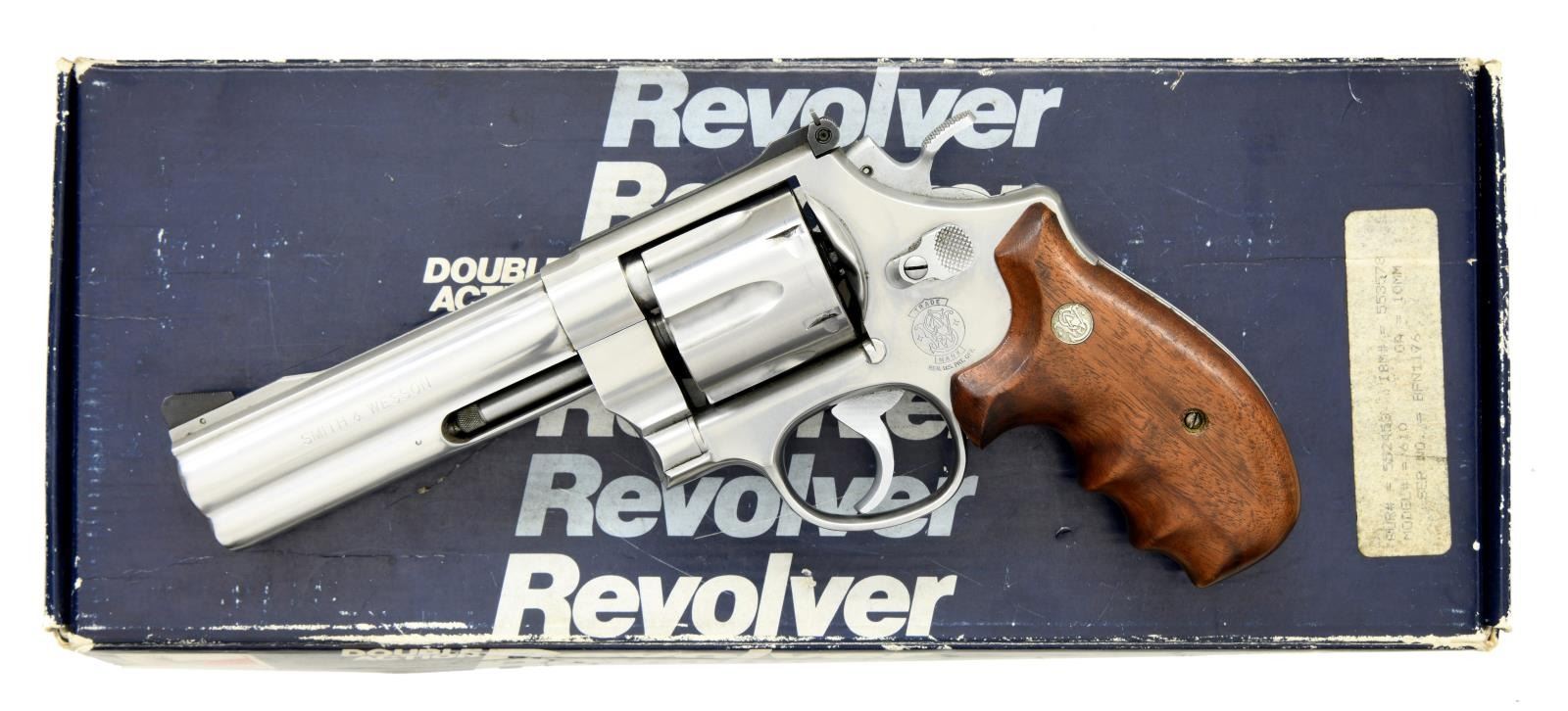 Cal. 10mm (10mm Auto / 40 S&W). S# BFN1176 (1990). Satin Stainless steel rnd. butt, 3 screw, N target frame w/ grooved grip straps. Bbl. 5" w/ full lug. Semi target hammer & smooth trigger. Pinned serrated ramp front & micrometer adj. rear sights. 6 Shot fluted cyl. Two piece finger groove combat Goncalo Alves grips w/ S&W medallions. UNATTACHED ACCESSORIES: matching numbered box containing paperwork, 3 half moon clips & 40+ full moon clips. CONDITION: very good to near excellent metal finish w/ light wear, residue & cyl. turn line. Near excellent grips w/ residue along straps. Near excellent bore. (23-1076/MD). MODERN. $600-900.
