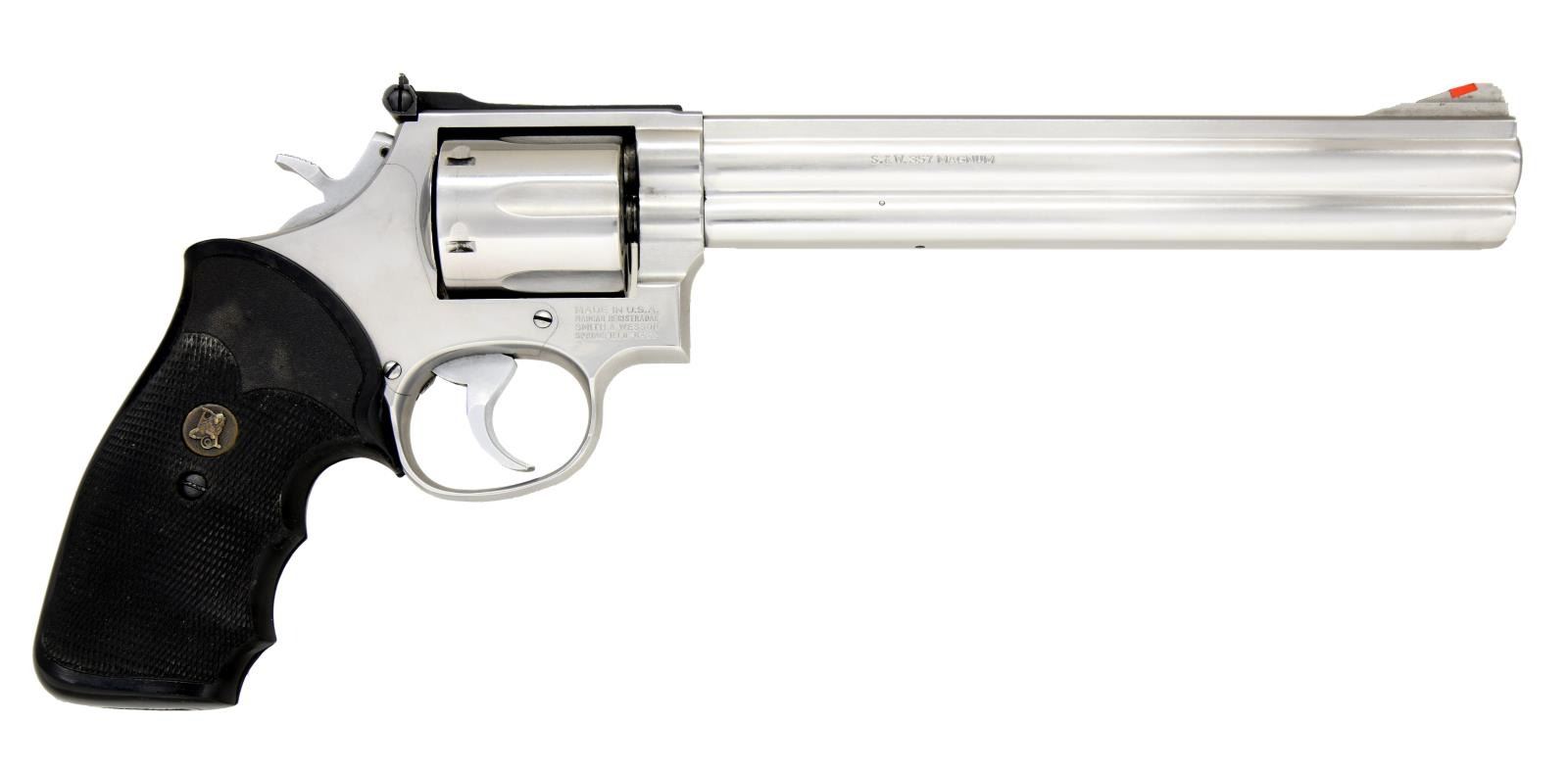 Cal. 367 Mag. S# AFJ7221 (approx. Nov. 1984). The Stainless steel, square butt, 3 screw, L Target frame revolver has 8 3/8" bbl. w/ full lug. Red ramp front sight & white outline micrometer rear sight. 6 Shot fluted cyl. Semi target hammer & serrated target trigger. Replacement Pachmayr Gripper grip. CONDITION: Near excellent metal finish w/ cyl. turn line & few spots of residue. Very good grip w/ light wear. Near excellent bore. (23-1049/MD). MODERN. $550-700