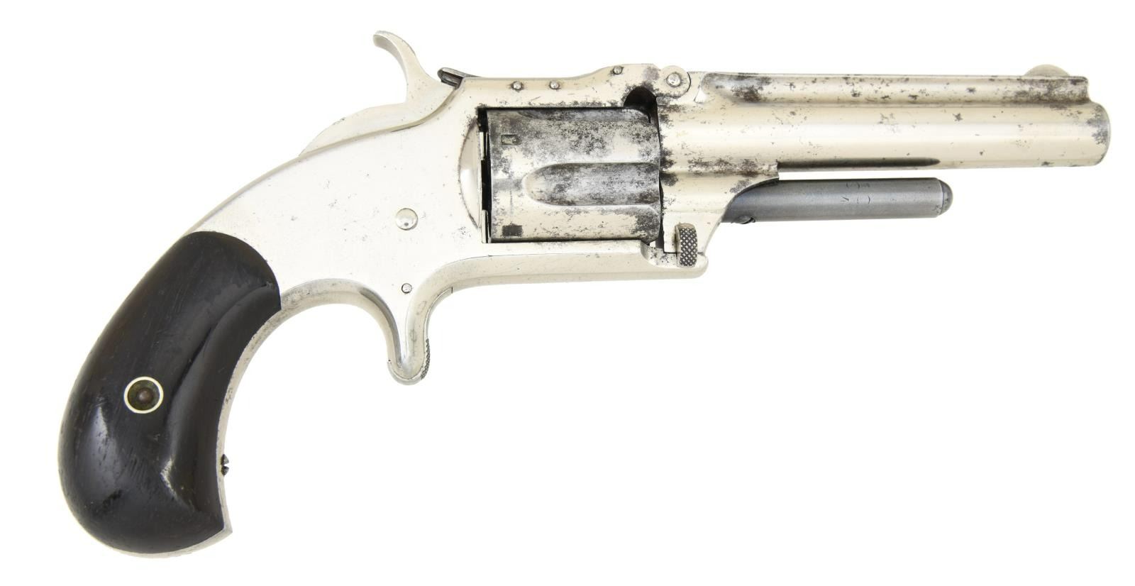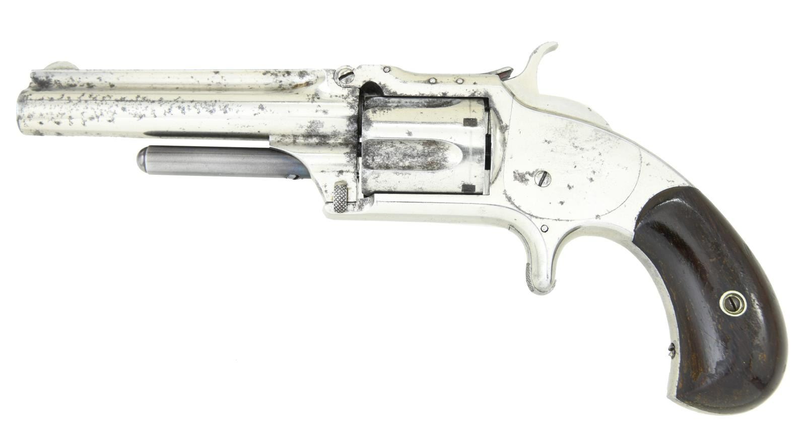 Cal. 32 RF. S# 68391 (1868-1875). Bbl. 3 1/2" w/ rib & round blade front sight. 5 Shot fluted cyl. Nickel finished frame. Matching numbered 2 piece rosewood grips. CONDITION: action in need of attention, cyl. binds & will not cycle. Fair nickel showing cleaned pitting, gray patina & marks. Good grips showing gouges, marks & worn finish. Fair bore showing large area of pitting forward of breech. (01-22619/MD). ANTIQUE. $200-300.