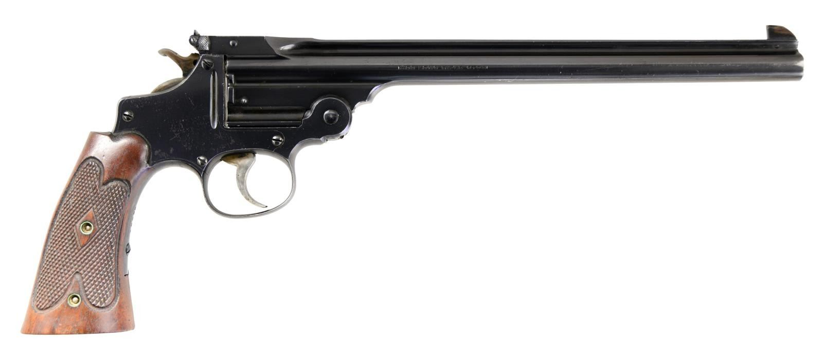 Cal. 22 LR. S# 10233. Bbl. 10". Similar to 2nd Model but built on an “I” solid frame, w/ integral trigger guard, side plate on right side of frame & will fire in both SA & DA mode. Fixed blade front & notch rear sights. Blued finish w/ case color on hammer & wooden checkered extension grips: one is pencil numbered to the pistol. CONDITION: metal retains about 90% blue w/ numerous light dings & scratches. Hammer retains trace amounts of case color. Grips are solid w/ strong checkering & numerous fine impact marks on the bottoms. Bore is very good, bright & strongly rifled. (23-1003/CW). CURIO. $1,000-1,500.