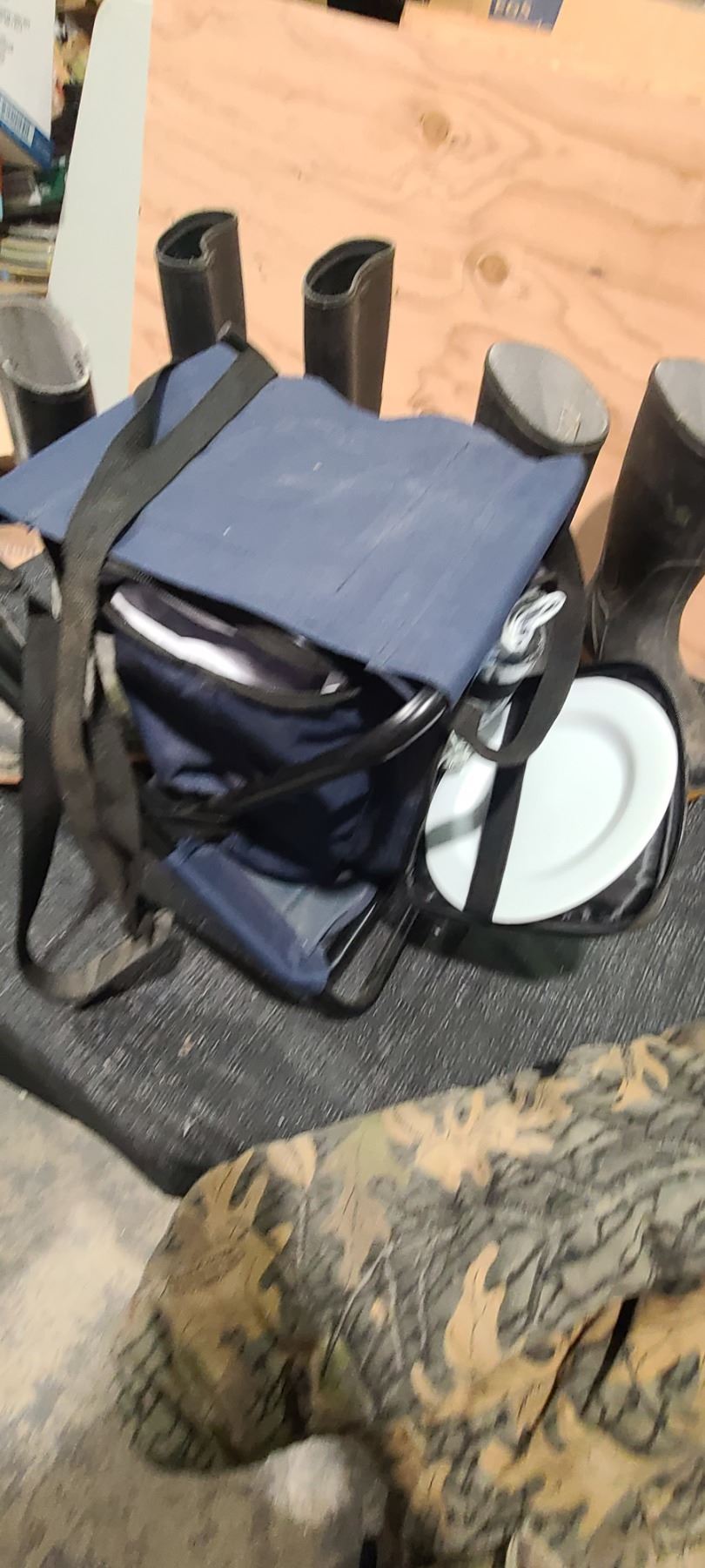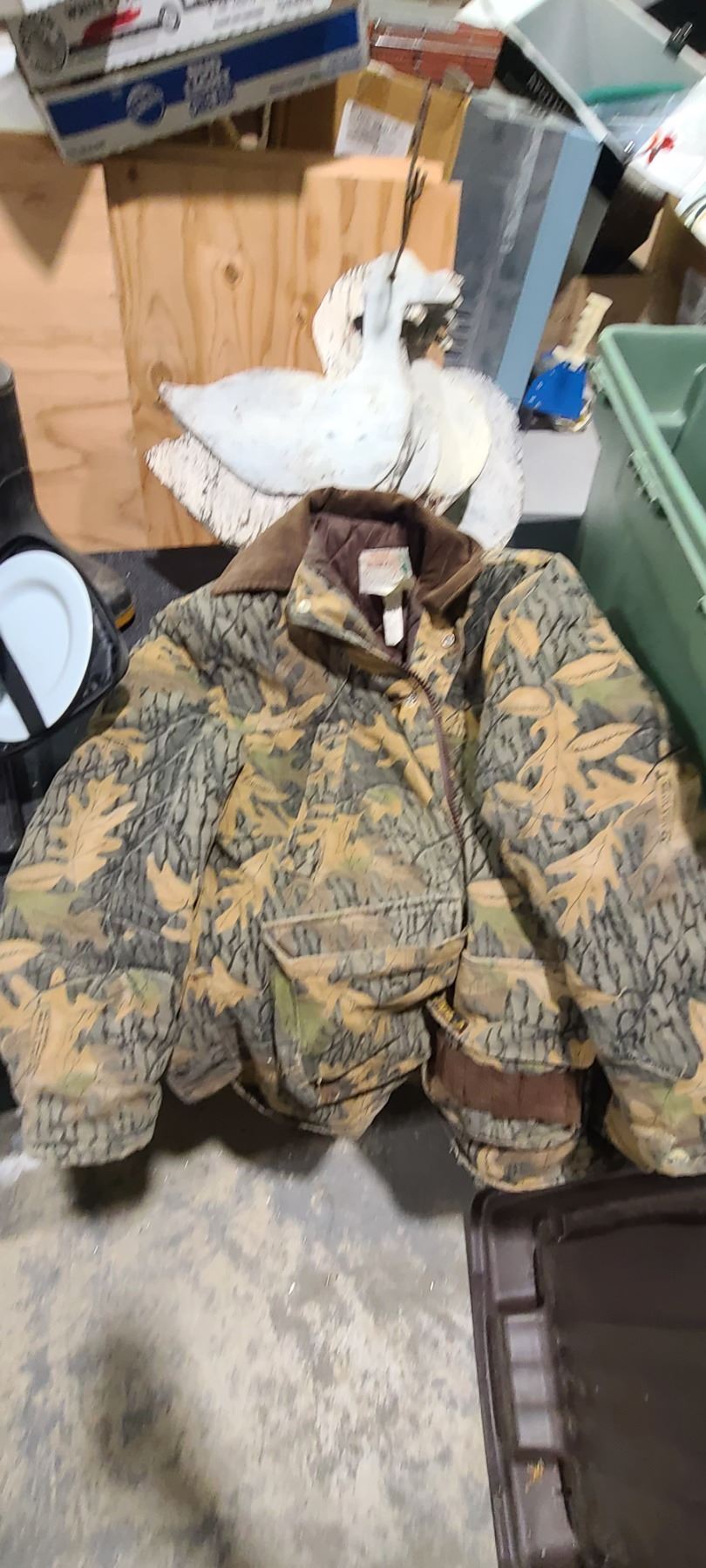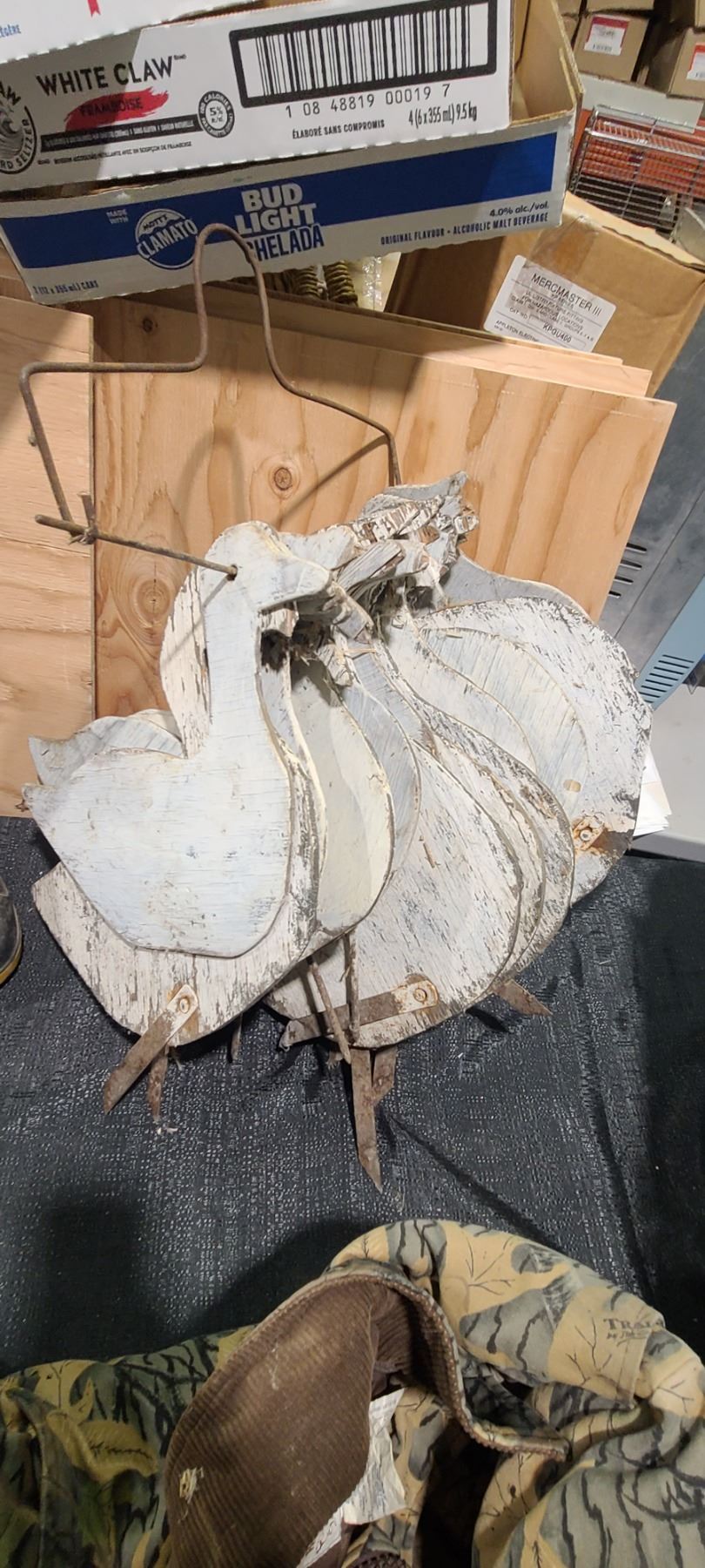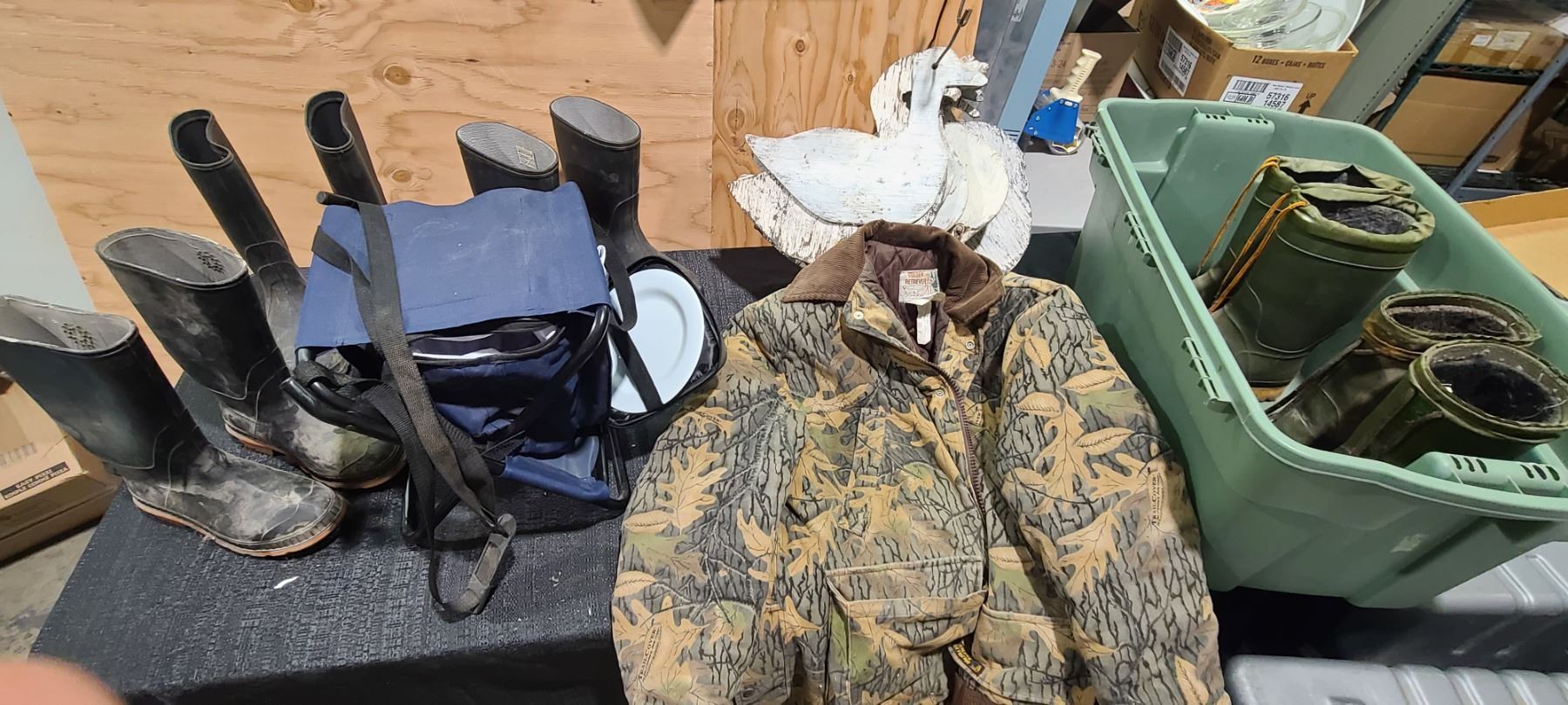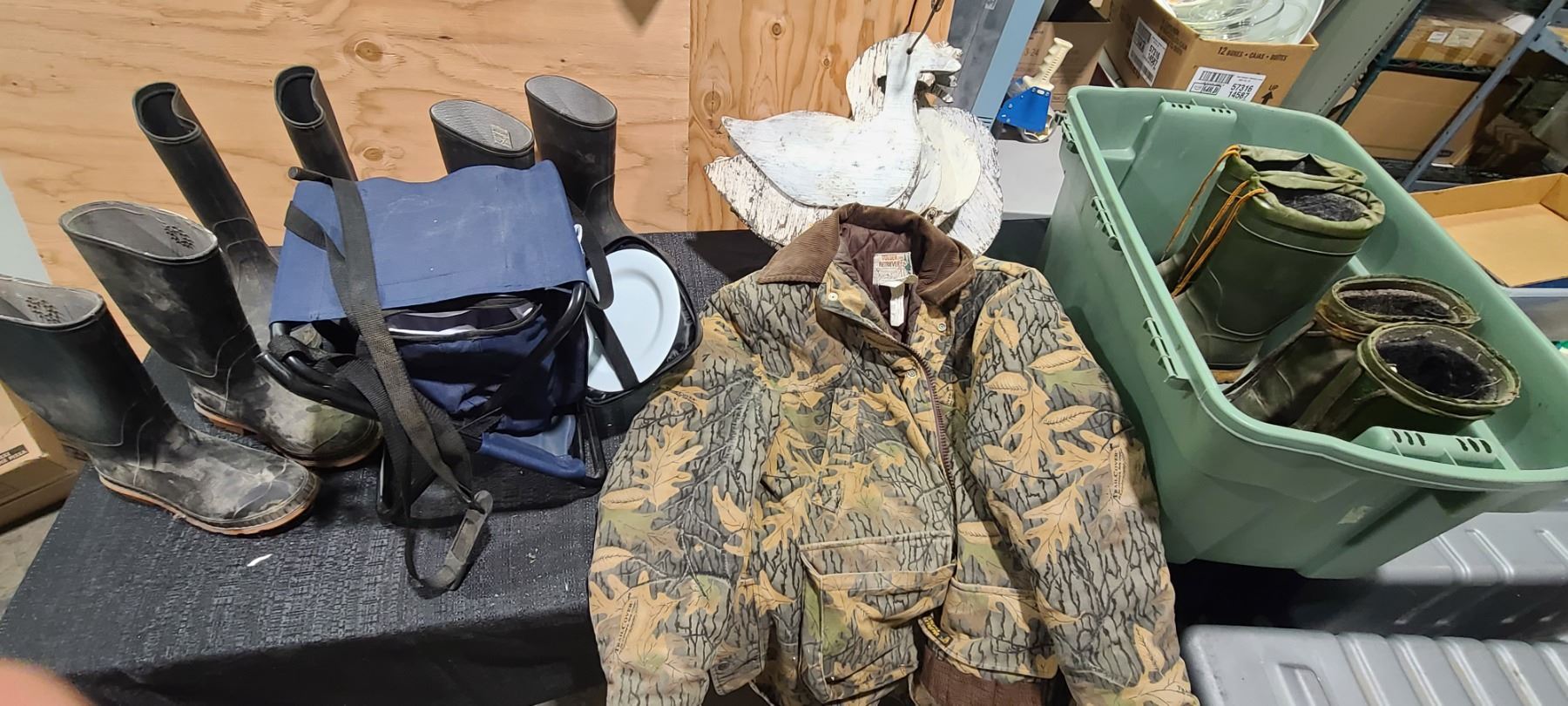 SNOW GOOSE AND CANADIAN GOOSE SILHOUETTES, RUBBER BOOTS, JACKET AND CHAIR. PSI.SEE IMAGES.