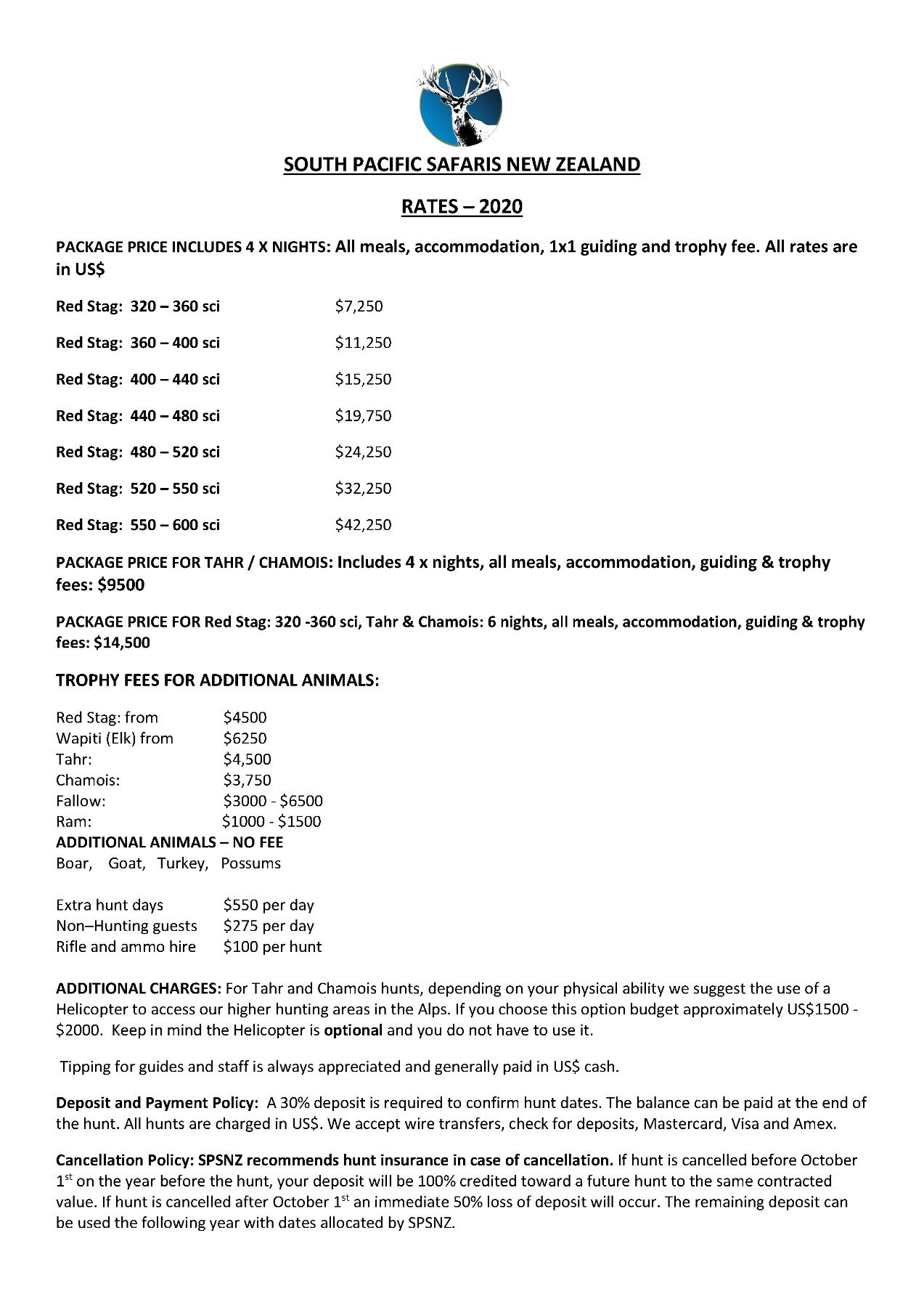 Extra days and other trophies of red stag, elk, fallow buck, tahr, chamois, ram’s and boar may be added as per the outfitters current price list. Other hunters and non-hunters are very welcome as per the outfitters current price list. Helicopter can be used to assist into the mountains for a tahr, however this is NOT included in the donation. Hear the roar of the Red Staggs in the majestic mountains of New Zealand! Additional hunting days at $550 and observing guests at $275 a day.