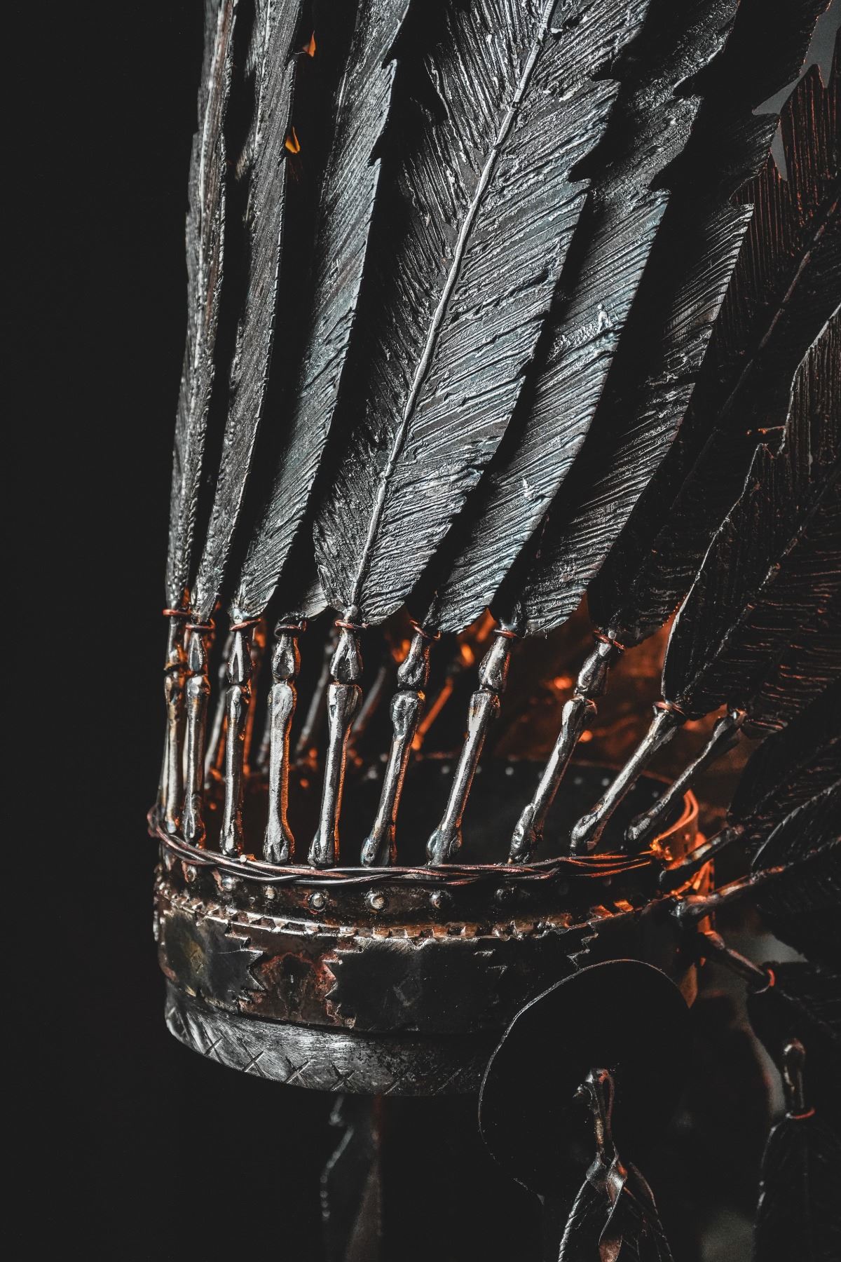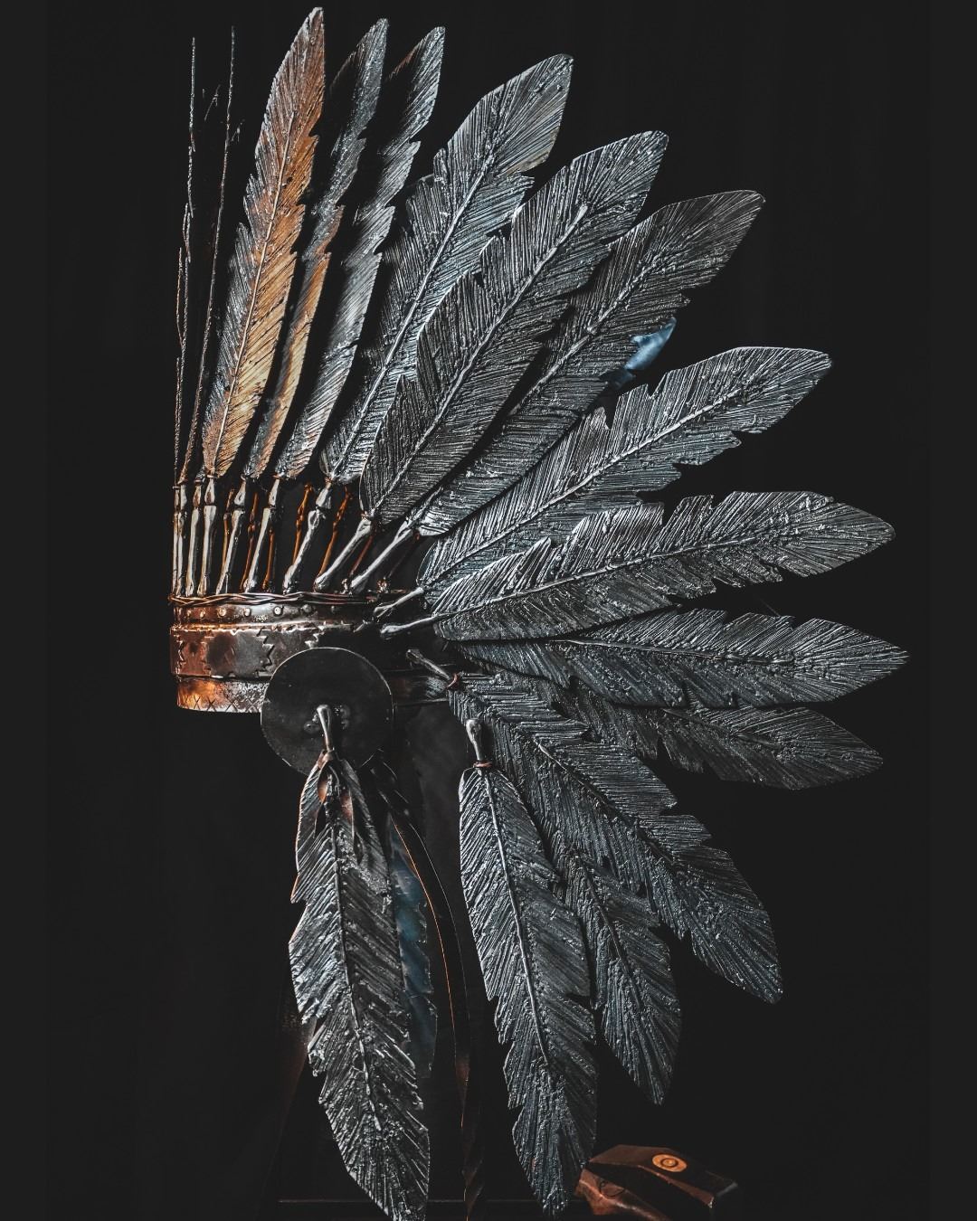 Each feather is individually textured into shape, forming a powerful one-of-a-kind piece of art that resembles a true Chief’s war bonnet.