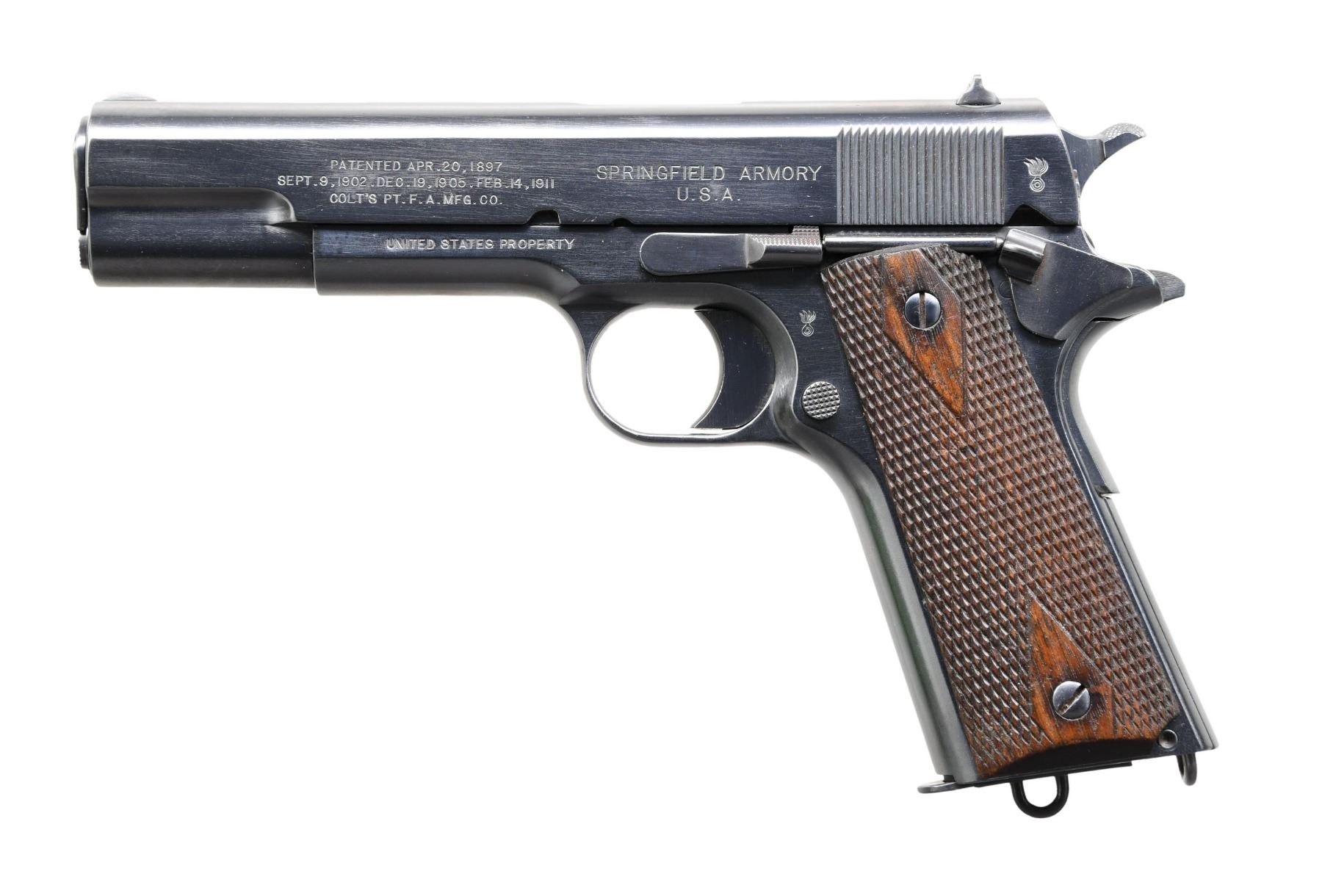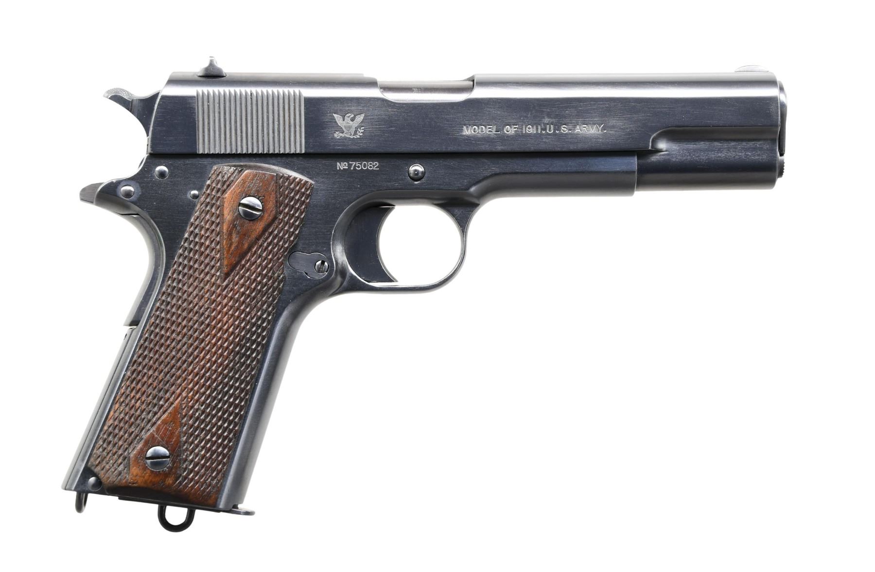 Cal. 45 ACP. S# 75082. Mfg. June 1914. Barrel 5" & "S" on left side barrel lug; most features correct including walnut grips. MAGS: 1 two tone 7 rd. with lanyard loop. CONDITION: Pistol has professionally refinished blue metal finish having a near excellent appearance. Grips appear original having a good appearance with wear to checkering mostly visible near butt. Good bore with frosting in the grooves. CONDITION: PROVENANCE: From the lifelong Collection of Jim Williams. (24-2638/MD). CURIO. $2,000-3,000.