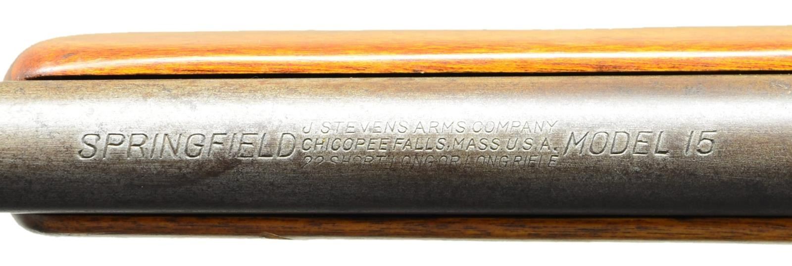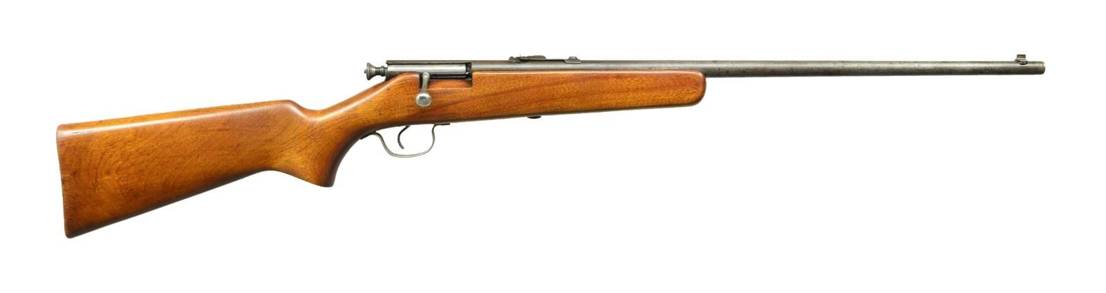 SHOT RIFLE. Cal. 22 S, L, LR. NSN. Bbl. 22". Sporting sights. Manual cocking. Gumwood stock w/ bare butt. CONDITION: Poor gray/brown patina metal. Good stock finish w/ large 5" crack on left side forearm. Very good bore. (22-6229/MD). CURIO. $25-75.