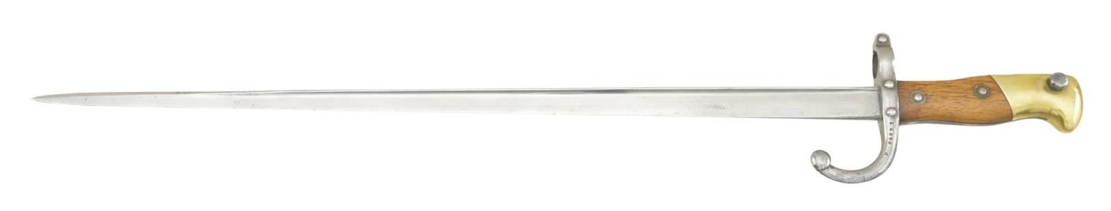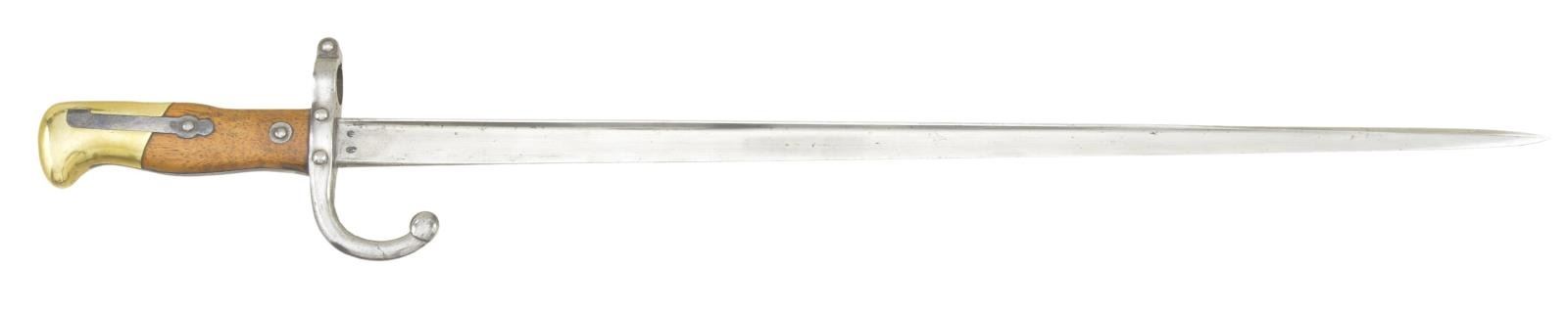 Overall: 25 1/2". S# "P 64633" on crossguard. CONDITION: bayonet in good overall condition. Blade has light patina. Crossguard has gray appearance mixing w/ patina. Grips have added varnish. Brass has bright appearance. (02-19378/MD). $100-200.