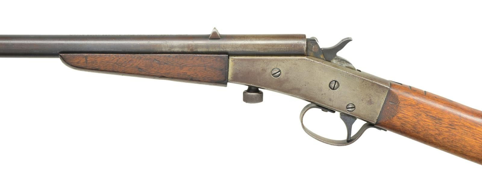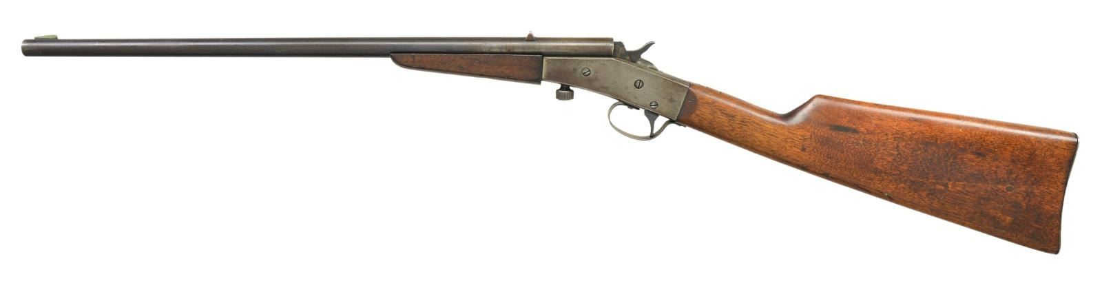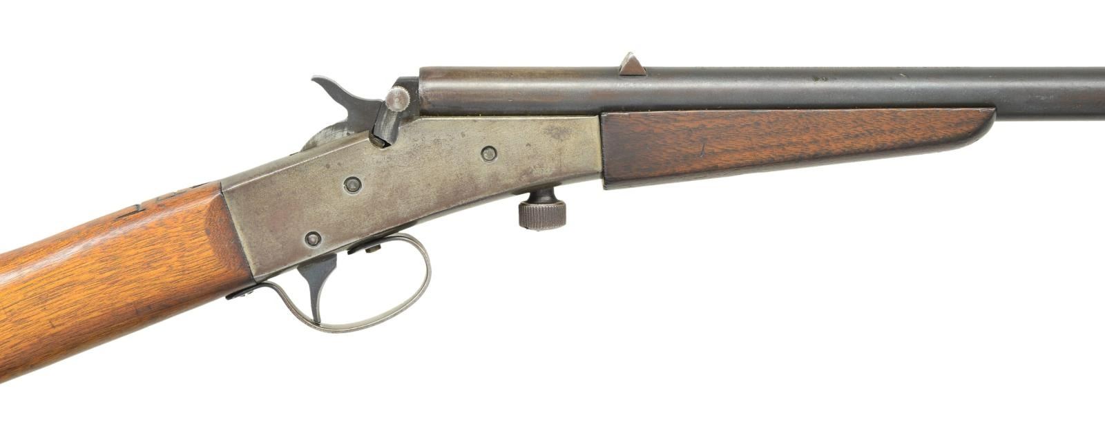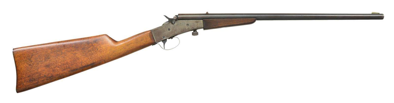 Cal. 22 LR. NSN (mfg. 1909-1936). Bbl. 18". German silver blade front & V notch rear sight. Rolling block action. Walnut stock set w/ steel buttplate. Top of wrist carved "PF". CONDITION: fair traces of blue mixed w/ brown/gray patina showing impact marks & scratches. Action has gray/brown patina appearance w/ some blue in protected areas showing pinprick oxidation. Good wood finish w/ numerous impressions & scratches. Fair worn bore w/ pitting. (23-343/MD). CURIO. $75-125.