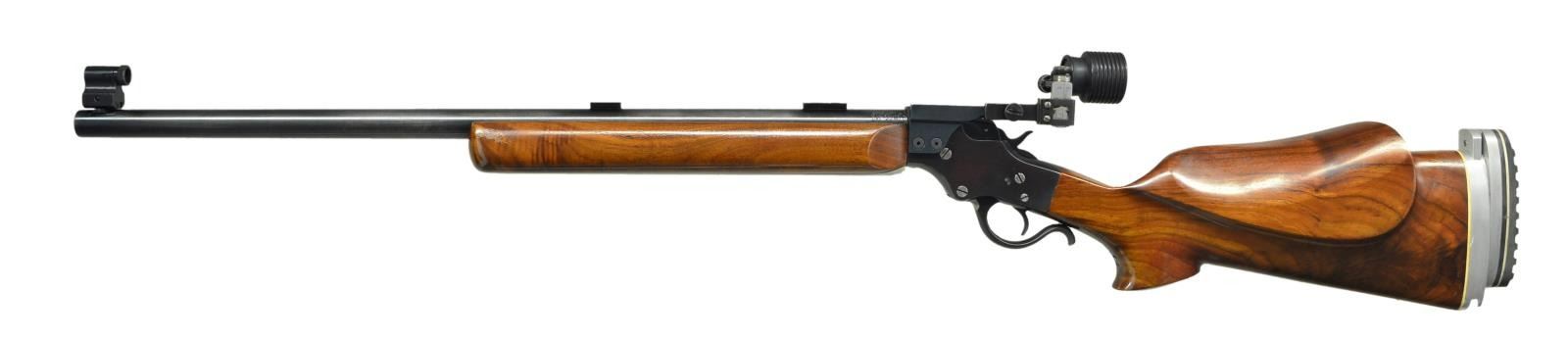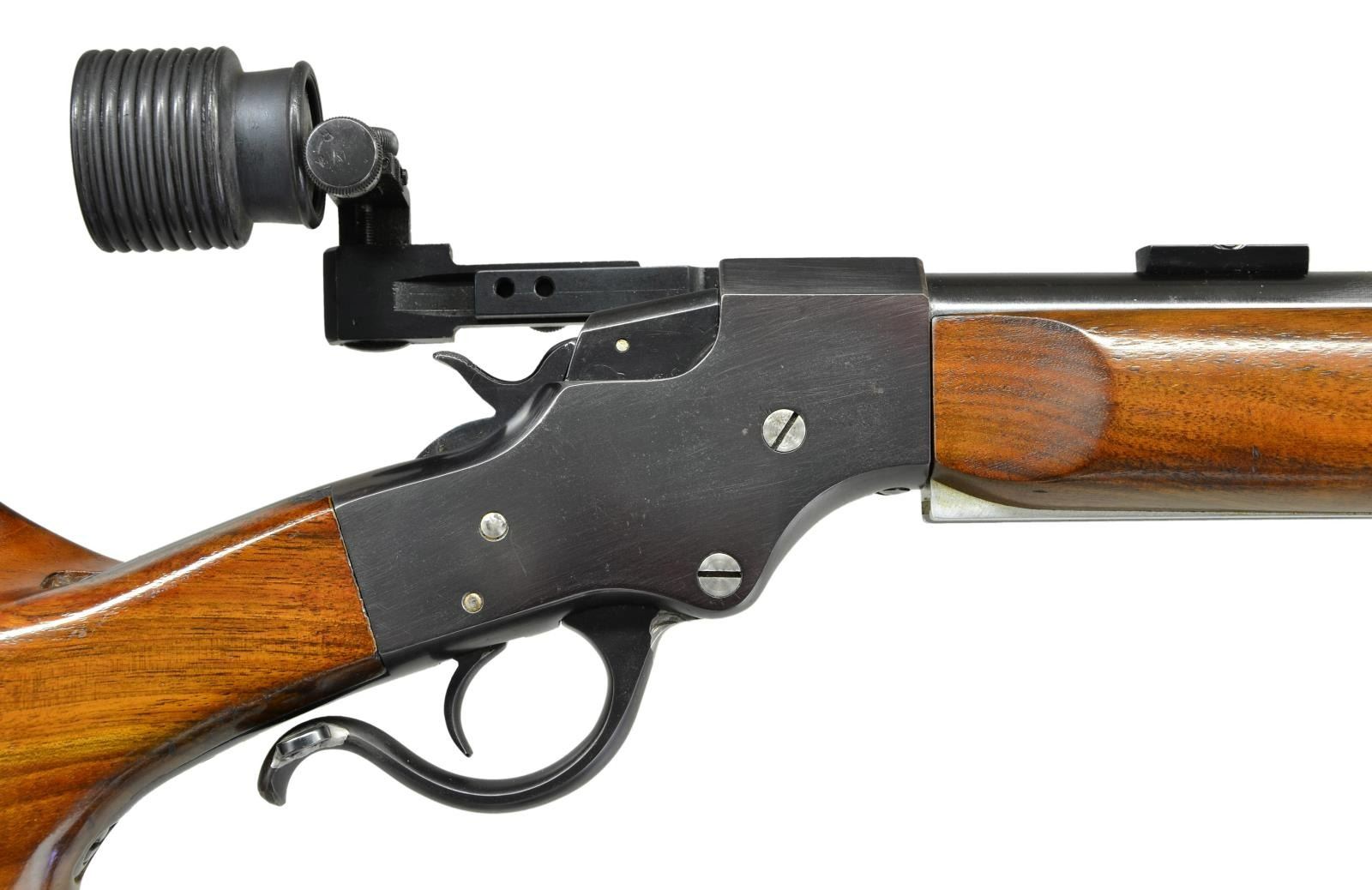 Cal. 22 LR. S# 81167. Bbl. 24 3/4", Model 416 fitted w/ target blocks plus Lyman #17 globe sight at front. Mfg. originally 1894-1933. Custom gunsmithed to include target forend having integral aluminum rail. Fancy pistol gripped buttstock w/ pronounced, sculpted cheekpiece, hole for prior sling swivel plus Freeland designed Mershon pad on adjustable aluminum buttplate assembly. Special sight base on left side of receiver holding Redfield 75 sight having large target disk w/ rubber hood. Lever has been reshaped as welded by TIG process using stainless rod; weld not blued. New screws are stainless or in the white. Breech block has been milled on top & appears to be from early sideplate model. Replacement hammer & trigger springs w/ new method of attachment. CONDITION: very good appearance w/ areas of original finish wear on bbl. Receiver w/ sm. spots of prior marks & pitting being refinished; plum tone to portion of lever. Very good stock set w/ minor handling marks. Action appears loose until cartridge is in chamber creating tight lock up. Near excellent bore. (23-325/NW). MODERN. $350-500.