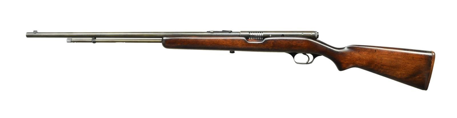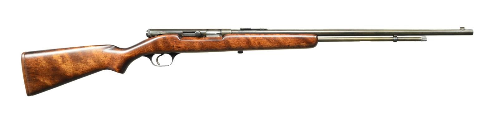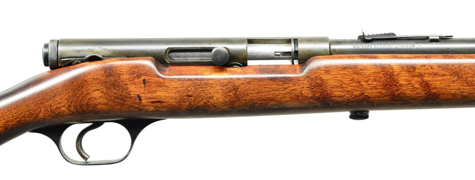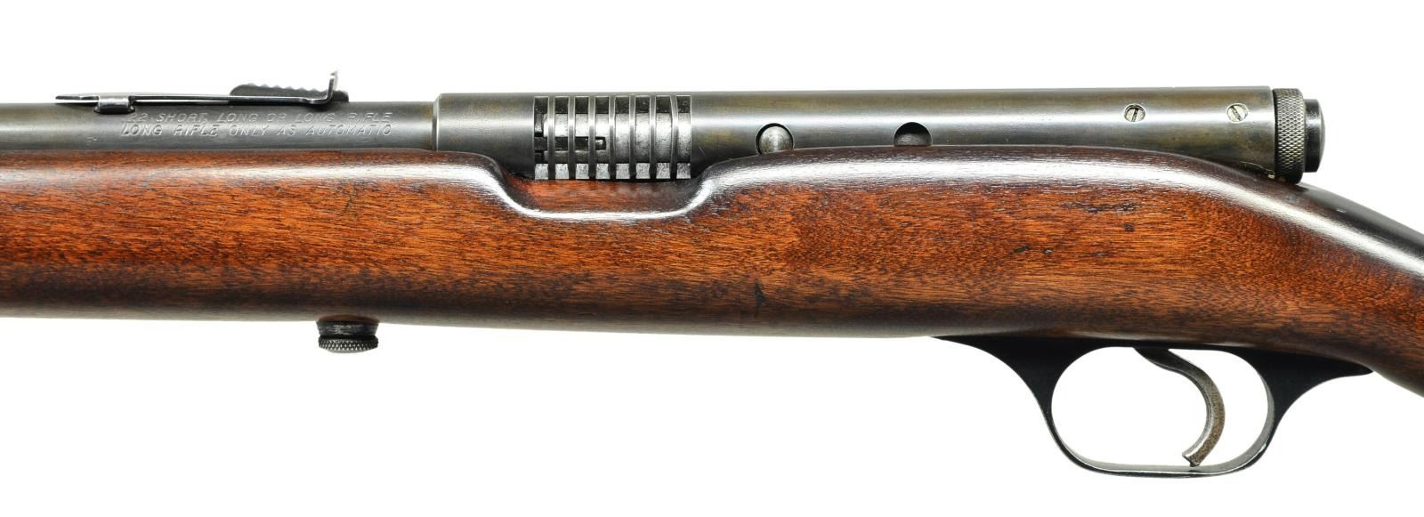 Cal. 22 S, L or LR. NSN. Bbl. 24". Fixed blade front & buckhorn rear sights. Tube magazine, blued finish & pistol grip smooth hardwood stock. CONDITION: metal is a fading blue/gray patina. Stock has an added coat of finish over light dings & a homemade wooden buttplate marked “EC 87A 07”. Bore is good, slightly dull w/ some stubborn fouling. (22-6227/CW). CURIO. $50-100.