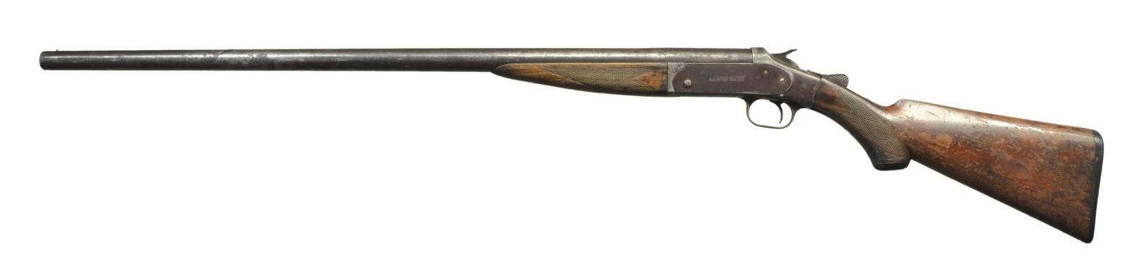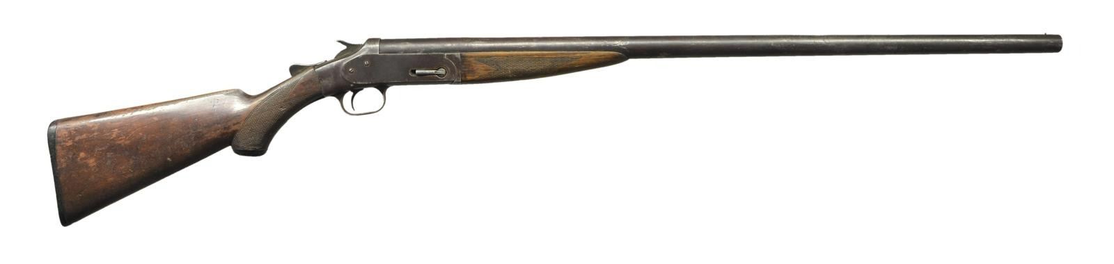Cal. 12 Ga. S# 14. Bbl. shortened to 30" w/ brass stud & cyl. bore. Hammer top break action w/ quick release hinge pin. Walnut stock set w/ hard rubber grip cap & buttplate. CONDITION: fair gray brown patina metal finish w/ numerous marks & peppery oxidation. Fair worn wood finish w/ buttstock protruding from action, buttstock has a few cracks w/ along marks. Firing pin periodically catches extractor & unable to load chamber. Fair pitted bore. (23-768/MD). MODERN. $50-80.