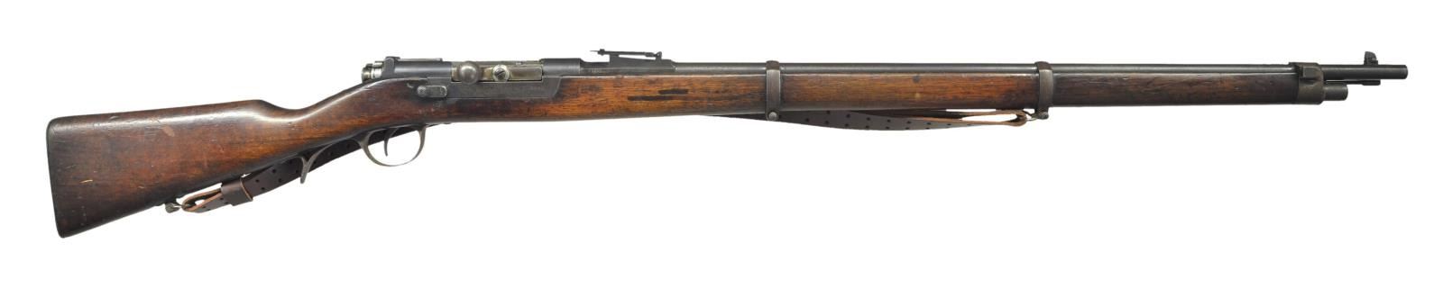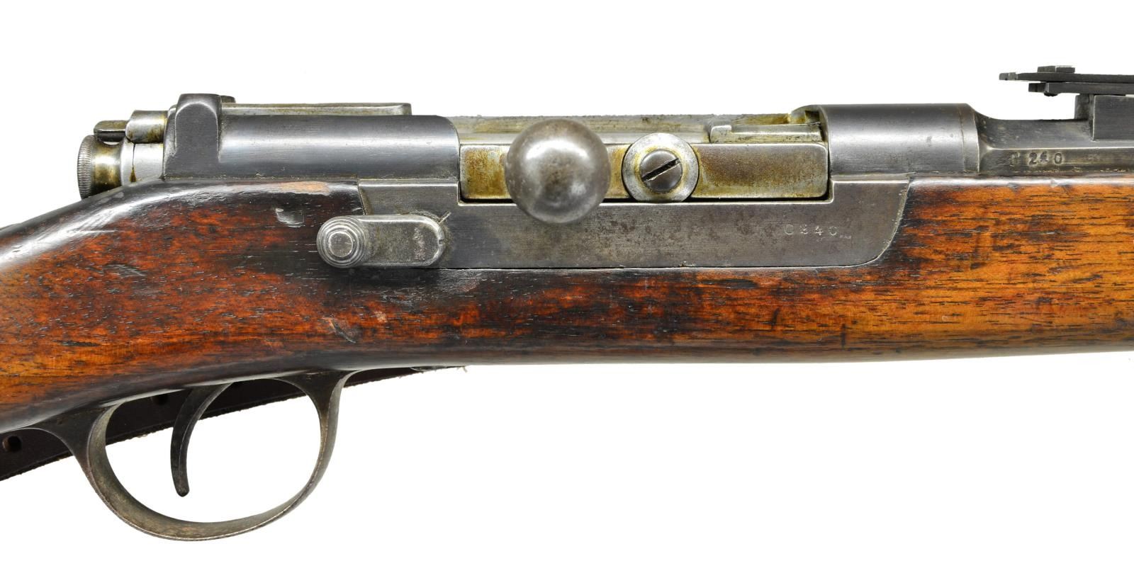 Cal. 8x60R. S# C240. Bbl. 32". Matching numbers on bbl., stock, & right sideplate. Bolt parts are mismatched. Portuguese M1886 Kropatschek infantry rifle. Left side of receiver has Steyr 1886, M1886 & Portuguese crown markings. Ladder rear sight graduated to 2200m. Blade front sight. Walnut stock set w/ bottom mounted sling swivels. Right and left side of butt have faint Portuguese roundels. Original ramrod & modern leather sling present. CONDITION: stock set has arsenal finish w/ scattered dings & handling marks. Bands, buttplate & triggerguard are a dull gray patina w/ oxidation throughout. Receiver & bbl. retain 30% arsenal blue w/ overall fading & scattered oxidation. Dark bore that may clean up better. (01-23316/MJC). ANTIQUE. $300-500.