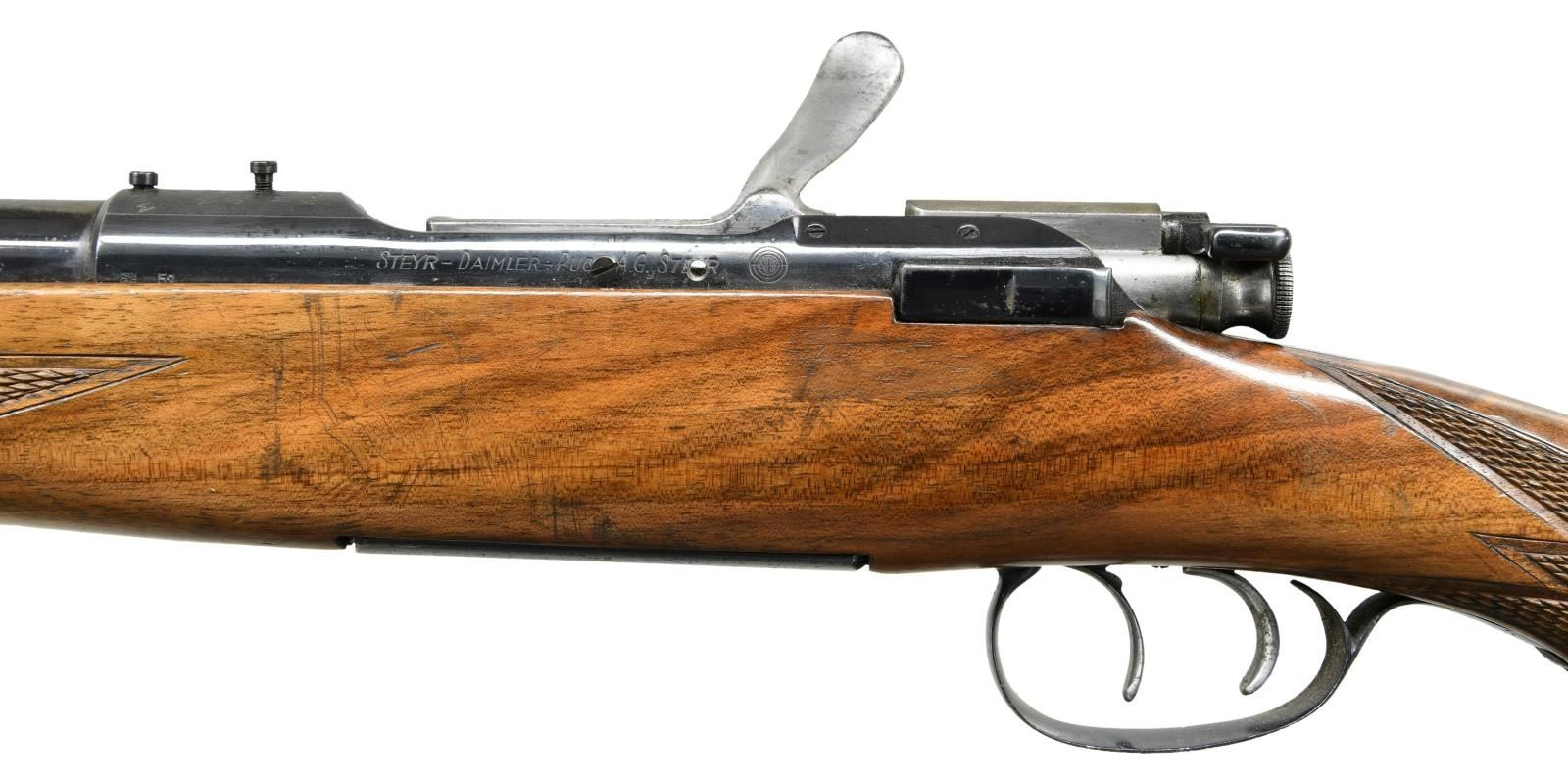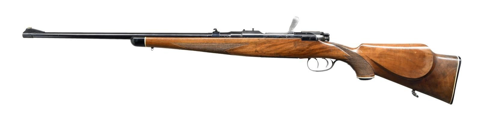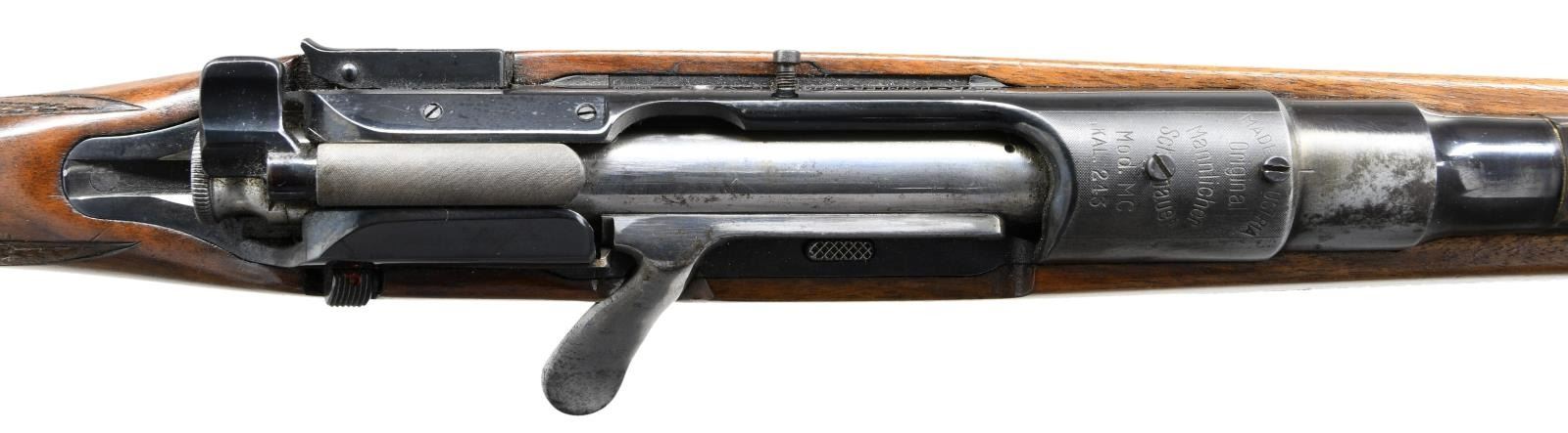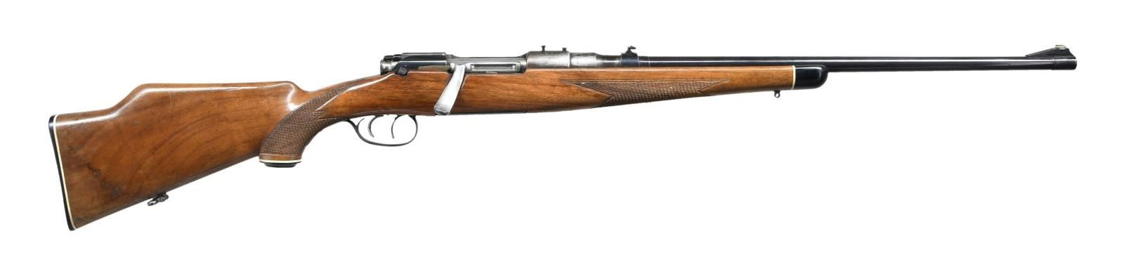 Cal. 243 Winchester. S# 6811. Bbl. 22". Mfg. 1959 w/ matching S# on receiver & Bbl. Stoeger import marked bottom of floorplate. Fixed blade ramp front & folding leaf rear sights. 2 extra holes on receiver ring & left side frame. Double set triggers, butterknife bolt handle & internal 5 shot rotary magazine. Monte Carlo stock w/ ebony tipped & checkered forend & capped pistol grip checkered stock w/ rear sling swivel & forward swivel stud. CONDITION: metal retains about 70% blue; strongest on the Bbl. w/ right side receiver & breech end Bbl. worn to gunmetal gray. Scattered dings & light rust. Stock shows numerous dings, dents & moderate scratches. Checkering remains strong w/ some points missing. Bore is very good, bright & strongly rifled w/ a small spot of fine pitting mid bore. (23-1161/CW). CURIO. $500-700.