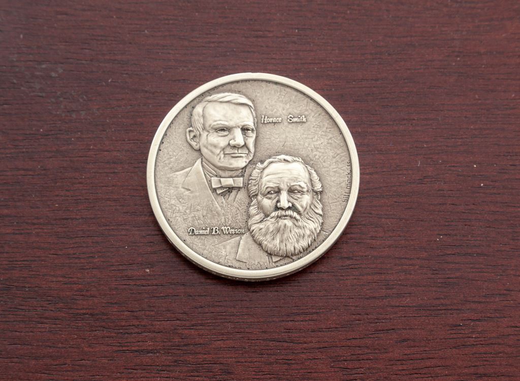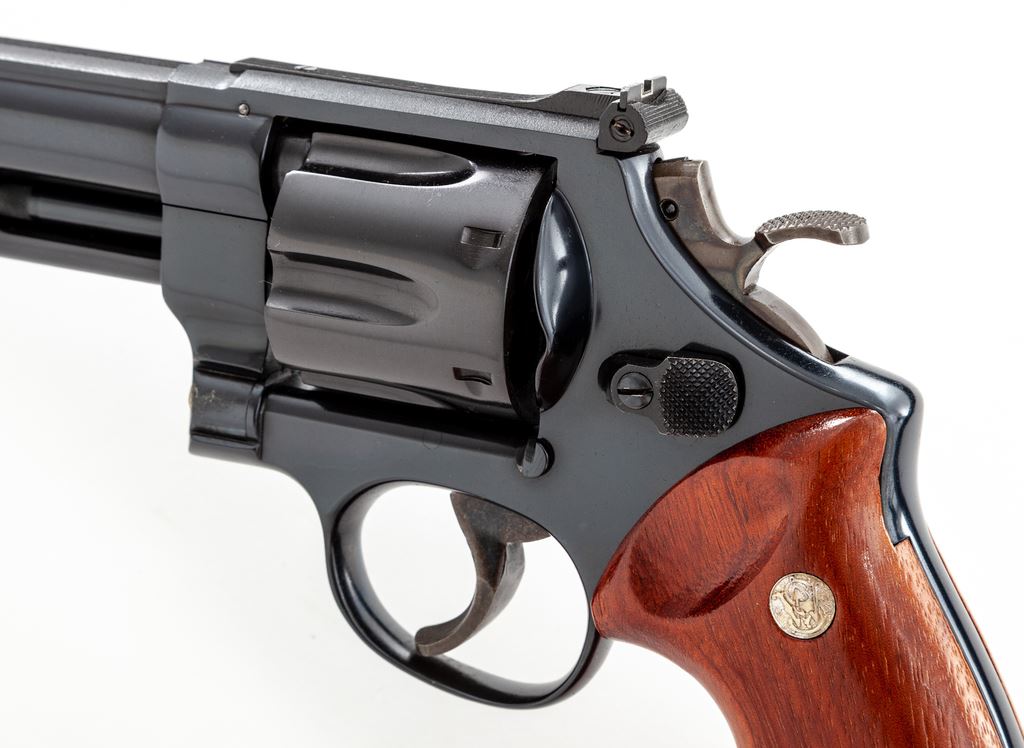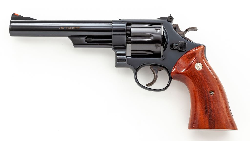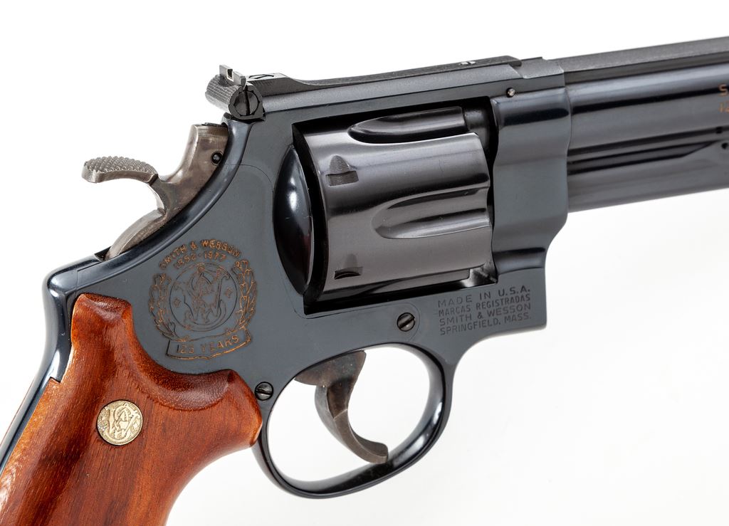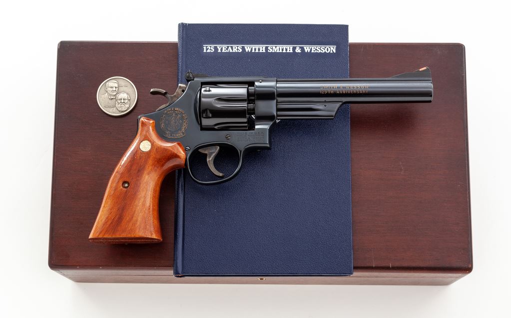 Smith & Wesson 125th Anniversary Commemorative Model 25-3 Double Action Revolver, #S&W1668, .45 LC cal., 6.5'' solid rib barrel, blue finish, smooth Goncalo alves target grips with S&W medallions, red ramp front sight, white outline adjustable rear sight, color case hardened wide target hammer and trigger. Right side of barrel reads in gold lettering ''SMITH & WESSON / 125TH ANNIVERSARY''; right side of frame with 125th Anniversary logo. Included is the original wood display case with blue velvet interior, silver commemorative coin, and the book ''125 Years with Smith & Wesson'', by Roy G. Jinks. Revolver is in excellent near new overall condition and appears to be possibly unfired. Cylinder shows a faint index line and looks as if it was turned very little. Metal with a few normal light handling marks and approx. 99%+ original bright blue finish. With the exception of fine crazing to the finish along the bottom edges, both grips are also excellent. Factory lettering is crisp. Case colors are vibrant. Bore is also excellent. Case interior needs repair, as the blue velvet upper section and straps that hold the book in place have come loose from the wood; inlaid medallion on the exterior of the lid is missing, otherwise the exterior shows moderate scuffs and scratches. Approx. 10,000 of these revolvers were mfg'd in 1977. Est.: $700-$1,000. (C&R)(Sierra Sid's Casino, Sparks, NV.)