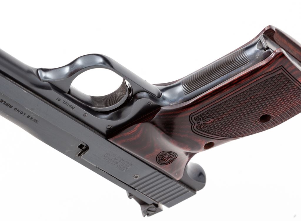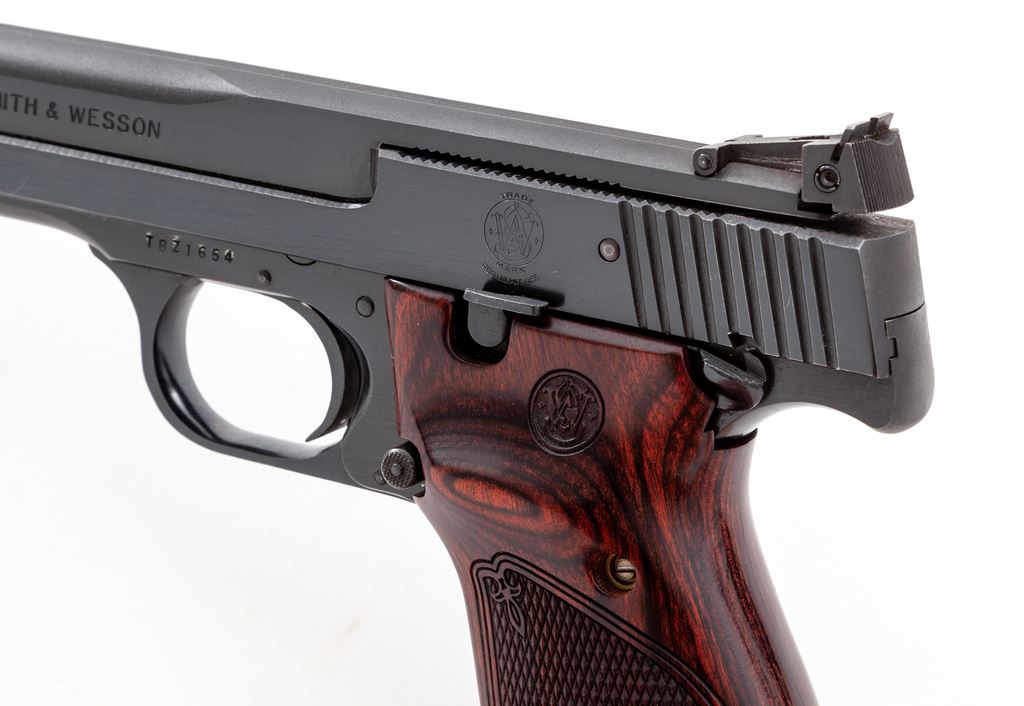 Smith & Wesson Model 41 Semi-Automatic Target Pistol, #TBZ1654, .22 LR cal., 7'' barrel, blue finish, checkered laminate thumbrest grips with laser engraved S&W monogram and fleur-de-lis pattern near the checkering; green fiber optic front sight, fully adjustable rear sight, serrated front grip strap, with three (3) S&W magazines. Approx. 98% factory blue remains and pistol is in near excellent overall condition, showing normal signs of range use including scattered slight scuffs and scratches to the slide and frame. Grips appear near new. Excellent action and bore. Est.: $800-$1,200. (Modern/Olympic Exempt)
