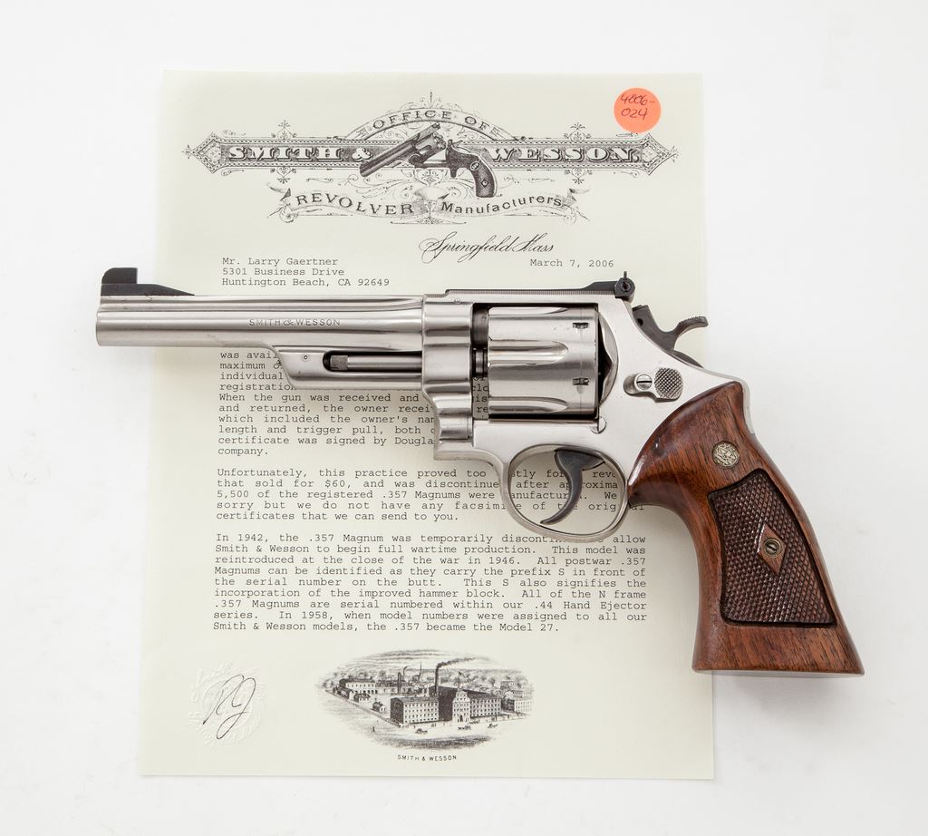Smith & Wesson Pre-Model 27 Double Action Revolver, 5-Screw Variation, #S140511, .357 mag. cal., 6'' pinned barrel, nickel finish, with checkered walnut square butt grips with inlaid S&W medallions. Finely checkered top strap, with target sights, including a square notched adjustable rear sight. Checkered case hardened hammer and serrated trigger. Barrel, cylinder, ejector star and frame with visible matching numbers. Shipped from the factory on March 6, 1956, to Sutcliffe Hardware Co., Louisville, KY, with factory letter signed by S&W Historian Roy G. Jinks. This revolver is in fine overall condition retaining approx. 98% factory nickel, the most noticeable finish loss being minor wear to high edges of the cylinder. Metal with general fine micro-scratching. Factory marks are clear. Grips with mild discoloration and thinning, and moderate flattening to the checks. Hammer and trigger retain approx. 97% case colors. Good action, near excellent bore. Est.: $1,800-$2,400. (C&R/PPT)