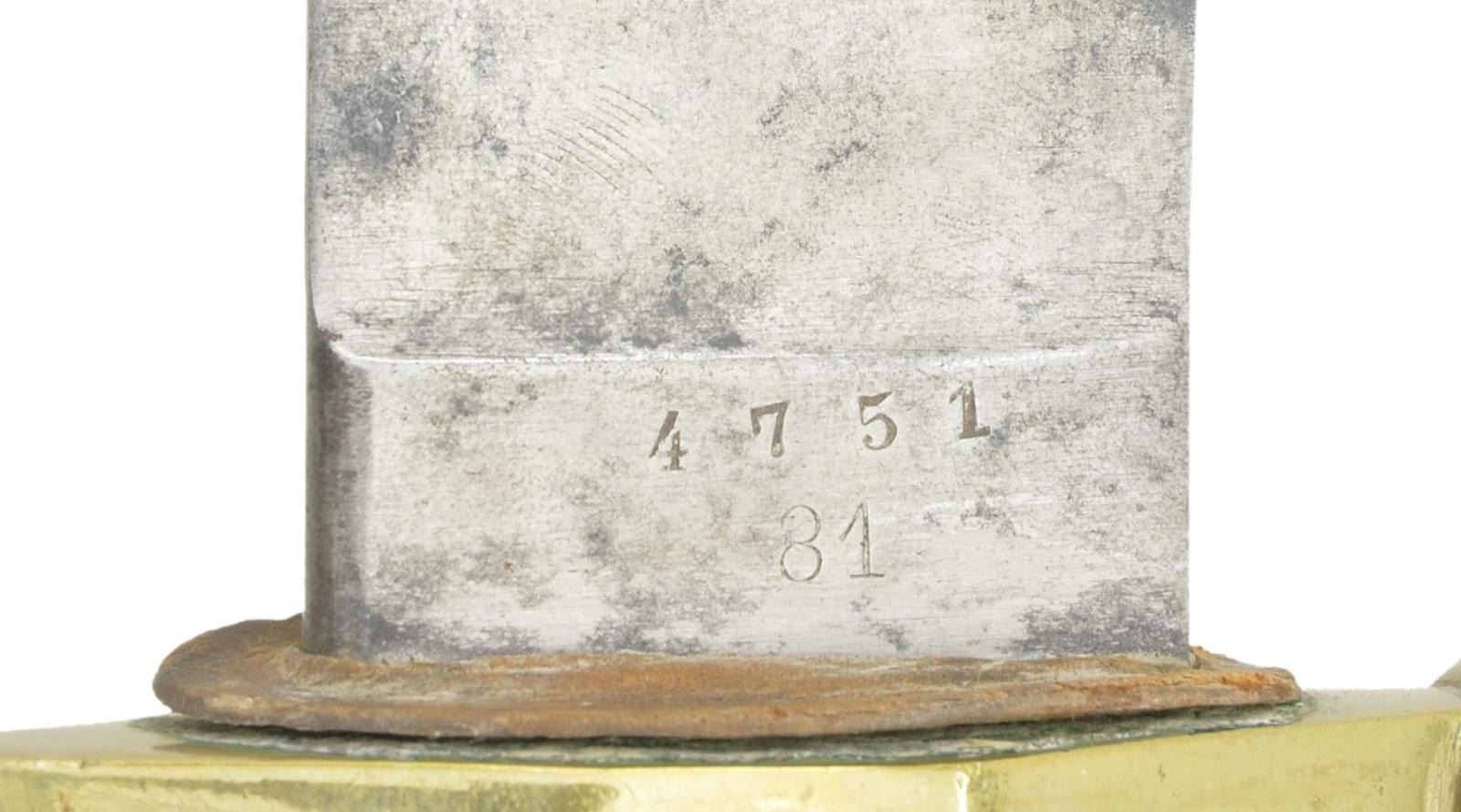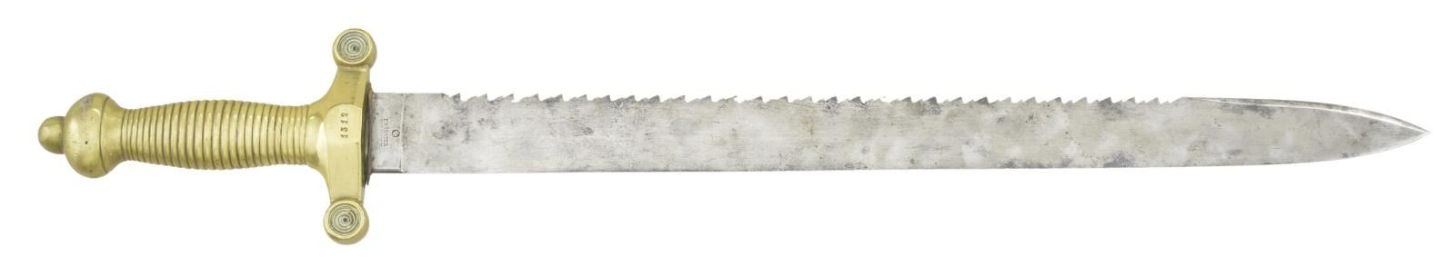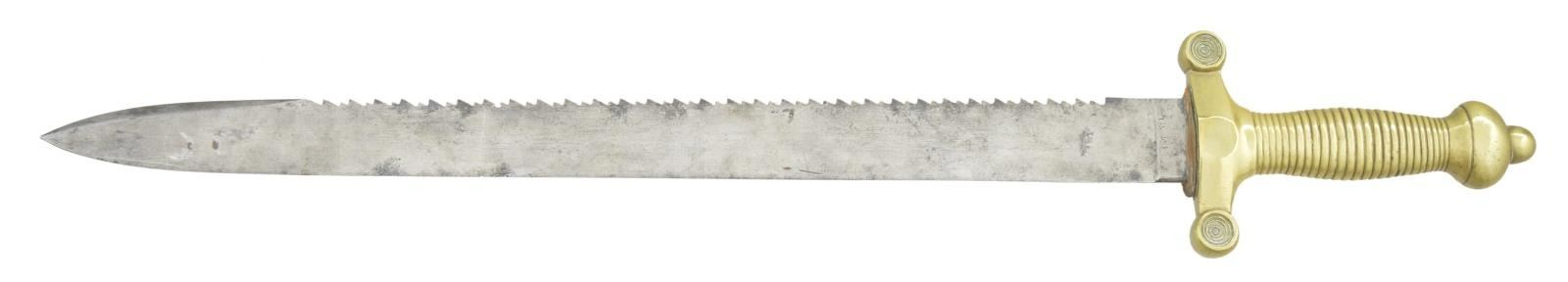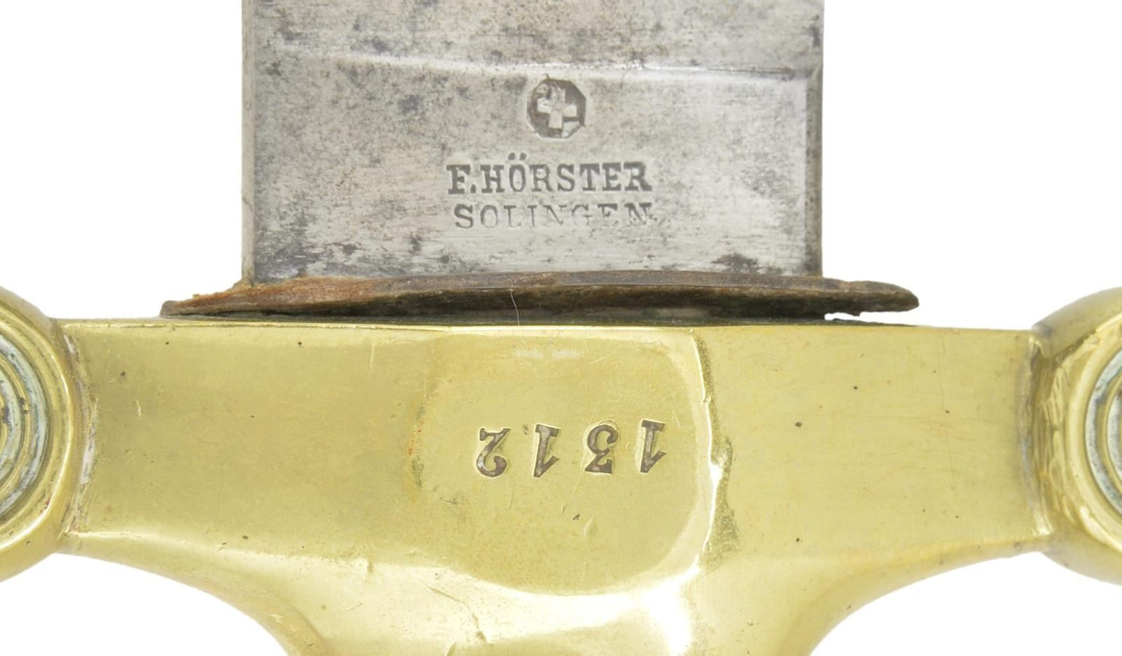 E. HORSTER. Overall: 26 1/4". Single edge 20 1/4" blade w/ 14" saw back section of spine. Ricassos marked "4751 / 81" & Swiss cross / "E. HORSTER / SOLINGEN". Brass hilt stamped "1312". CONDITION: sword has a cleaned appearance showing spots of patina & peppery oxidation on blade; light handling marks throughout. Leather washer intact w/ mildew stains. (02-19375/MD). $150-250.