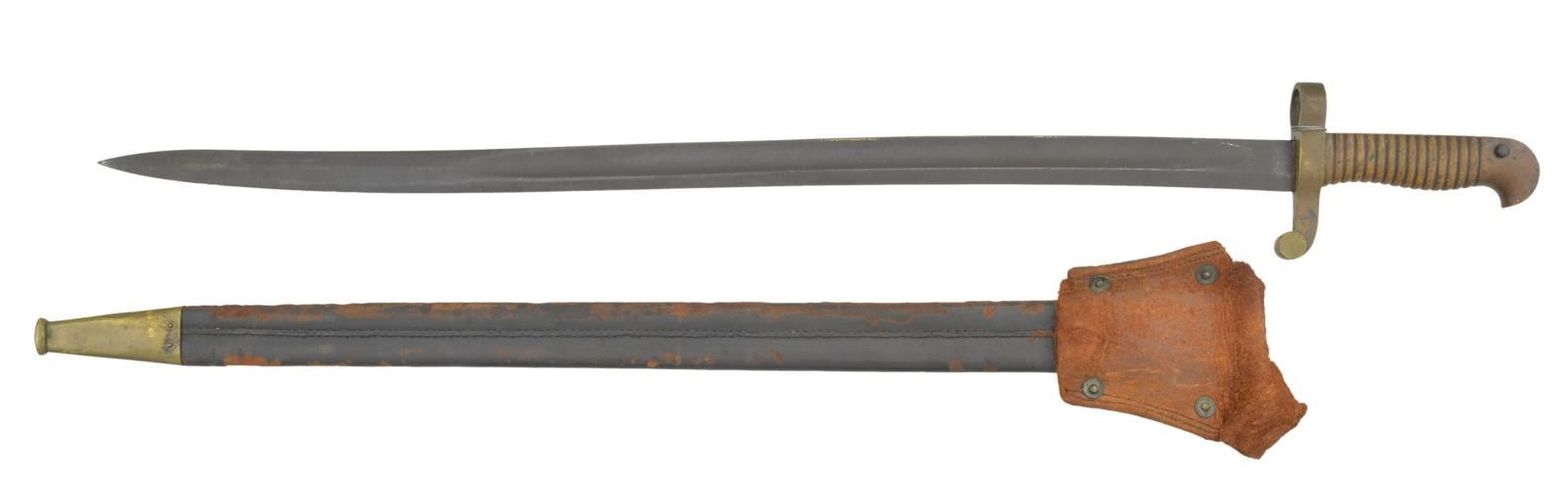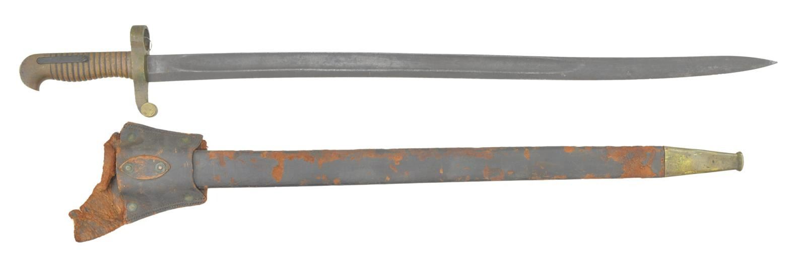 Overall: 30". Fullered 25 1/2" sword yataghan blade marked on right ricasso "SC2". Brass handle, crossguard & muzzle ring. Leather scabbard w/ frog & brass tip. CONDITION: fair worn blade w/ patina & pitting. Dark brown patina w/ some light verdigris & impact marks. Poor scabbard w/ missing portions of frog, flaking leather, cracks & flexing. (02-19307/MD). $250-350.