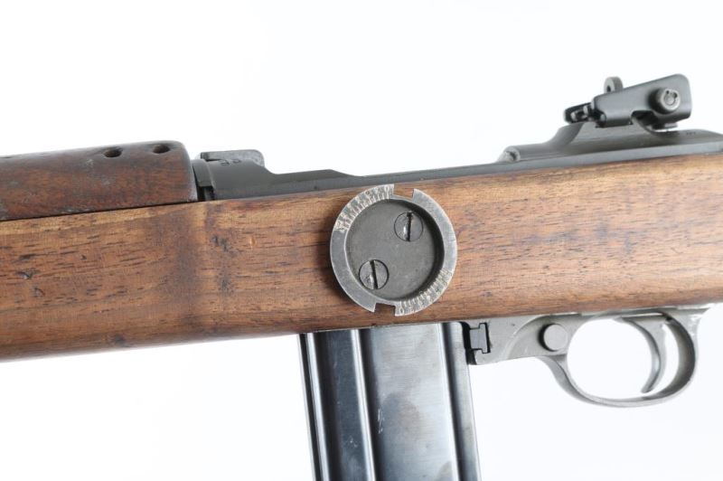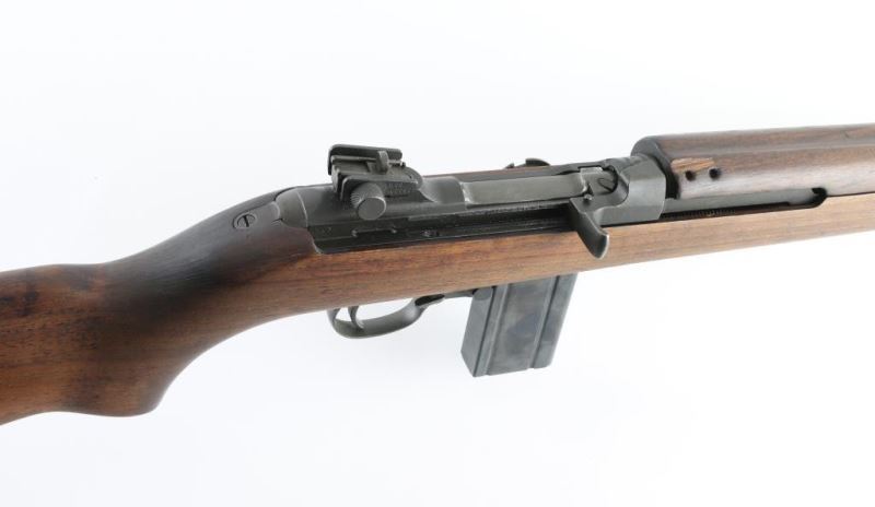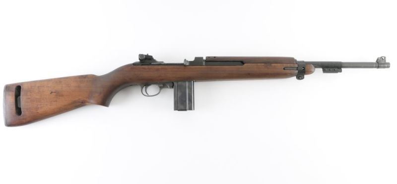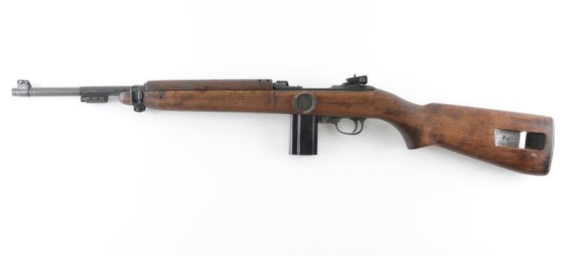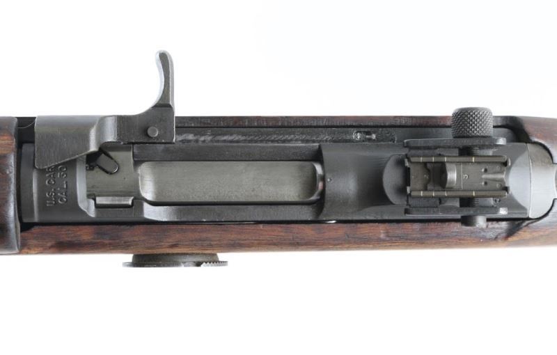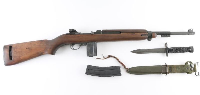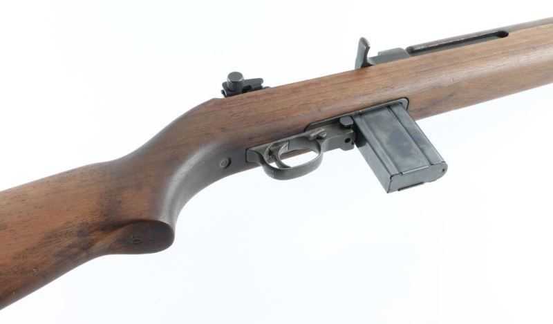 Arsenal rebuilt WWII era U.S. military magazine fed semi-automatic service rifle chambered in .30 Carbine, manufactured in Saginaw, MI circa 1944. Features a parkerized finish, undated 18" Saginaw S.G. barrel, shrouded blade front sight, stamped adjustable rear aperture sight, wide barrel band with bayonet lug, smooth trigger, rotary style safety, milled triggerguard, push button magazine release, 15 round magazine, flat bolt, unmarked recoil shield, four-rivet walnut handguard with narrow groove and birch semi-pistol grip shoulder stock with low-wood forend, oval cut oiler slot, textured metal buttplate and installed M15 grenade launcher sight mount. Includes a 30 round M2 magazine, a U.S. M4 bayonet by TMN and a U.S. M8A1 scabbard by B M Co. Markings: Rear Sight – “I.R. CO.” Barrel Band – “Q”. Trigger Guard – “Q-NL”. Hammer – “H.I.” Safety – “E.I.” Magazine – “S-C”. Magazine Catch – “M”. & Stock – “P-J”, “P” with seriffs, “RA-P” and “20”. Rifle retains approximately 90% of its parkerized finish showing scattered scratches/scuffs and slide wear on the bolt & receiver. Action is smooth, the four land bore is pristine, the markings are sharp and the wood stocks are good with wear & a small loss on the handguard. Condition is NRA Very Good+++. ***C&R Firearm***