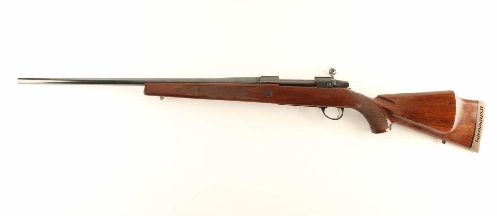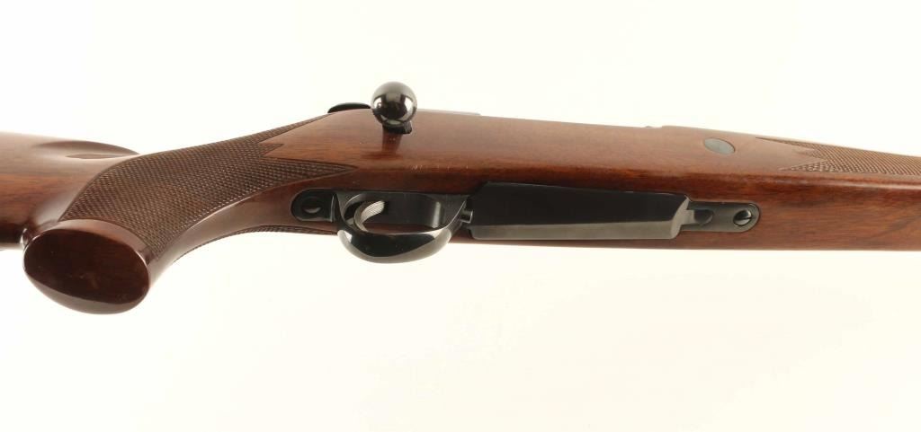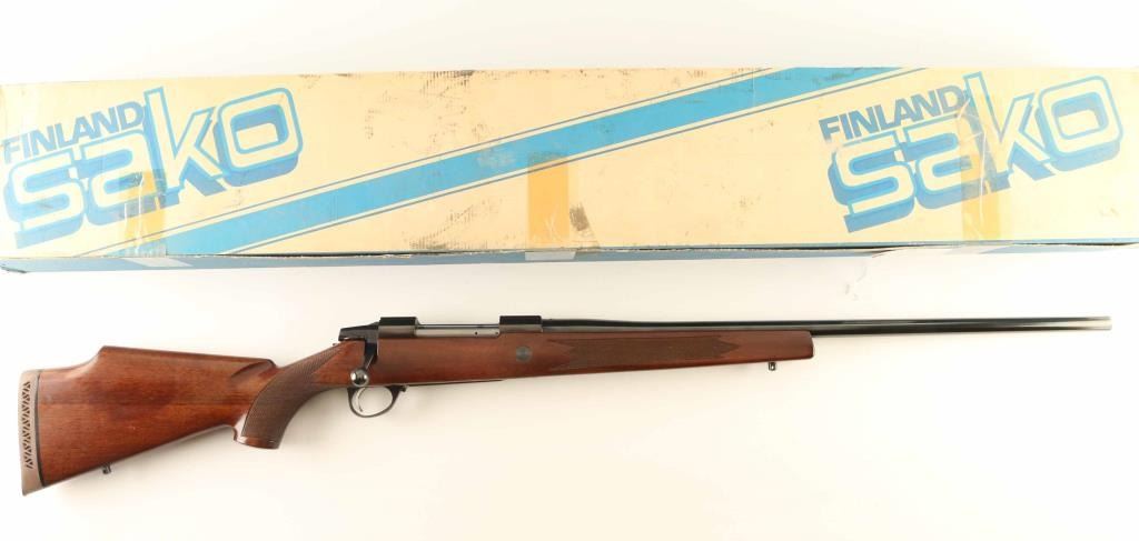 Finnish bolt action rifle (no importer marks observed) features blued finish, wood stock with checkered panels at forend and wrist, right handed cheek piece, ventilated rubber recoil pad, 24" barrel, no metallic sights, dovetailed receiver for scope mounting (no rings or scope included), manual safety, sling studs. Bore is very good condition. Overall condition is almost like new with few signs of handling, several small creases or scuffs to stock. Includes fair condition Sako styrofoam box with cardboard sleeve. Condition is NRA Excellent *** Modern Firearm ***