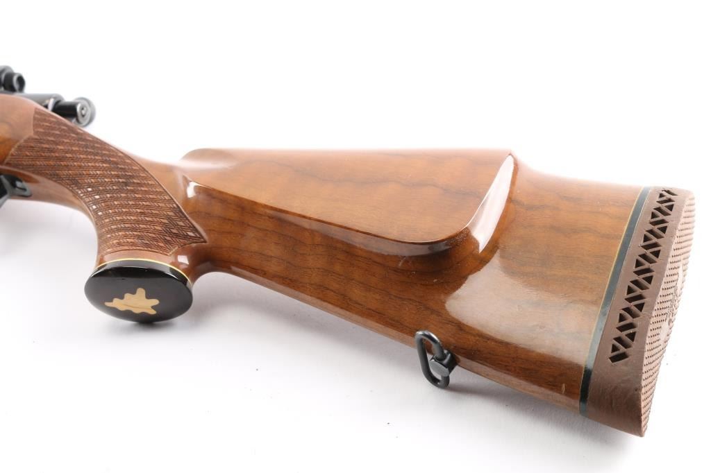Finnish bolt action rifle, manufactured circa 1968, no importer marks observed. Features blued finish, wood Monte Carlo stock with raised comb, right hand cheek piece, ventilated rubber recoil pad, checkered panels at forend & curved wrist, contrasting darker wood forend tip & grip cap (grip cap has inset tree logo in lighter color wood), sling swivels, 23" barrel, hooded ramp front sight, rear peep sight mounted on receiver bridge using the receiver dovetails, hinged floorplate, manual safety on right side of action. Engraved and silver color filled engraving of reindeer and trees on floorplate, pine needle pattern on triggerguard. Bore is very good condition. Retains 95% dark bluing with handling marks. Stock is very good condition with minor blemishes, good figure and fiddle grain visible on both sides of butt.