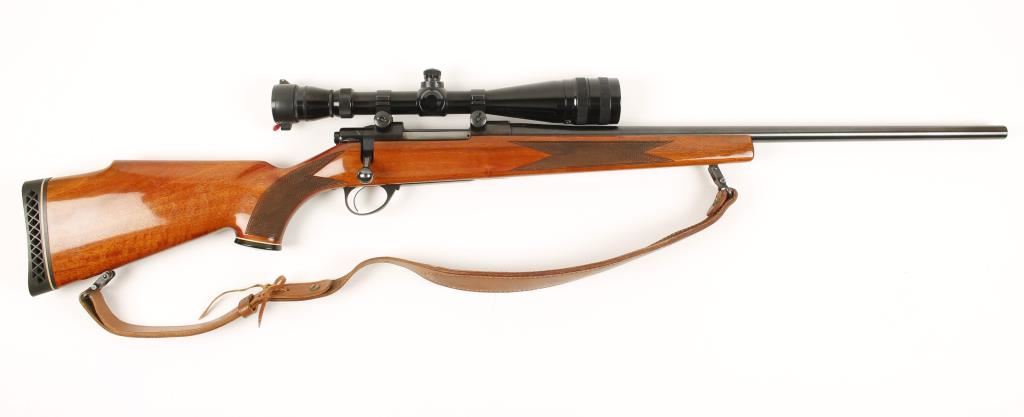 Bolt-action heavy barrel rifle. Blued 23" barrel with very nice bluing. Iron sights have been removed and plugged. Slightly-cloudy bore with good high-twist rate rifling. Checkered wood stock is in very good condition with only some very minor dings. Redfield 6-18X scope with quick focal and power adjustments and leather sling attached. Action and bolt are in excellent condition. Overall condition is Very Good to Excellent. *MODERN FIREARM