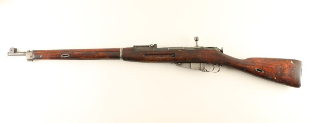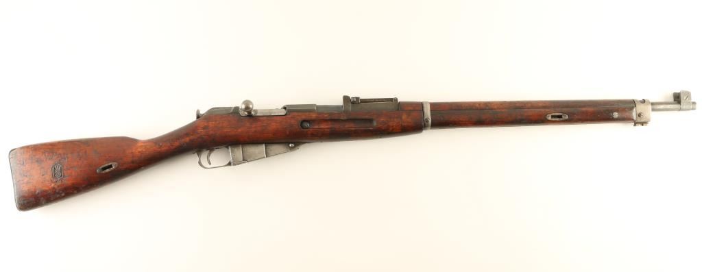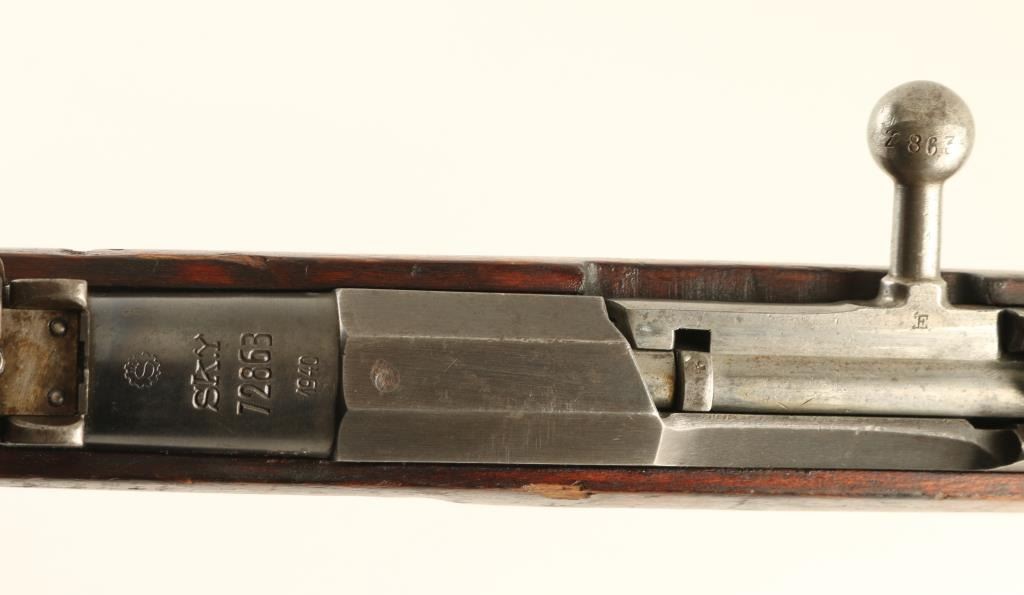 "SKY" (Suojeluskuntain Yliesikunta, or Civil Guard) marked Finnish military bolt action rifle, dated 1940, imported by Marathon, Wethersfield CT. Features blued finish, bolt assembly in the white, wood stock & handguard, 27" barrel, protected blade front sight, tangent type rear sight also flips up to serve as a ladder sight, cleaning rod missing, bayonet lug, sling slots, manual safety. Bore is slightly dark in the grooves, with strong rifling. Retains 70% blued finish, turning gray or bare metal at magazine & bands. Wood is good condition with scrapes and small gouges. Markings include: "SA", "S" inside gear logo, divot on hex receiver where Russian Imperial eagle was removed, "S" in shield stock cartouche (for SKY). Bolt matches serial number. Name carved into stock "T. PARTALA" in half inch high letters. Condition is NRA Good + *** C&R Firearm ***