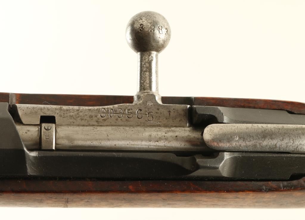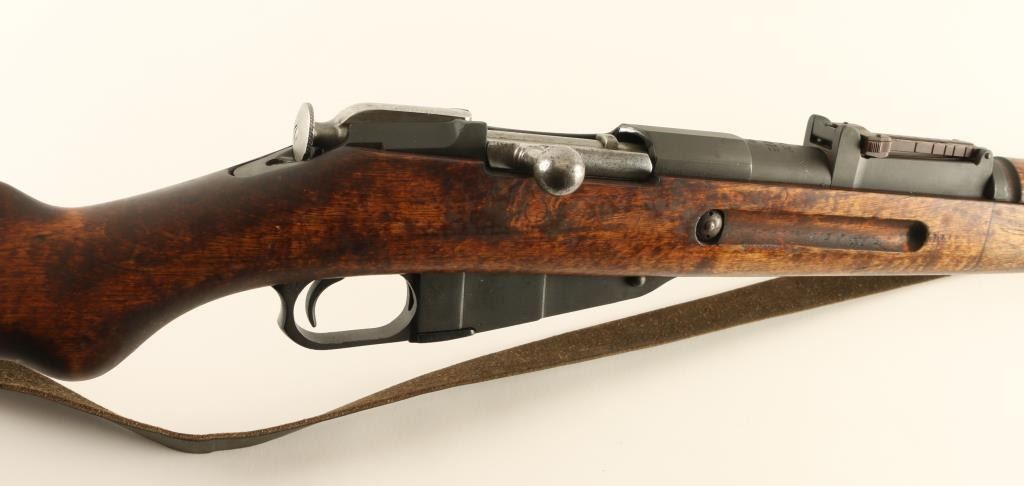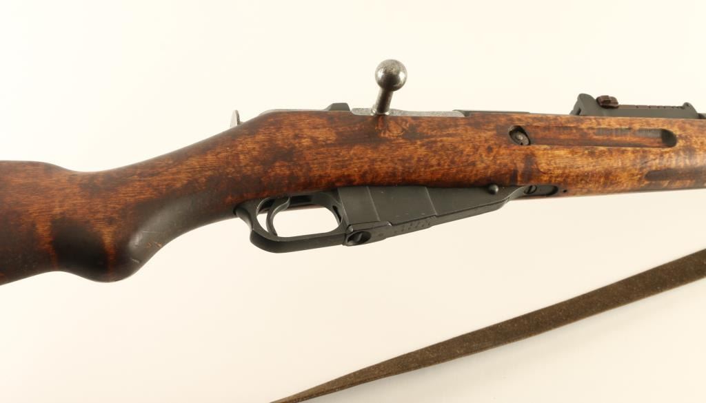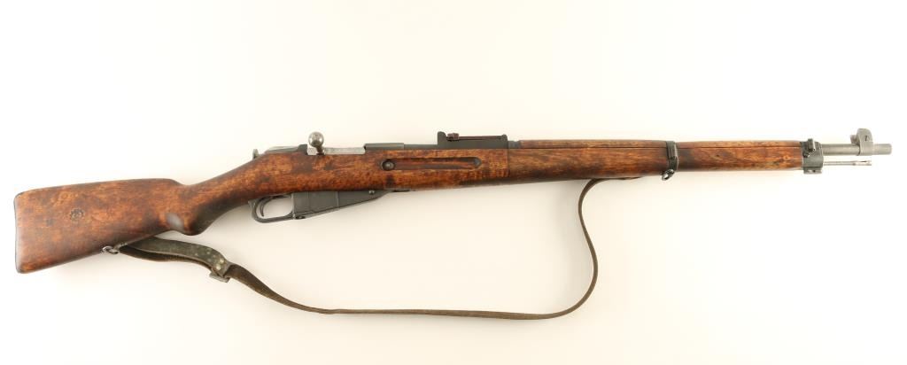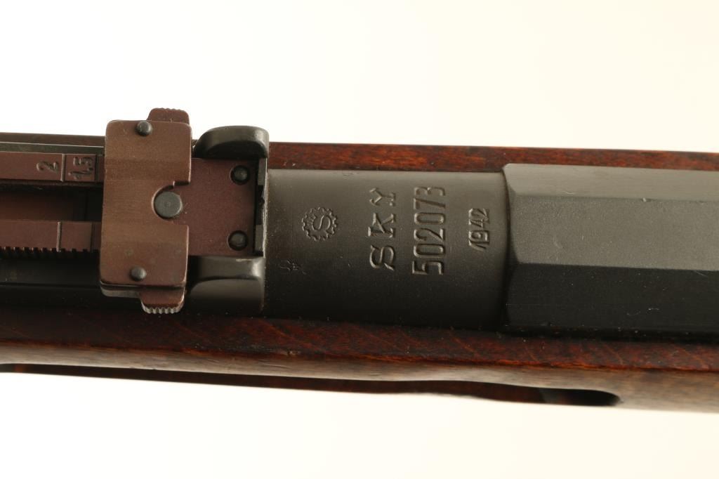 "SKY" (Suojeluskuntain Yliesikunta, or Civil Guard) marked Finnish military bolt action rifle, dated 1942, imported by CAI, ST Albans VT. Features blued finish, bolt assembly in the white, wood stock & handguard, curved grip area, 27" barrel, protected blade front sight, tangent type rear sight also flips up to serve as a ladder sight, cleaning rod, bayonet lug, side & bottom mounted sling swivels, manual safety. Bore is frosted,a bit dark, with strong rifling. Retains 90% arsenal re-blued finish, with thinning or bare metal at sharp edges, scratches and handling marks. Rear sight is a plum color. Wood is good to very good with scrapes and small gouges. Markings include: "S" with three lines (for SKY) over chamber, "S" inside gear logo at chamber & butt. Serial number repeated on barrel, mismatched bolt. Includes fair condition leather sling. Condition is NRA Good ++ *** C&R Firearm ***