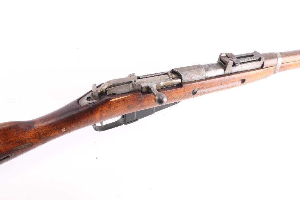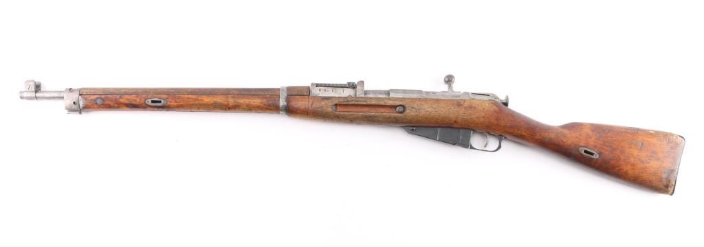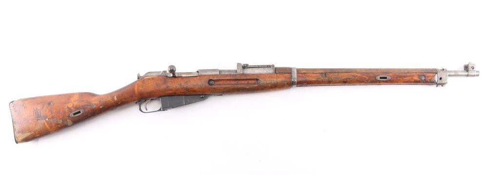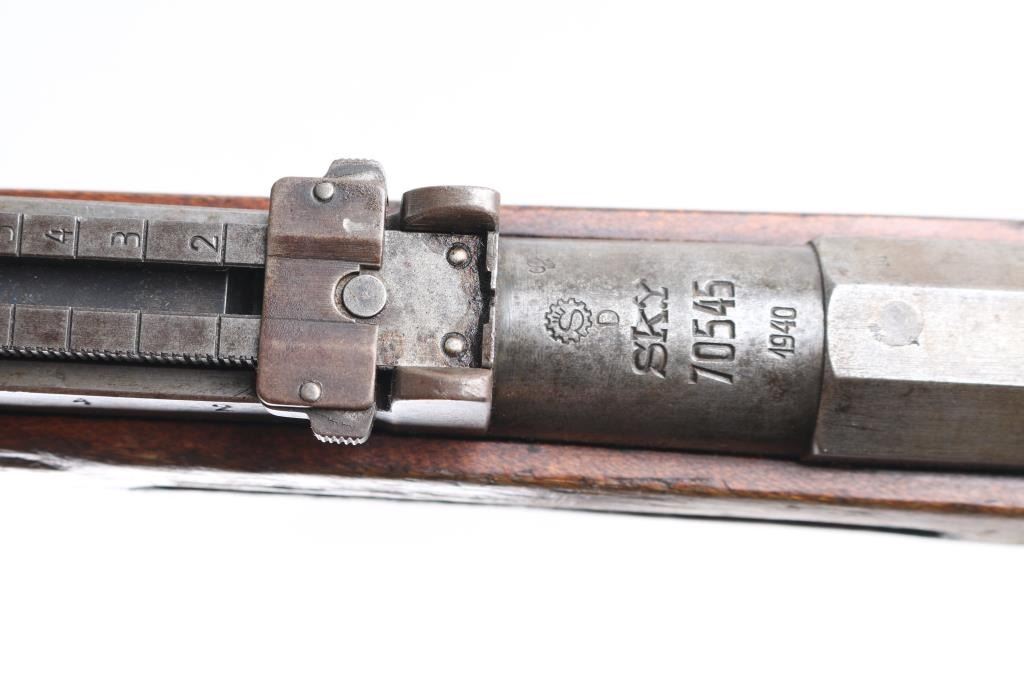 SN: 70545. "SKY" (Suojeluskuntain Yliesikunta, or Civil Guard) marked Finnish military bolt action rifle, dated 1940, imported by Marathon, Wethersfield CT. Features blued finish, bolt assembly in the white, wood stock & handguard, 27" barrel, protected blade front sight, tangent type rear sight also flips up to serve as a ladder sight, cleaning rod missing, bayonet lug, sling slots. Bore is dark in the grooves, with strong rifling. Magazine retains blue finish, but the rest of the rifle is a molted gray patina. Wood is good condition with scrapes and gouges in the right butt stock, a lot of finish loss. Markings include: "SA", "S" inside gear logo, divot on hex receiver where Russian Imperial eagle was removed, "S" in shield stock cartouche (for SKY). Mismatched bolt, front barrel band screw missing.