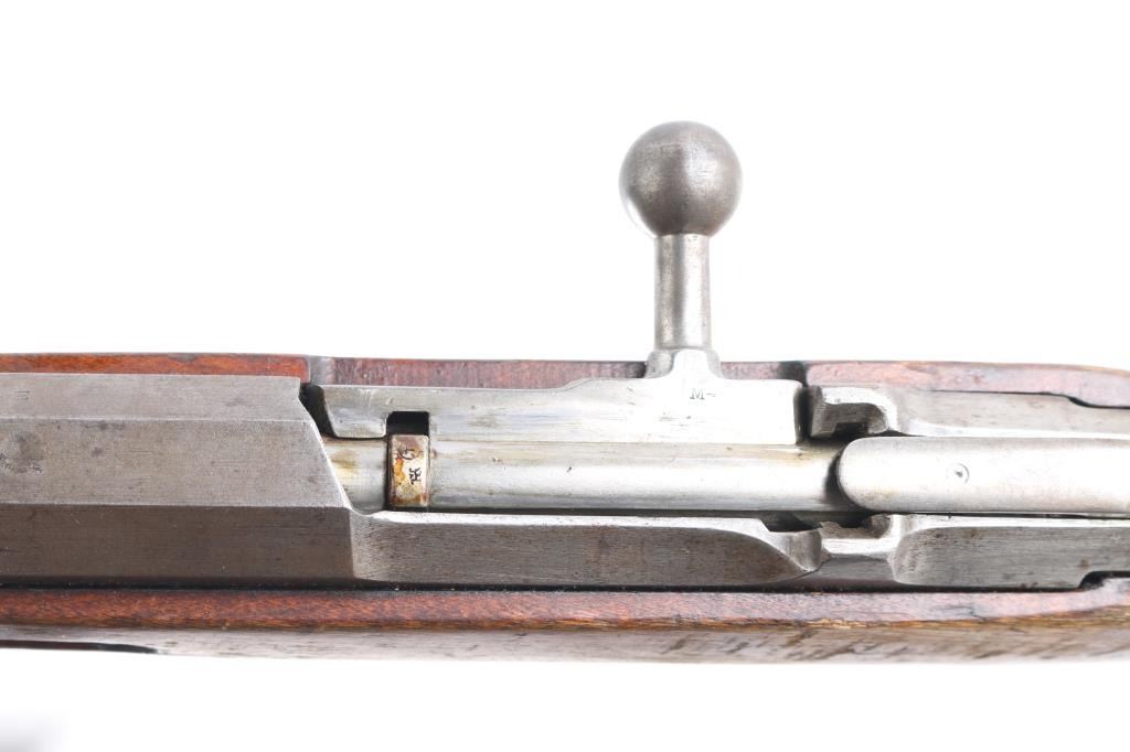 GOOD: Some minor replacement parts; metal smoothly rusted or lightly pitted in places, cleaned or re-blued; principal letters, numerals and design on metal legible; wood refinished, scratched bruised or minor cracks repaired; in good working order.