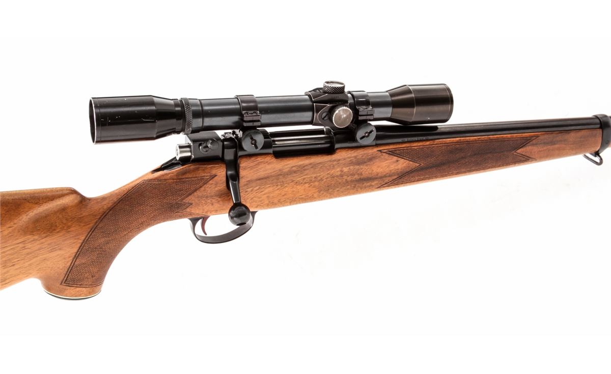 Sako Riihimiki Bolt Action Rifle, #51224, .222 cal., 20'' barrel, blue finish, full-length Mannlicher stock with cheekpiece. Topped with a 4-power Unertl Hawk scope on Sako rings. Condition is very good retaining approx. 94%+ blue. Blond stock with moderate flattening to checks at pistol grip, less pronounced at forend. Action is good, bore is very good, clear scope optics with crosshair reticules. Est.: $450-$600. (C&R)