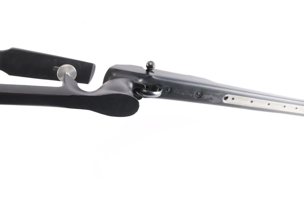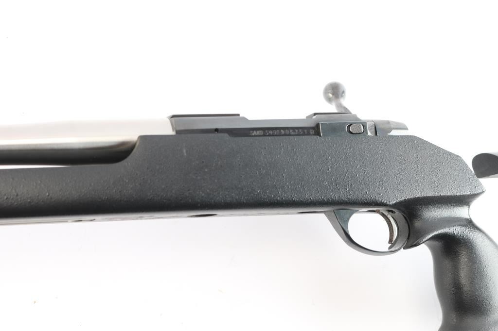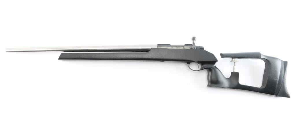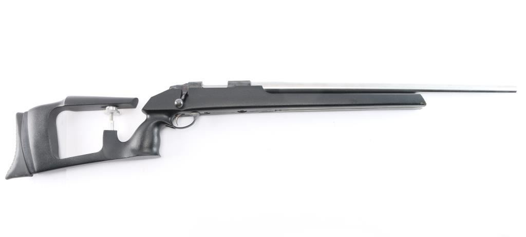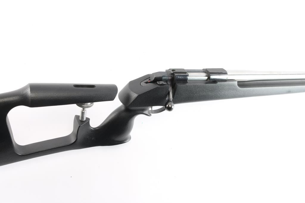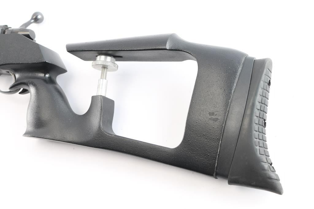 This is a custom bolt-action Sako S491 Varmint Rifle that has has been converted to a 'benchrest' target rifle by restocking and re-chambering to 6mm PPC. The 6x38 PPC is a centerfire rifle cartridge used almost exclusively for benchrest shooting. It is one of the most accurate cartridges available at distances. Rebarreled with a unmarked 24" stainless steel free floating barrel with no provisions for sights, optics ready with grooved receiver for scope mount. Manual thumb safety, red dot cocking indicator. The stock is wood with a black textured finish with adjustable comb and recoil pad, over molded grip with finger rests, 12 1/2' slotted accessory rail in the underside of forearm. Bore is excellent/bright, finishes are excellent and the stock is overall very good/sound with some finish loss on the underside of the forearm and a couple of minor scuffs to the edges.